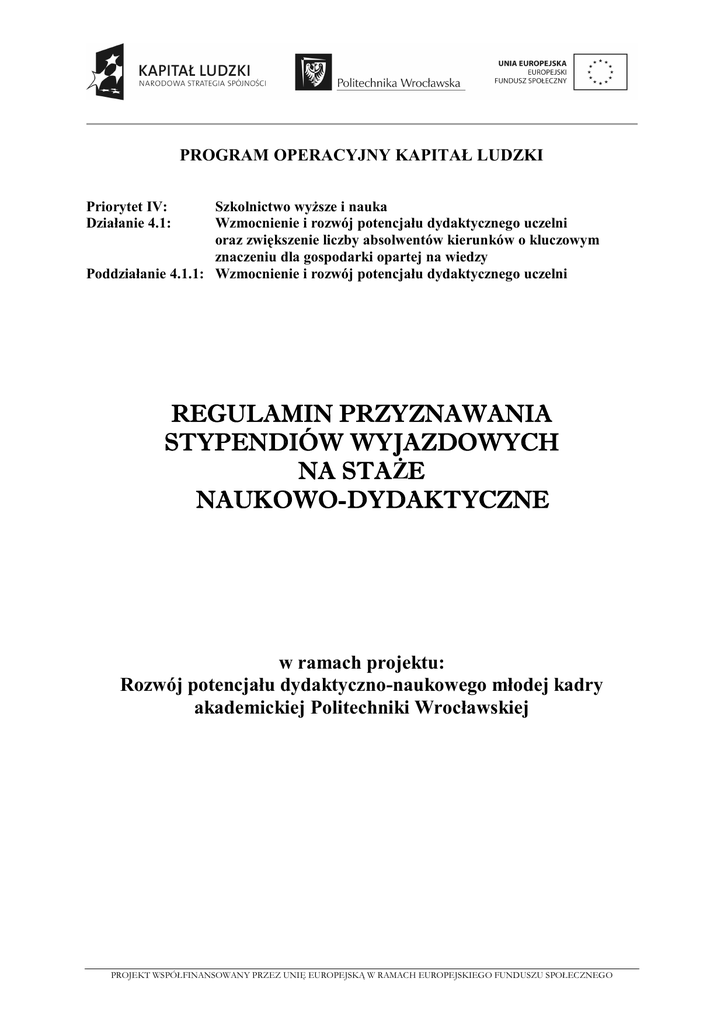 PROGRAM OPERACYJNY KAPITAŁ LUDZKI Priorytet IV: Działanie 4.1: Szkolnictwo wyższe i nauka Wzmocnienie i rozwój potencjału dydaktycznego uczelni oraz zwiększenie liczby absolwentów kierunków o kluczowym znaczeniu dla gospodarki opartej na wiedzy Poddziałanie 4.1.1: Wzmocnienie i rozwój potencjału dydaktycznego uczelni REGULAMIN PRZYZNAWANIA STYPENDIÓW WYJAZDOWYCH NA STAŻE NAUKOWO-DYDAKTYCZNE w ramach projektu: Rozwój potencjału dydaktyczno-naukowego młodej kadry akademickiej Politechniki Wrocławskiej PROJEKT WSPÓŁFINANSOWANY PRZEZ UNIĘ EUROPEJSKĄ W RAMACH EUROPEJSKIEGO FUNDUSZU SPOŁECZNEGO Strona 2 z 4 § 1. Informacje ogólne 1. W celu umożliwienia doktorantom i młodym doktorom1 aktywnego udziału w tworzeniu nowych kierunków kształcenia i badań przyznane będzie 80 stypendiów wyjazdowych na staże naukowo-dydaktyczne trwające od 1 do 6 miesięcy w najlepszych ośrodkach akademickich, dysponujących unikalnym wyposażeniem i kadrą w określonych dziedzinach. W szczególności, preferowane będą staże związane z nowymi lub modyfikowanymi kierunkami i specjalnościami anglojęzycznymi wprowadzanymi na wydziałach Politechniki Wrocławskiej. 2. Ośrodek akademicki organizujący staż naukowo-dydaktyczny (jednostka przyjmująca) zapewnia opiekuna naukowego stażysty – pracownika naukowego co najmniej ze stopniem doktora. 3. Do obowiązków opiekuna naukowego stażysty należy współudział w opracowaniu programu stażu, nadzór merytoryczny i organizacyjny w trakcie trwania stażu oraz zatwierdzenie sprawozdania z przebiegu stażu. 4. Kolejne edycje konkursu na staż naukowo-dydaktyczny zostaną przeprowadzone w każdym semestrze w latach 2009 – 2013. Zakłada się przyznanie w tym okresie 80 stypendiów na okres od 1 do 6 miesięcy. 5. W konkursie na staż naukowo-dydaktyczny mogą uczestniczyć jedynie doktoranci i młodzi doktorzy. Laureaci konkursu otrzymają stypendium wyjazdowe na pokrycie pobytu i przejazdów, na przyznany okres w wysokości od 3900 zł (w 2010 r.) do 4150 zł miesięcznie (w 2013 r.). Stypendia podlegają przepisom o podatku dochodowym od osób fizycznych oraz o systemie ubezpieczeń społecznych. 6. Laureat konkursu odbywający staż naukowo-dydaktyczny może po zakończeniu stażu występować o kolejne stypendium wyjazdowe, w tym samym lub innym ośrodku akademickim, jednakże łączny okres, na który mogą zostać przyznane stypendia wyjazdowe jednej osobie, nie może przekroczyć 6 miesięcy. 1 Młody doktor – osoba posiadająca stopień doktora nie dłużej niż 5 lat, która nie ukończyła 35 roku życia przed terminem planowanego zakończenia udziału w Projekcie i jest zatrudniona w Uczelni. Strona 3 z 4 § 2. Rekrutacja uczestników stypendium stażowego 1. Doktorant lub młody doktor może otrzymać stypendium wyjazdowe na wniosek, który zawiera m.in.: a) nazwę ośrodka akademickiego oraz informacje o jego unikatowym wyposażeniu, kadrze i działalności naukowo-dydaktycznej, w zakresie której zainteresowany jest kandydat; b) wstępne uzgodnienia precyzujące tematykę i program stażu oraz termin odbycia stażu; c) dane dotyczące przewodu doktorskiego; d) krótką informację o opiekunie naukowym w miejscu odbywania stażu i jego dane adresowe; e) prezentację wyróżniającej się aktywności naukowej i dydaktycznej kandydata oraz jego osiągnięć; f) naukowo-dydaktyczny plan stażu zredagowany wspólnie z opiekunem naukowym ze strony przyjmującej oraz promotorem (opiekunem naukowym); g) poparcie opiekuna naukowego (promotora) i kierownika studiów doktoranckich oraz opinie dotyczącą m.in. powiązania tematyki stażu z planami Wydziału osoby odpowiedzialnej za długoterminowe planowanie działalności dydaktycznej w danej jednostce względnie kierownika przygotowywanej specjalności anglojęzycznej. 2. Składane wnioski poddawane będą anonimowej ocenie recenzentów – specjalistów w dziedzinach reprezentowanych przez aplikantów – oceniających merytoryczną wartość składanych aplikacji stażowych. 3. W kolejnych edycjach konkursu na stypendium stażowe powoływane są czteroosobowe komisje konkursowe. Poszczególnym komisjom konkursowym przewodniczy Koordynator Projektu, albo na jego wniosek Konsultant ds. Organizacyjno-Prawnych Projektu. Przewodniczący Komisji dobiera do składu komisji 2 osoby z grona dziekanów, prodziekanów i kierowników studiów doktoranckich. 4. Komisja konkursowa dokonuje wyboru laureatów danej edycji konkursu na podstawie oceny złożonych wniosków przy uwzględnieniu anonimowej oceny recenzentów. W przypadku osób występujących o kolejne stypendium wyjazdowe, Komisja uwzględnia także ocenę z przebiegu poprzedniego stażu. Strona 4 z 4 5. Laureat konkursu otrzymuje stypendium wyjazdowe finansowanie w ramach Projektu na podstawie umowy stypendialnej zawartej z Politechniką Wrocławską reprezentowaną przez Koordynatora. Warunkiem otrzymania stypendium jest podpisanie umowy przez obie strony. 6. Laureat konkursu w terminie jednego miesiąca przed zaplanowaną datą rozpoczęcia stażu, składa w Biurze Projektu: a) kopię uzgodnienia terminu stażu zawartego z jednostką przyjmującą stażystę; b) umowę z opiekunem naukowym stażysty w jednostce przyjmującej podpisaną przez opiekuna – 3 egz. §3. Obowiązki laureata stypendium stażowego. 1. W terminie 14 dni od dnia zakończenia stażu stypendysta składa w Biurze Projektu sprawozdanie z przebiegu stażu, zatwierdzone przez opiekuna naukowego stażysty w jednostce przyjmującej oraz promotora/opiekuna naukowego. 2. Niedostarczenie sprawozdania w wymaganym terminie może powodować utratę możliwości otrzymania kolejnego stypendium wyjazdowego, jak również stypendium naukowego. 3. Stypendysta zobowiązany jest ponadto do dotrzymania terminów wyznaczonych przez Biuro Projektu w odniesieniu do dostarczenia wymaganej dokumentacji. 4. Stypendysta ma obowiązek do umieszczania w publikacjach, i innych 