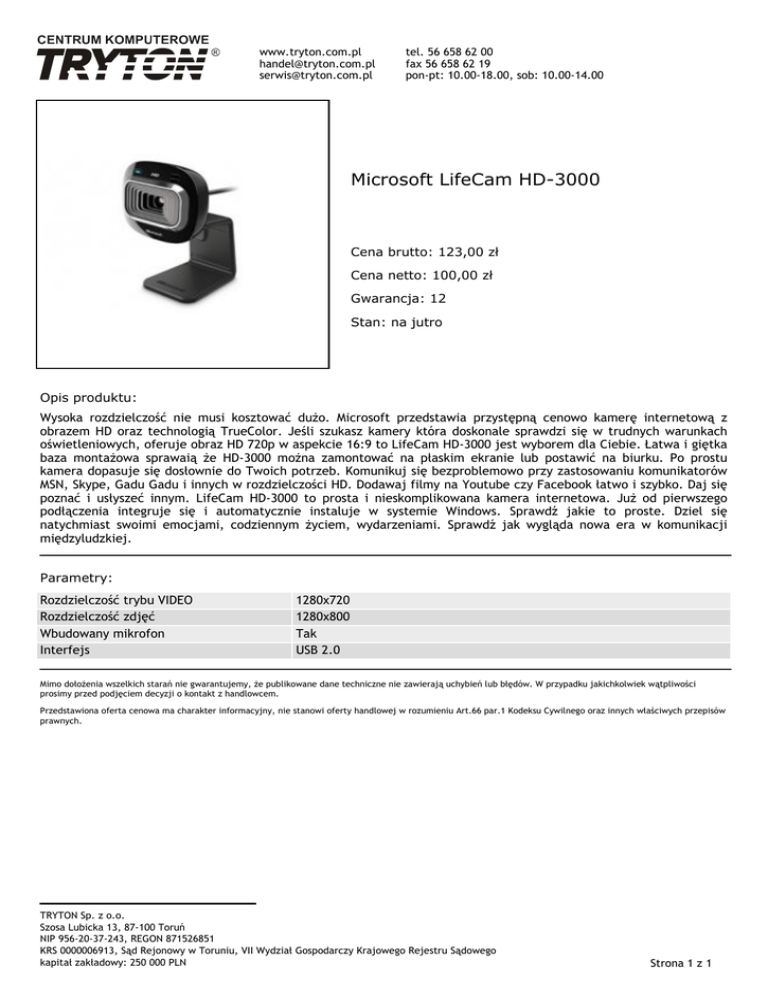 www.tryton.com.pl [email protected] [email protected] tel. 56 658 62 00 fax 56 658 62 19 pon-pt: 10.00-18.00, sob: 10.00-14.00 Microsoft LifeCam HD-3000 Cena brutto: 123,00 zł Cena netto: 100,00 zł Gwarancja: 12 Stan: na jutro Opis produktu: Wysoka rozdzielczość nie musi kosztować dużo. Microsoft przedstawia przystępną cenowo kamerę internetową z obrazem HD oraz technologią TrueColor. Jeśli szukasz kamery która doskonale sprawdzi się w trudnych warunkach oświetleniowych, oferuje obraz HD 720p w aspekcie 16:9 to LifeCam HD-3000 jest wyborem dla Ciebie. Łatwa i giętka baza montażowa sprawaią że HD-3000 można zamontować na płaskim ekranie lub postawić na biurku. Po prostu kamera dopasuje się dosłownie do Twoich potrzeb. Komunikuj się bezproblemowo przy zastosowaniu komunikatorów MSN, Skype, Gadu Gadu i innych w rozdzielczości HD. Dodawaj filmy na Youtube czy Facebook łatwo i szybko. Daj się poznać i usłyszeć innym. LifeCam HD-3000 to prosta i nieskomplikowana kamera internetowa. Już od pierwszego podłączenia integruje się i automatycznie instaluje w systemie Windows. Sprawdź jakie to proste. Dziel się natychmiast swoimi emocjami, codziennym życiem, wydarzeniami. Sprawdź jak wygląda nowa era w komunikacji międzyludzkiej. Parametry: Rozdzielczość trybu VIDEO Rozdzielczość zdjęć Wbudowany mikrofon Interfejs 1280x720 1280x800 Tak USB 2.0 Mimo dołożenia wszelkich starań nie gwarantujemy, że publikowane dane techniczne nie zawierają uchybień lub błędów. W przypadku jakichkolwiek wątpliwości prosimy przed podjęciem decyzji o kontakt z handlowcem. Przedstawiona oferta cenowa ma charakter informacyjny, nie stanowi oferty handlowej w rozumieniu Art.66 par.1 Kodeksu Cywilnego oraz innych właściwych przepisów prawnych. TRYTON Sp. z o.o. Szosa Lubicka 13, 87-100 Toruń NIP 956-20-37-243, REGON 871526851 KRS 0000006913, Sąd Rejonowy w Toruniu, VII Wydział Gospodarczy Krajowego Rejestru Sądowego kapitał zakładowy: 250 000 PLN Strona 1 z 1