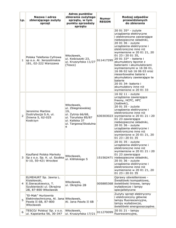 Lp. Nazwa i adres zbierającego zużyty sprzęt Adres punktów zbierania zużytego sprzętu, w tym punktu sprzedaży sprzętu Numer REGON Rodzaj odpadów przewidzianych do zbierania Polska Telefonia Cyfrowa 1 sp o.o. Al. Jerozolimskie 181, 02-222 Warszawa 20 01 35* - zużyte urządzenia elektryczne i elektroniczne zawierające niebezpieczne składniki, 20 01 36 - zużyte urządzenia elektryczne i elektroniczne inne niż wymienione w 20 01 21, 20 01 23 i 20 01 35, Włocławek, 20 01 33* - baterie i ul. Kościuszki 23, 011417295 akumulatory łącznie z ul. Kruszyńska 11/27 (Tesco) bateriami i akumulatorami wymienionymi w 16 06 01, 16 06 02 lub 16 06 03 oraz niesortowalne baterie i akumulatory zawierające te baterie 20 01 34- baterie i akumulatory inne niż wymienione w 20 01 33 Jeronimo Martins Dystrybucja S.A, ul. 2 Żniwna 5, 62-025 Kostrzyn 16 02 11 - zużyte urządzenia zawierające freony, HCFC, HFC (lodówki), Włocławek, 20 01 35 - zużyte ul. Zbiegniewskiej urządzenia elektryczne i 19, elektroniczne inne niż ul. Żytnia 66/68, 630303023 wymienione w 20 01 21 i 20 ul. Toruńska 85/87 01 23 zawierające ul. Kaliska 37 niebezpieczne składniki, ul. Targowa/Stodulna 20 01 36 - zużyte 4 urządzenia elektryczne i elektroniczne inne niż wymienione w 20 01 21, 20 01 23 i 20 01 35 Kaufland Polska Markety Włocławek, 3 Sp z o.o. Sp. K. ul. Szybka ul. Kilińskiego 5 6-10, 50-421 Wrocław 20 01 35 - zużyte urządzenia elektryczne i elektroniczne inne niż wymienione w 20 01 21 i 20 01 23 zawierające 151562471 niebezpieczne składniki, 20 01 36 - zużyte urządzenia elektryczne i elektroniczne inne niż wymienione w 20 01 21, 20 01 23 i 20 01 35 ELMEHURT Sp. Jawna L. Kisielewski, 4 E.Sieraczkiewicz, T. Szybieniecki ul. Okrężna 2B, 87-800 Włocławek Oprawy oświetleniowe Świetlówki kompaktowe, 005885368 świetlówki liniowe, lampy wyładowcze i lampy specjalistyczne Włocławek, ul. Okrężna 2B "El-Mak" Hurtownia Elektrotechniczna, Al. Jana Włocławek, 5 Pawła II 6B, 87-800 Al. Jana Pawła II 6B Włocławek 6 . Zużyty sprzęt elektryczny i elektroniczny głównie lampy fluorescencyjne, lampy wyładowcze, świetlówki energooszczędne. TESCO/ Polska/ Sp. z o.o. Włocławek, 20 01 21 - lampy 011270099 ul. Kapelanka 56, 30-347 ul. Kruszyńska 17/21 fluorescencyjne, Kraków 20 01 23 - urządzenia zawierające freony, 20 01 35 - zużyte urządzenia elektryczne i elektroniczne inne niż wymienione w 20 01 21 i 20 01 23 zawierające niebezpieczne składniki, 20 01 36 - zużyte urządzenia elektryczne i elektroniczne inne niż wymienione w 20 01 21, 20 01 23 i 20 01 35 "Real,- Sp z o.o. i Spółka" spółka komandytowa, Al. Włocławek, 7 Krakowska 61, 02-183 ul. Cmentarna 10 Warszawa 013233702 Zużyty sprzęt elektryczny i elektroniczny . Wielkogabarytowe urządzenia gospodarstwa domowego, Narzędzia elektryczne i elektroniczne z wyjątkiem wielkogabarytowych stacjonarnych narzędzi pneumatycznych 910151938 Zużyty sprzęt elektryczny i elektroniczny Włocławek PHU HAWEX Salon Meblowy ul. Toruńska 104 . Zużyty sprzęt Zakład Energetyczny Toruń Energohandel sp. z Włocławek, 11 o.o. ul. Wschodnia 36, 87- ul. Duninowska 8 100 Toruń . Zużyty sprzęt elektryczny i elektroniczny "ART-DOM" M. M. Zielińscy, Spółka Jawna, 12 ul. Kasprzaka 3, 91-078 Łódź Włocławek, ul. Witosa 5 Zużyty sprzęt elektryczny i elektroniczny (sprzedaż hurtowa i detaliczna artykułów użytku domowego 470589780 i osobistego oraz mebli, jak również sprzedaż maszyn, sprzętu i dodatkowego wyposażenia) EURO-net Sp. z o.o. ul. 13 Muszkieterów 15, 02-273 Warszawa Włocławek, ul. Pułaskiego 16 . Zużyty sprzęt elektryczny i elektroniczny "MGL METRO Group Logistics Polska Sp. z o.o. i Spółka " Spółka Włocławek, 14 Komandytowa, Al. ul. Cmentarna 10 Krakowska 61, 02-183 Warszawa 017258389 Zużyty sprzęt elektryczny i elektroniczny Przedsiębiorstwo Zaopatrzeniowe Mors Sp. Włocławek, 15 z o.o. ul. Hutnicza 35, 81- ul. Witosa 5 038 Gdynia . Zużyty sprzęt elektryczny i elektroniczny 16 APTEKA "ZŁOTA" Sp. j. 910129904 Zużyty sprzęt elektryczny BIMEX-MICHELIN HurtDetal Art. Przem. Jerzy 8 Wasilewski, ul. Falbanaka 14, 87-800 Włocławek Włocławek, ul. Falbanka 14 P.P.U.H. "BROMET" Piotr Brodecki i Barbara Włocławek, 9 Brodecka - Spółka Jawna, ul. Zduńska 9, ul. Zduńska 9, 87-800 ul. Wojskowa 3B Włocławek Przedsiębiorstwo Handlowo - Usługowe 10 Wiesław Chrzanowski, ul. Radziejowska 4a, 87-890 Lubraniec Włocławek, Anna Grzelak, Zbigniew ul. Zielony Rynek 4 Grzelak, ul. Zielony Rynek 4, 87-800 Włocławek i elektroniczny Włocławek, ul. Chopina 59 20 01 36 - zużyte urządzenia elektryczne i 012100784 elektroniczne inne niż wymienione w 20 01 21, 20 01 23 i 20 01 35 McDonald's Polska Sp. z 18 o.o. ul. Domaniewska 41, 02-672 Warszawa Włocławek, ul. Witosa 2 20 01 35 - zużyte urządzenia elektryczne i elektroniczne inne niż wymienione w 20 01 21 i 20 01 23 zawierające 012050075 niebezpieczne składniki, 20 01 36 - zużyte urządzenia elektryczne i elektroniczne inne niż wymienione w 20 01 21, 20 01 23 i 20 01 35 KONED Spółka z o.o. ul. 19 Łęgska 3 A, 87-800 Włocławek Włocławek, ul. Łęgska 3A Elektryczne urządzenia 910931352 grzejne, czujniki, regulatory ciepła, termostaty IZMAR Sp. z o.o. ul. 20 Marszałkowska 138, 00004 Warszawa Włocławek, ul. Cmentarna 10 20 01 35 - zużyte urządzenia elektryczne i elektroniczne inne niż wymienione w 20 01 21 i 20 01 23 zawierające 010386457 niebezpieczne składniki, 20 01 36 - zużyte urządzenia elektryczne i elektroniczne inne niż wymienione w 20 01 21, 20 01 23 i 20 01 35 EMPiK Sp. z o.o. ul. 21 Marszałkowska 116/122, 00-017 Warszawa Włocławek, ul. Pułaskiego 14 011518197 Zużyty sprzęt elektryczny i elektroniczny ART.-DOM R. Brania, R. Włocławek, 22 Majchrzak Sp. J. ul. ul. Dziewińska 15 Kujawska 1, 87-100 Toruń . Zużyty sprzęt elektryczny i elektroniczny Domator Sp. z o.o. ul. 23 Spółdzielców 5, 62-