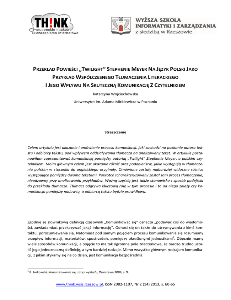 PRZEKŁAD POWIEŚCI „TWILIGHT” STEPHENIE MEYER NA JĘZYK POLSKI JAKO PRZYKŁAD WSPÓŁCZESNEGO TŁUMACZENIA LITERACKIEGO I JEGO WPŁYWU NA SKUTECZNĄ KOMUNIKACJĘ Z CZYTELNIKIEM Katarzyna Wojciechowska Uniwersytet im. Adama Mickiewicza w Poznaniu Streszczenie Celem artykułu jest ukazanie i omówienie procesu komunikacji, jaki zachodzi na poziomie autora tekstu i odbiorcy tekstu, pod wpływem oddziaływania tłumacza na analizowany tekst. W artykule postanowiłam zaprezentować komunikację pomiędzy autorką „Twilight” Stephenie Meyer, a polskim czytelnikiem. Moim głównym celem jest ukazanie różnić oraz podobieństw, jakie występują w tłumaczeniu polskim w stosunku do angielskiego oryginały. Omówione zostały najbardziej widoczne różnice występujące pomiędzy dwoma tekstami. Pokrótce scharakteryzowany został sam proces tłumaczenia, nieodzowny przy analizowaniu przykładów. Ważną częścią jest także stanowisko i sposób podejścia do przekładu tłumacza. Tłumacz odgrywa kluczową rolę w tym procesie i to od niego zależy czy komunikacja pomiędzy nadawcą, a odbiorcą tekstu będzie prawidłowa. Zgodnie ze słownikową definicją czasownik „komunikować się” oznacza „podawać coś do wiadomości, zawiadamiać, przekazywać jakąś informację”. Odnosi się on także do utrzymywania z kimś kontaktu, porozumiewania się. Natomiast pod samym pojęciem procesu komunikowania się rozumiemy przepływ informacji, materiałów, spostrzeżeń, pomiędzy określonymi jednostkami1. Obecnie mamy wiele sposobów komunikacji, a pojęcie to ma tak ogromne pole znaczeniowe, że bardzo trudno ustalić jego jednoznaczną definicję, a tym bardziej rodzaje. Mimo wszystko głównym rodzajem komunikacji, z jakim stykamy się na co dzień, jest komunikacja bezpośrednia. 1 R. Jurkowski, Komunikowanie się, zarys wykładu, Warszawa 2004, s. 9. www.think.wsiz.rzeszow.pl, ISSN 2082-1107, Nr 2 (14) 2013, s. 60-65 Przekład powieści „Twiligh” Stephenie Meyer na język polski jako przykład współczesnego tłumaczenia literackiego i jego wpływu na skuteczną komunikację z czytelnikiem Nie jesteśmy jednak świadomi, iż przeciwstawna do niej komunikacja pośrednia stanowi równie ważny aspekt naszego codziennego porozumiewania i sposobu odbierania informacji. I waśnie jednym z rodzajów komunikacji niebezpośredniej jest przekład tekstu, czy inaczej mówiąc tłumaczenie. Za jego pośrednictwem autor danego tekstu bazowego, posługujący się jednym z wielu istniejących obecnie języków, komunikuje się z odbiorca tekstu, czyli jego czytelnikiem2. Dlatego też celem poniższego artykuły jest przestawienie komunikacji, do jakiej doszło pomiędzy autorką powieści „Twilight” Stephenie Meyer, a polskim czytelnikiem. Warto na samym początku zaznaczyć, iż współcześnie nie mamy jednej, dokładnej definicji tłumaczenia, zarówno w sensie samej jego operacji, jak i jego rezultatu. Jedną z najbardziej aktualnych definicji przedstawia Teresa Tomaszkiewicz, która pojęcie tłumaczenia wyjaśnia następująco: „Operacja transferu międzyjęzykowego, która polega na zinterpretowaniu sensu tekstu wyjściowego i na zredagowaniu tekstu docelowego, na podstawie ustanowionych relacji ekwiwalencji między dwoma tekstami, zgodnie z parametrami aktu komunikacji i ograniczeniami systemowym, narzuconymi tłumaczowi”3. Oprócz samego zagadnienia jakim jest przekład, należy zatrzymać się także przy innym, bez którego akcja ta nie byłaby możliwa. Jest to pojęcie ekwiwalencji znaczeniowej w tłumaczeniach. Bez istnienia ekwiwalencji znaczeniowych pomiędzy poszczególnymi elementami języka, komunikat założony przez autora danego tekstu nigdy by nie zaistniał. Świadczy o tym fakt, iż już najwcześniej zorientowane rozważania nad przekładem oscylowały wokół zagadnienia poziomu ekwiwalencji pomiędzy tekstem przekładu, a tekstem oryginału oraz ich wzajemnego wpływu na zakodowany komunikat4. Najogólniejsza z definicji mówi, że pojęcie to oznacza związek, jaki zachodzi pomiędzy tekstem oryginału, a odpowiednio dobranym tekstem przekładu, przy czym charakter tego związku jest kwestią różnych interpretacji5. Warto się również zastanowić, jakie rodzaje przekładu istnieją. W dotychczasowych badaniach nad przekładem ani traduktologia, ani językoznawstwo stosowane nie zdołały przeprowadzić naukowej klasyfikacji różnych typów, postaci czy rodzajów przekładu. Wyznacznikiem interesującego nas rodzaju przekładu – dzieła literackiego – jest płynność norm estetycznych ukształtowanych przez poszczególne społeczności, grupy kulturowe i epokowe. Sprawia to w konsekwencji, iż sam proces tłumaczenia jest nierozłącznie związany z właściwą recepcją i interpretacją oryginału. Przekład literacki należy postrzegać nie tylko jako rezultat kultury docelowej i języka, lecz należy rozpatrywać go w ścisłym powiązaniu z dziełem wyjściowym i jego działaniem w kulturze języka oryginału6. Zatem, aby nastąpił prawidłowy proces komunikacji pomiędzy nadawcą, a odbiorcą tłumaczenia konieczny jest przekład naturalny, odpowiednio dostosowany do wyznaczników charakterystycznych, właściwych dla danej zbiorowości, która prawidłowo odczyta przekład, czyli zawartą w tekście informację. W konsekwencji, podczas przekładu dzieła literackiego, tłumacz musi zwrócić uwagę na kluczowe elementy strukturalne procesu tłumaczenia. Jest to poetyka i estetyka gatunku w kulturze i języku przekładu, recepcja i percepcja przełożonego dzieła, poetyka dzieła oryginału i normy estetyczne oraz kwestia dzieła oryginału, jako tworu epoki i jego recepcja. Niezwykle istotną kwestią w każdym z wy2 K. Adams, G. J. Galanes, Komunikacja w grupach, Warszawa 2008, s. 63. T. Tomaszkiewicz, Terminologia tłumaczenia. Przekład i adaptacja, Poznań 2006, s. 101. 4 A. Pisarska, T. Tomaszkiewicz, Współczesne tendencje
