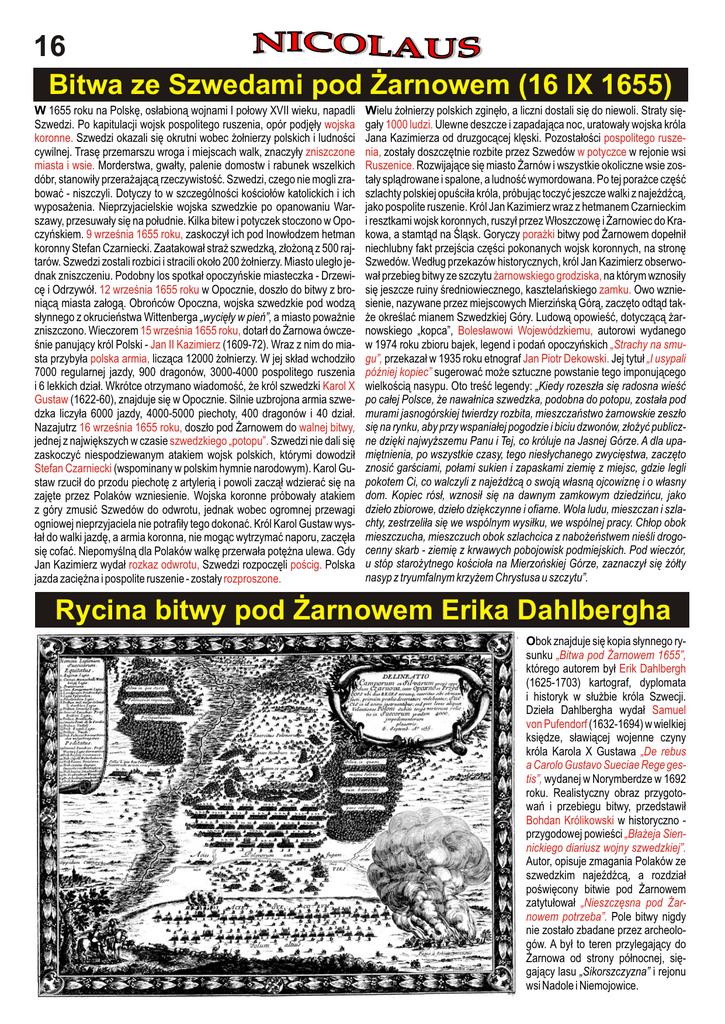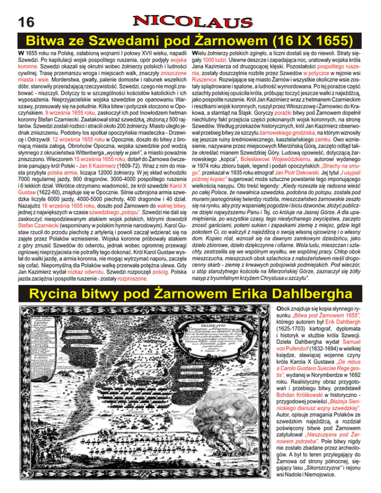 16 Bitwa ze Szwedami pod Żarnowem (16 IX 1655) W 1655 roku na Polskę, osłabioną wojnami I połowy XVII wieku, napadli Szwedzi. Po kapitulacji wojsk pospolitego ruszenia, opór podjęły wojska koronne. Szwedzi okazali się okrutni wobec żołnierzy polskich i ludności cywilnej. Trasę przemarszu wroga i miejscach walk, znaczyły zniszczone miasta i wsie. Morderstwa, gwałty, palenie domostw i rabunek wszelkich dóbr, stanowiły przerażającą rzeczywistość. Szwedzi, czego nie mogli zrabować - niszczyli. Dotyczy to w szczególności kościołów katolickich i ich wyposażenia. Nieprzyjacielskie wojska szwedzkie po opanowaniu Warszawy, przesuwały się na południe. Kilka bitew i potyczek stoczono w Opoczyńskiem. 9 września 1655 roku, zaskoczył ich pod Inowłodzem hetman koronny Stefan Czarniecki. Zaatakował straż szwedzką, złożoną z 500 rajtarów. Szwedzi zostali rozbici i stracili około 200 żołnierzy. Miasto uległo jednak zniszczeniu. Podobny los spotkał opoczyńskie miasteczka - Drzewicę i Odrzywół. 12 września 1655 roku w Opocznie, doszło do bitwy z broniącą miasta załogą. Obrońców Opoczna, wojska szwedzkie pod wodzą słynnego z okrucieństwa Wittenberga „wycięły w pień”, a miasto poważnie zniszczono. Wieczorem 15 września 1655 roku, dotarł do Żarnowa ówcześnie panujący król Polski - Jan II Kazimierz (1609-72). Wraz z nim do miasta przybyła polska armia, licząca 12000 żołnierzy. W jej skład wchodziło 7000 regularnej jazdy, 900 dragonów, 3000-4000 pospolitego ruszenia i 6 lekkich dział. Wkrótce otrzymano wiadomość, że król szwedzki Karol X Gustaw (1622-60), znajduje się w Opocznie. Silnie uzbrojona armia szwedzka liczyła 6000 jazdy, 4000-5000 piechoty, 400 dragonów i 40 dział. Nazajutrz 16 września 1655 roku, doszło pod Żarnowem do walnej bitwy, jednej z największych w czasie szwedzkiego „potopu”. Szwedzi nie dali się zaskoczyć niespodziewanym atakiem wojsk polskich, którymi dowodził Stefan Czarniecki (wspominany w polskim hymnie narodowym). Karol Gustaw rzucił do przodu piechotę z artylerią i powoli zaczął wdzierać się na zajęte przez Polaków wzniesienie. Wojska koronne próbowały atakiem z góry zmusić Szwedów do odwrotu, jednak wobec ogromnej przewagi ogniowej nieprzyjaciela nie potrafiły tego dokonać. Król Karol Gustaw wysłał do walki jazdę, a armia koronna, nie mogąc wytrzymać naporu, zaczęła się cofać. Niepomyślną dla Polaków walkę przerwała potężna ulewa. Gdy Jan Kazimierz wydał rozkaz odwrotu, Szwedzi rozpoczęli pościg. Polska jazda zaciężna i pospolite ruszenie - zostały rozproszone. Wielu żołnierzy polskich zginęło, a liczni dostali się do niewoli. Straty sięgały 1000 ludzi. Ulewne deszcze i zapadająca noc, uratowały wojska króla Jana Kazimierza od druzgocącej klęski. Pozostałości pospolitego ruszenia, zostały doszczętnie rozbite przez Szwedów w potyczce w rejonie wsi Ruszenice. Rozwijające się miasto Żarnów i wszystkie okoliczne wsie zostały splądrowane i spalone, a ludność wymordowana. Po tej porażce część szlachty polskiej opuściła króla, próbując toczyć jeszcze walki z najeźdźcą, jako pospolite ruszenie. Król Jan Kazimierz wraz z hetmanem Czarnieckim i resztkami wojsk koronnych, ruszył przez Włoszczowę i Żarnowiec do Krakowa, a stamtąd na Śląsk. Goryczy porażki bitwy pod Żarnowem dopełnił niechlubny fakt przejścia części pokonanych wojsk koronnych, na stronę Szwedów. Według przekazów historycznych, król Jan Kazimierz obserwował przebieg bitwy ze szczytu żarnowskiego grodziska, na którym wznosiły się jeszcze ruiny średniowiecznego, kasztelańskiego zamku. Owo wzniesienie, nazywane przez miejscowych Mierzińską Górą, zaczęto odtąd także określać mianem Szwedzkiej Góry. Ludową opowieść, dotyczącą żarnowskiego „kopca”, Bolesławowi Wojewódzkiemu, autorowi wydanego w 1974 roku zbioru bajek, legend i podań opoczyńskich „Strachy na smugu”, przekazał w 1935 roku etnograf Jan Piotr Dekowski. Jej tytuł „I usypali później kopiec” sugerować może sztuczne powstanie tego imponującego wielkością nasypu. Oto treść legendy: „Kiedy rozeszła się radosna wieść po całej Polsce, że nawałnica szwedzka, podobna do potopu, została pod murami jasnogórskiej twierdzy rozbita, mieszczaństwo żarnowskie zeszło się na rynku, aby przy wspaniałej pogodzie i biciu dzwonów, złożyć publiczne dzięki najwyższemu Panu i Tej, co króluje na Jasnej Górze. A dla upamiętnienia, po wszystkie czasy, tego niesłychanego zwycięstwa, zaczęto znosić garściami, połami sukien i zapaskami ziemię z miejsc, gdzie legli pokotem Ci, co walczyli z najeźdźcą o swoją własną ojcowiznę i o własny dom. Kopiec rósł, wznosił się na dawnym zamkowym dziedzińcu, jako dzieło zbiorowe, dzieło dziękczynne i ofiarne. Wola ludu, mieszczan i szlachty, zestrzeliła się we wspólnym wysiłku, we wspólnej pracy. Chłop obok mieszczucha, mieszczuch obok szlachcica z nabożeństwem nieśli drogocenny skarb - ziemię z krwawych pobojowisk podmiejskich. Pod wieczór, u stóp starożytnego kościoła na Mierzońskiej Górze, zaznaczył się żółty nasyp z tryumfalnym krzyżem Chrystusa u szczytu”. Rycina bitwy pod Żarnowem Erika Dahlbergha Obok znajduje się kopia słynnego rysunku „Bitwa pod Żarnowem 1655”, którego autorem był Erik Dahlbergh (1625-1703) kartograf, dyplomata i historyk w służbie króla Szwecji. Dzieła Dahlbergha wydał Samuel von Pufendorf (1632-1694) w wielkiej księdze, sławiącej wojenne czyny króla Karola X Gustawa „De rebus a Carolo Gustavo Sueciae Rege gestis”, wydanej w Norymberdze w 1692 roku. Realistyczny obraz przygotowań i przebiegu bitwy, przedstawił Bohdan Królikowski w historyczno przygodowej powieści „Błażeja Siennickiego diariusz wojny szwedzkiej”. Autor, opisuje zmagania Polaków ze szwedzkim najeźdźcą, a rozdział poświ