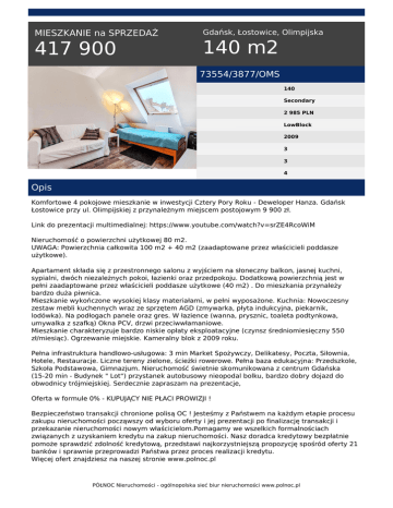 MIESZKANIE na SPRZEDAŻ 417 900 Gdańsk, Łostowice, Olimpijska 140 m2 73554/3877/OMS 140 Secondary 2 985 PLN LowBlock 2009 3 3 4 Opis Komfortowe 4 pokojowe mieszkanie w inwestycji Cztery Pory Roku - Deweloper Hanza. Gdańsk Łostowice przy ul. Olimpijskiej z przynależnym miejscem postojowym 9 900 zł. Link do prezentacji multimedialnej: https://www.youtube.com/watch?v=srZE4RcoWiM Nieruchomość o powierzchni użytkowej 80 m2. UWAGA: Powierzchnia całkowita 100 m2 + 40 m2 (zaadaptowane przez właścicieli poddasze użytkowe). Apartament składa się z przestronnego salonu z wyjściem na słoneczny balkon, jasnej kuchni, sypialni, dwóch niezależnych pokoi, łazienki oraz przedpokoju. Dodatkową powierzchnią jest w pełni zaadaptowane przez właścicieli poddasze użytkowe (40 m2) . Do mieszkania przynależy bardzo duża piwnica. Mieszkanie wykończone wysokiej klasy materiałami, w pełni wyposażone. Kuchnia: Nowoczesny zestaw mebli kuchennych wraz ze sprzętem AGD (zmywarka, płyta indukcyjna, piekarnik, lodówka). Na podłogach panele oraz gres. W łazience (wanna, prysznic, toaleta podtynkowa, umywalka z szafką) Okna PCV, drzwi przeciwwłamaniowe. Mieszkanie charakteryzuje bardzo niskie opłaty eksploatacyjne (czynsz średniomiesięczny 550 zł/miesiąc). Ogrzewanie miejskie. Kameralny blok z 2009 roku. Pełna infrastruktura handlowo-usługowa: 3 min Market Spożywczy, Delikatesy, Poczta, Siłownia, Hotele, Restauracje. Liczne tereny zielone, ścieżki rowerowe. Pełna baza edukacyjna: Przedszkole, Szkoła Podstawowa, Gimnazjum. Nieruchomość świetnie skomunikowana z centrum Gdańska (15-20 min - Budynek " Lot") przystanek autobusowy nieopodal bolku, bardzo dobry dojazd do obwodnicy trójmiejskiej. Serdecznie zapraszam na prezentacje, Oferta w formule 0% - KUPUJĄCY NIE PŁACI PROWIZJI ! Bezpieczeństwo transakcji chronione polisą OC ! Jesteśmy z Państwem na każdym etapie procesu zakupu nieruchomości począwszy od wyboru oferty i jej prezentacji po finalizację transakcji i przekazanie nieruchomości nowym właścicielom.Pomagamy we wszelkich formalnościach związanych z uzyskaniem kredytu na zakup nieruchomości. Nasz doradca kredytowy bezpłatnie pomoże sprawdzić zdolność kredytową, przedstawi najkorzystniejszą propozycję spośród oferty 21 banków i sprawnie przeprowadzi Państwa przez proces realizacji kredytu. Więcej ofert znajdziesz na naszej stronie www.polnoc.pl PÓŁNOC Nieruchomości - ogólnopolska sieć biur nieruchomości www.polnoc.pl * UWAGA! Zamieszczone na naszych stronach oferty nie stanowią oferty w rozumieniu Kodeksu Cywilnego, a dane w nich zawarte mają jedynie charakter informacyjny. Tomasz Wiśniewski tel. 530-647-205 email: [email protected] PÓŁNOC Nieruchomości - ogólnopolska sieć biur nieruchomości www.polnoc.pl Powered by TCPDF (www.tcpdf.org)
