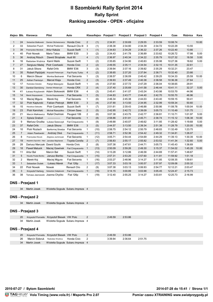 II Szombierki Rally Sprint 2014 Rally Sprint Ranking zawodów - OPEN - oficjalne Miejsce Bib. Kierowca Pilot Auto Klasa (Miejsce) Przejazd 1 Przejazd 2 Przejazd 3 Przejazd 4 Czas Różnica Kara 1 24 Sebastian Białkowski Damian Olichwierowicz Honda Civic 2 (1) 2:34.91 2:30.69 2:29.55 2:33.59 10:08.74 2 33 Sebastian Puzoń Michał Podżorski Renault Clio III 3 (1) 2:38.38 2:34.80 2:34.39 2:34.72 10:22.29 13.55 3 39 Przemysław Mendrek Artur Kałuża Suzuki Swift 1 (1) 2:34.63 2:34.29 2:36.22 2:37.26 10:22.40 13.66 4 40 Piotr Nowak Mario Tatoo BMW E30 3 (2) 2:34.43 2:41.78 2:36.89 2:33.62 10:26.72 17.98 5.00 5 36 Andrzej Rduch Dawid Strzębała Audi 90 4 (1) 2:36.97 2:40.34 2:34.22 2:35.79 10:27.32 18.58 5.00 6 16 Suzuki Swift 1 (2) 2:35.65 2:34.90 2:40.83 2:35.98 10:27.36 18.62 5.00 7 27 Sergiusz Madej Piotr Czerkaski Honda Civic 2 (2) 2:49.55 2:35.11 2:34.54 2:32.15 10:31.35 22.61 8 31 Jakub Sikora Rafał Orlik BMW E36 3 (3) 2:39.94 2:37.16 2:39.82 2:35.29 10:32.21 23.47 9 35 Robert Pędzijski Krzysztof Piekarczyk Fiat Punto Turbo 4 (2) 2:38.65 2:37.20 2:37.84 2:38.71 10:32.40 23.66 10 6 Marcin Steuer Monika Bednarek Fiat Seicento 1 (3) 2:38.57 2:36.09 2:40.42 2:39.25 10:34.33 25.59 11 25 Adrian Franiszyn Marcel Klaja Honda Civic 2 (3) 2:39.93 2:37.49 2:40.38 2:38.58 10:36.38 27.64 12 17 Radosław Dziedzic Patryk Mokrzycki Suzuki Swift 1 (4) 2:37.60 2:37.72 2:47.29 2:36.04 10:38.65 29.91 13 30 Danbiel Dembinny Honda CRX 2 (4) 2:37.40 2:35.69 2:41.58 2:46.44 10:41.11 32.37 14 41 Łukasz Krzyżowski Adam Stokowski BMW E36 4 (3) 2:45.41 2:41.07 2:43.24 2:43.98 10:53.70 44.96 15 14 Marek Kiepuszewski Fiat Seicento 1 (5) 2:44.83 2:43.77 2:44.40 2:42.70 10:55.70 46.96 16 12 Maciej Migura Marek Koj Fiat Seicento 1 (6) 2:46.34 2:45.38 2:44.03 2:43.40 10:59.15 50.41 17 32 Piotr Kapturski Fabian Pietrzyk BMW E30 3 (4) 2:37.90 3:13.50 2:34.95 2:32.99 10:59.34 50.60 18 15 Klaudiusz Gałuszka Piotr Czerkaski Suzuki Swift 1 (7) 2:51.61 2:39.43 2:46.88 2:50.86 11:08.78 1:00.04 19 23 Piotr Kamiński Michał Rzeszótko Citroen Saxo 2 (5) 2:42.95 2:42.72 2:39.09 3:05.73 11:10.49 1:01.75 20 21 Marcin Małkiewicz Rafał Cheliński Peugeot 106 2 (6) 3:07.38 2:43.75 2:42.77 2:36.81 11:10.71 1:01.97 5.00 21 4 Sylwia Graboń ————— Fiat Seicento 1 (8) 2:58.86 2:51.81 2:45.71 2:38.74 11:15.12 1:06.38 10.00 22 9 Mariusz Grudka Łukasz Szewczyk Fiat Cinquecento 1 (9) 2:49.88 2:40.07 2:46.62 3:11.85 11:28.42 1:19.68 5.00 23 37 Rafał Orlik Jakub Sikora BMW E36 3 (5) 2:44.57 3:13.50 2:39.34 2:51.38 11:28.79 1:20.05 10.00 24 10 Piotr Rozlach Bartłomiej Stradza 25 7 26 8 27 19 Magdalena Zagrodzka – MajcherJarosław 28 28 29 30 31 5 Klaudia Pezda-Bieńko 32 2 Marek Koj 33 1 Sebastian Dudek 34 22 35 3 36 38 Radosław W oźnica Kamil Malik Damian Włodarczyk Dorota Kiepuszewska 10.00 10.00 5.00 10.00 Fiat Seicento 1 (10) 2:58.75 2:54.12 2:50.79 2:48.83 11:32.49 1:23.75 Fiat Cinquecento 1 (11) 2:58.71 2:52.36 2:54.42 2:49.32 11:34.81 1:26.07 Fiat Seicento 1 (12) 3:05.71 2:54.44 2:54.69 2:44.29 11:39.13 1:30.39 10.00 Toyota Corolla 2 (7) 2:56.83 2:55.17 2:55.82 2:53.52 11:41.34 1:32.60 5.00 Dariusz Marczak Dawid Szulik Honda Civic 2 (8) 3:07.38 2:47.61 2:44.71 3:05.73 11:45.43 1:36.69 18 Paweł Matusik Maciej Gawinek Fiat Cinquecento 1 (13) 2:50.09 2:59.26 2:49.30 3:15.37 11:54.02 1:45.28 11 Artur Bal Marcin Bal Suzuki Swift 1 (14) 3:13.28 3:12.86 2:46.58 2:44.69 11:57.41 1:48.67 Janusz Bieńko Fiat Cinquecento 1 (15) 2:57.31 2:53.20 2:57.60 3:11.81 11:59.92 1:51.18 Maciej Migura Fiat Seicento 1 (16) 2:53.27 2:48.96 3:14.27 3:11.85 12:08.35 1:59.61 Łukasz Marek Fiat 126p 1 (17) 3:07.33 3:03.19 3:00.57 2:57.97 12:09.06 2:00.32 Renault Clio 2 (9) 3:07.38 3:03.13 3:06.93 2:54.77 12:12.21 2:03.47 Fiat Cinquecento 1 (18) 3:14.15 3:00.89 3:03.98 3:05.45 12:24.47 2:15.73 1 (19) 3:12.40 2:55.25 3:14.27 3:03.81 12:25.73 2:16.99 2:49.59 2:53.86 2 2:49.59 2:53.86 2 3:39.94 2:36.64 Adam Pawłowski Przemysław Klocek Piotr Nowak Krzysztof Hartwig Andrzej Oleś Zbigniew Jachimczak Majcherek Nowak Sebastian Gałążewski Tomasz Jasnowski Joanna Chyćko Fiat 126p 10.00 DNS - Przejazd 1 34 Martin Josek Wioletta Szypuła Subaru Impreza 4 DNS - Przejazd 2 34 Martin Josek Wioletta Szypuła Subaru Impreza 4 DNS - Przejazd 3 20 Krzysztof Pomietło 34 Martin Josek Krzysztof Biesek VW Polo 2 Wioletta Szypuła Subaru Impreza 4 DNS - Przejazd 4 20 Krzysztof Pomietło 26 Marcin Sidoruk 34 Martin Josek Krzysztof Biesek VW Polo Radosław Woźnica Honda Civic 2:51.75 Wioletta Szypuła Subaru Impreza 4 2010-07-27 / Bytom Szombierki Vola Timing (www.vola.fr) / Msports Pro 2.07 2014-07-28 do 15:41 / Strona 1/1 VolaSoftControlPdf Pomiar czasu XTRAINING www.swiatprzygody.pl