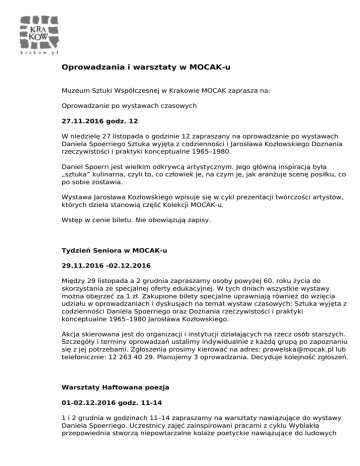 Oprowadzania i warsztaty w MOCAK-u Muzeum Sztuki Współczesnej w Krakowie MOCAK zaprasza na: Oprowadzanie po wystawach czasowych 27.11.2016 godz. 12 W niedzielę 27 listopada o godzinie 12 zapraszany na oprowadzanie po wystawach Daniela Spoerriego Sztuka wyjęta z codzienności i Jarosława Kozłowskiego Doznania rzeczywistości i praktyki konceptualne 1965–1980. Daniel Spoerri jest wielkim odkrywcą artystycznym. Jego główną inspiracją była „sztuka” kulinarna, czyli to, co człowiek je, na czym je, jak aranżuje scenę posiłku, co po sobie zostawia. Wystawa Jarosława Kozłowskiego wpisuje się w cykl prezentacji twórczości artystów, których dzieła stanowią część Kolekcji MOCAK-u. Wstęp w cenie biletu. Nie obowiązują zapisy. Tydzień Seniora w MOCAK-u 29.11.2016 -02.12.2016 Między 29 listopada a 2 grudnia zapraszamy osoby powyżej 60. roku życia do skorzystania ze specjalnej oferty edukacyjnej. W tych dniach wszystkie wystawy można obejrzeć za 1 zł. Zakupione bilety specjalne uprawniają również do wzięcia udziału w oprowadzaniach i dyskusjach na temat wystaw czasowych: Sztuka wyjęta z codzienności Daniela Spoerriego oraz Doznania rzeczywistości i praktyki konceptualne 1965–1980 Jarosława Kozłowskiego. Akcja skierowana jest do organizacji i instytucji działających na rzecz osób starszych. Szczegóły i terminy oprowadzań ustalimy indywidualnie z każdą grupą po zapoznaniu się z jej potrzebami. Zgłoszenia prosimy kierować na adres: [email protected] lub telefonicznie: 12 263 40 29. Planujemy 3 oprowadzania. Decyduje kolejność zgłoszeń. Warsztaty Haftowana poezja 01-02.12.2016 godz. 11-14 1 i 2 grudnia w godzinach 11–14 zapraszamy na warsztaty nawiązujące do wystawy Daniela Spoerriego. Uczestnicy zajęć zainspirowani pracami z cyklu Wyblakła przepowiednia stworzą niepowtarzalne kolaże poetyckie nawiązujące do ludowych makatek. Do warsztatów będzie można dołączyć w dowolnym momencie. Muzeum zapewnia materiały plastyczne. Wszystkich chętnych, a szczególnie seniorów, zapraszamy do wzięcia udziału w tym wydarzeniu. Zajęcia odbędą się w ramach Tygodnia Seniora w MOCAK-u. Udział w zajęciach na podstawie biletu wstępu (dla uczestników powyżej 60 roku życia za 1 zł.). Warsztaty odbędą się w przestrzeni ekspozycji na poziomie 0 (szczegółowa informacja w Recepcji). To zostaje! – warsztaty dla rodzin z dziećmi 04.12.2016 godz. 12 W niedzielę 4 grudnia o godzinie 12 zapraszamy dzieci wraz z opiekunami na otwarte warsztaty inspirowane wystawą Daniela Spoerriego Sztuka wyjęta z codzienności. Uczestnicy zajęć poznają prace z cyklu Stoły-pułapki oraz kolaże poetyckie z cyklu Wyblakła przepowiednia i stworzą własne zaskakujące prace plastyczne. Wstęp wolny, prosimy o wcześniejsze zgłoszenia pod adresem: [email protected] lub telefonicznie: 12 263 40 29. Oprowadzanie po wystawie Kolekcji MOCAK-u 04.12.2016 godz. 12 Szósta odsłona wystawy Kolekcji MOCAK-u jest prezentacją dzieł pozyskanych do zbiorów muzeum w ciągu ostatnich lat. W obecnym kształcie prezentacja podzielona jest na kilka działów: konceptualizm, wideo, rzeźba oraz obiekt. Kolekcja MOCAK-u jest tworzona od 2010 roku. Muzeum posiada w swoich zbiorach 4575 prac 236 artystów polskich i zagranicznych. Celem tworzenia Kolekcji jest gromadzenie sztuki polskiej ostatnich 50 lat i jej eksponowanie na tle twórczości światowej. Równie istotna jest popularyzacja dokonań najważniejszych artystów wśród zróżnicowanej grupy odbiorców oraz zmiana przekonania, że sztuka najnowsza jest trudna i niezrozumiała. Od marca 2016 roku w ramach wystawy kolekcji prezentujemy interaktywną instalację Krystiana Lupy Live Factory 2: Warhol by Lupa, zbudowaną na bazie scenografii do jego sztuki Factory 2, której premiera odbyła się w 2008 roku. Udział w cenie biletu. Nie obowiązują zapisy. Zapraszamy! Powered by TCPDF (www.tcpdf.org)