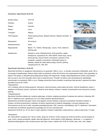 Hochlienz Sporthotel ALM 20 Symbol oferty: 475/178 Państwo: Austria Region: Karyntia Miasto: Lienz Transport: Własny Profil wyjazdu: Pobyt wypoczynkowy, Wyjazd rodzinny, Wyjazd narciarski, w Wyżywienie: All inclusive Zakwaterowanie: Hotel Wyposażenie: Basen, TV, Telefon, Restauracja, sauna, Tenis, Solarium, świadczenia: Zawarte w cenie: Zakwaterownie, drink powitalny, opłata górach Parking, Bar klimatyczna, wyżywienie ALL INCLUSIVE, basen kryty, sauna, łaźnia parowa, sauna Infrarot, korzystanie z gondoli w dniu przyjazdu i wyjazdu, korzystanie z lodowiska (łyżwy za dopłatą), dojazd do hotelu płatną drogą, Internet, parking, ubezpieczenie KL, NW, SKI. Sporthotel Hochlienz ALM 20 Sporthotel Hochlienz to wyjątkowy hotel położony na wysokości 1950 m n.p.m., w ośrodku narciarskim Zettersfeld, około 150 m od wyciągu krzesełkowego. Główne zalety hotelu to położenie, oferta All Inclusive oraz wyposażenie hotelu, które sprawiają, że pobyt w nim goście z całą pewnością będą jeszcze długo mile wspominali. Uwaga: droga dojazdowa do hotelu utrzymywana jest na czarno, ale mimo wszystko warto mieć ze sobą łańcuchy. Ponadto nie każdy czuje się bezpiecznie wyjeżdżając samochodem na wysokość 1950 m n.p.m. Dlatego samochód można zostawić na parkingu obok gondoli i wyjechać do hotelu gondolką (czynna do 16:00). Wyposażenie: Hol z recepcją, kilka sal restauracyjnych i barowych, sala kominkowa, pokój zabaw dla dzieci, Internet (bezpłatnie), basen z widokiem na Dolomity, jacuzzi, saunarium, siłownia, tenis stołowy, solarium, masaże, przechowalnia nart (suszarnia na buty), parking. Zakwaterowanie: Sporthotel Hochlienz składa się z budynku głównego, w którym znajdują się pokoje 2 osobowe lub rodzinne z łazienką, WC, Sat TV, telefonem oraz z położonych vis a vis hotelu domków apartamentowych. Apartamenty są idealne dla gości, którzy chcą spędzić zimowe wakacje w typowych austriackich /tyrolskich chatach: w drzewie, od strony południowej z widokiem na dolinę. Apartamenty te idealnie współgrają z zimowym pejzażem gór. Przeznaczone są od 2 do 6 osób, wszystkie posiadają łazienkę z WC, kuchnię z mikrofalówką, Sat TV, telefonem i Internetem. W zależności od wielkości apartamentu posiadają one od 2 do 3 pomieszczeń. Apartament ALM 20: ok. 44 m2: dla 2-4 osób: sypialnia z łóżkiem małżeńskim, pokój dzienny z sofą do spania dla 1-2 osób. Wyżywienie: ALL INCLUSIVE: śniadanie (od 7:30 do 10:00), obiad (od 12:00 do 13:30), kolacja (od 18:00 do 20:30) w formie bufetów (2 zupy, zimne i gorące przystawki, sałatki, kilka dań głównych, różne desery), bufet sałatkowy i deserowy, 1 x w tygodniu 4 daniowa kolacja galowa, soki w bufecie przez cały dzień, kawa z ciastem (od 15:30 do 16:30), piwo, wino, soki, napoje 1/2 bezalkoholowe do kolacji. Zawarte w cenie: Zakwaterownie, drink powitalny, opłata klimatyczna, wyżywienie ALL INCLUSIVE, basen kryty, sauna, łaźnia parowa, sauna Infrarot, korzystanie z gondoli w dniu przyjazdu i wyjazdu, korzystanie z lodowiska (łyżwy za dopłatą), dojazd do hotelu płatną drogą, Internet, parking, ubezpieczenie KL, NW, SKI. Zniżki dla dzieci przy 2 osobach pełnopłatnych: 0-10 lat - 100%. 11-17 lat - 60%. od 18 lat - 30% TERMINY: od: 2017-03-04 do: 2017-03-11 (8 dni), miejsca: zamów cena od: 3322 PLN = 802 EUR od: 2017-03-11 do: 2017-03-18 (8 dni), miejsca: zamów cena od: 3322 PLN = 802 EUR od: 2017-03-18 do: 2017-03-25 (8 dni), miejsca: zamów cena od: 3322 PLN = 802 EUR od: 2017-03-25 do: 2017-04-01 (8 dni), miejsca: zamów cena od: 3322 PLN = 802 EUR CENNIK: Długość pobytu: 8 dni Grupa cenowa: A Ubezpieczenie (obligatoryjne) (*) Ubezpieczenie KL, NW, SKI 14 (*) Turystyczny Fundusz Gwarancyjny Pobyt w obiekcie (do wyboru) 2.5 (*) ALM 20 standardowo dla osób: 4 minimalnie: 2 Rodzaj osoby (do wyboru) Dziecko 11-17 Dziecko 0-10 (*) Osoba dorosła 3 osoba dorosła na dostawce (-) 314 (-) 785 550 Waluta: EUR Aktualne ceny z systemu S.A.R.T. (-) - cena usługi, podatku kalkulowana przy osobie lub gratis (*) - kwota wliczona w cenę standardową 2/2