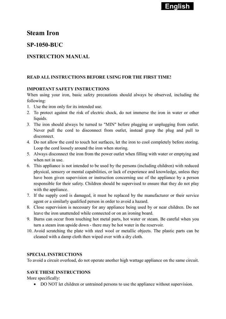 _English_ Steam Iron SP-1050-BUC INSTRUCTION MANUAL READ ALL INSTRUCTIONS BEFORE USING FOR THE FIRST TIME! IMPORTANT SAFETY INSTRUCTIONS When using your iron, basic safety precautions should always be observed, including the following: 1. Use the iron only for its intended use. 2. To protect against the risk of electric shock, do not immerse the iron in water or other liquids. 3. The iron should always be turned to "MIN" before plugging or unplugging from outlet. Never pull the cord to disconnect from outlet, instead grasp the plug and pull to disconnect. 4. Do not allow the cord to touch hot surfaces, let the iron to cool completely before storing. Loop the cord loosely around the iron when storing. 5. Always disconnect the iron from the power outlet when filling with water or emptying and when not in use. 6. This appliance is not intended to be used by the persons (including children) with reduced physical, sensory or mental capabilities, or lack of experience and knowledge, unless they have been given supervision or instruction concerning use of the appliance by a person responsible for their safety. Children should be supervised to ensure that they do not play with the appliance. 7. If the supply cord is damaged, it must be replaced by the manufacturer or their service agent or a similarly qualified person in order to avoid a hazard. 8. Close supervision is necessary for any appliance being used by or near children. Do not leave the iron unattended while connected or on an ironing board. 9. Burns can occur from touching hot metal parts, hot water or steam. Be careful when you turn a steam iron upside down - there may be hot water in the reservoir. 10. Avoid scratching the plate with steel wool or metallic objects. The plastic parts can be cleaned with a damp cloth then wiped over with a dry cloth. SPECIAL INSTRUCTIONS To avoid a circuit overload, do not operate another high wattage appliance on the same circuit. SAVE THESE INSTRUCTIONS More specifically: • DO NOT let children or untrained persons to use the appliance without supervision. _English_ • • • NEVER immerse the iron, cable or plug in any liquid. DO NOT leave the hot iron on fabrics or inflammable surfaces. DO NOT leave the appliance unnecessarily plugged in. Disconnect the plug from the mains when the appliance is not being used. DESCRIPTION OF APPLIANCE A. Spray nozzle B. Water filling inlet C. Steam selector D. Spray button E. Burst of steam button F. Indicator light G. Cord protection H. Power cord I. Water tank J. Thermostat control K. Soleplate Please note: Use tap water only. Do not use chemical additives, scented substances or decalcifiers. Failure to comply with the above mentioned regulations will void the warranty. GENERAL INSTRUCTIONS When using the iron for the first time, you may notice a slight emission of smoke and hear some sounds made by the expanding plastics. This is quite normal and it will stop after a short time. We also recommend passing the iron over an ordinary cloth before using it for the first time. PREPARATIONS Sort the laundry to be ironed according to the international symbols on the garment label. STEAM IRONING 1. Check that the plug is disconnected from the socket when filling the water. 2. Move the steam selector to "0". 3. Open the lid of the water filling inlet. 4. Raise the tip of the iron to help the water enter the opening without overflowing. 5. Slowly pour the water into the reservoir using filler. 6. Do not fill water over the maximum level (about 130ml) indicated by "MAX" on the _English_ reservoir. 7. Close the lid. SELECTING THE TEMPERATURE 1. Put the iron in a vertical position. 2. Put the plug into the socket. 3. Adjust the thermostat knob according to the international symbol on the garment label. The plate temperature control light indicates that the iron is heating up. Wait until the plate temperature control light goes off before ironing. WARNING: During ironing, the plate temperature control light comes on at intervals, indicating that the selected temperature is maintained. Move the steam selector to a position between minimum and maximum depending on the quantity of steam required and the temperature selected. WARNING: The iron gives off steam continuously only if you hold the iron horizontally. You can stop the continuous steam by placing the iron in a vertical position or by moving the steam selector to "0". You can only use steam at the highest temperatures. If the selected temperature is too low, water may drip onto the plate. Press the burst of steam button to steam ironing vertically. Press the burst of steam button to generate a powerful burst of steam that can penetrate the fabrics and smooth the most difficult and tough creases. Wait for a few seconds before pressing again. By pressing the shot-steam button at intervals you can also iron vertically (curtains, hung garments, etc.). WARNING: The burst of steam function can only be used at high temperatures. Stop the emission when the plate temperature control light comes on, then start ironing again only after the light has gone off. DRY IRONING To iron without steam, follow the instructions in section "steam ironing", leaving the steam selector on position "0". SPRAY FUNCTION Make sure that there is water in the reservoir. Press the spray button slowly (for a dense spray) or quickly (for a vaporized spray). WARNING: For delicate fabrics, we recommend moistening the fabric before using the spray function, or putting a damp cloth between the iron and the fabric. To avoid staining, do not use the spray on silk or synthetic fabrics. CLEANING AND MAINTENANCE Please note: Before cleaning the iron in any way, make sure that the appliance plug is not connected to the socket. Any deposits, starch residue or size left on the plate can be removed using a damp cloth. _Polski_ Żelazko elektryczne SP-1050-BUC INSTRUKCJA PRZECZYTAJ UWAŻNIE WSZYSTKIE INSTRUKCJE PRZED UŻYCIEM PO RAZ PIERWSZY! WAŻNE ZASADY BEZPIECZEŃS