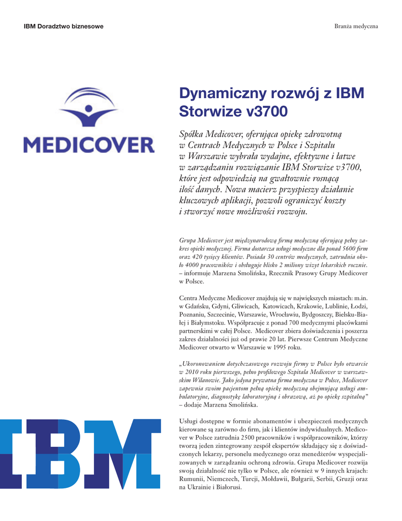 IBM Doradztwo biznesowe Branża medyczna Dynamiczny rozwój z IBM Storwize v3700 Spółka Medicover, oferująca opiekę zdrowotną w Centrach Medycznych w Polsce i Szpitalu w Warszawie wybrała wydajne, efektywne i łatwe w zarządzaniu rozwiązanie IBM Storwize v3700, które jest odpowiedzią na gwałtownie rosnącą ilość danych. Nowa macierz przyspieszy działanie kluczowych aplikacji, pozwoli ograniczyć koszty i stworzyć nowe możliwości rozwoju. Grupa Medicover jest międzynarodową firmą medyczną oferującą pełny zakres opieki medycznej. Firma dostarcza usługi medyczne dla ponad 5600 firm oraz 420 tysięcy klientów. Posiada 30 centrów medycznych, zatrudnia około 4000 pracowników i obsługuje blisko 2 miliony wizyt lekarskich rocznie. – informuje Marzena Smolińska, Rzecznik Prasowy Grupy Medicover w Polsce. Centra Medyczne Medicover znajdują się w największych miastach: m.in. w Gdańsku, Gdyni, Gliwicach, Katowicach, Krakowie, Lublinie, Łodzi, Poznaniu, Szczecinie, Warszawie, Wrocławiu, Bydgoszczy, Bielsku-Białej i Białymstoku. Współpracuje z ponad 700 medycznymi placówkami partnerskimi w całej Polsce. Medicover zbiera doświadczenia i poszerza zakres działalności już od prawie 20 lat. Pierwsze Centrum Medyczne Medicover otwarto w Warszawie w 1995 roku. „Ukoronowaniem dotychczasowego rozwoju firmy w Polsce było otwarcie w 2010 roku pierwszego, pełno profilowego Szpitala Medicover w warszawskim Wilanowie. Jako jedyna prywatna firma medyczna w Polsce, Medicover zapewnia swoim pacjentom pełną opiekę medyczną obejmującą usługi ambulatoryjne, diagnostykę laboratoryjną i obrazową, aż po opiekę szpitalną” – dodaje Marzena Smolińska. Usługi dostępne w formie abonamentów i ubezpieczeń medycznych kierowane są zarówno do firm, jak i klientów indywidualnych. Medicover w Polsce zatrudnia 2500 pracowników i współpracowników, którzy tworzą jeden zintegrowany zespół ekspertów składający się z doświadczonych lekarzy, personelu medycznego oraz menedżerów wyspecjalizowanych w zarządzaniu ochroną zdrowia. Grupa Medicover rozwija swoją działalność nie tylko w Polsce, ale również w 9 innych krajach: Rumunii, Niemczech, Turcji, Mołdawii, Bułgarii, Serbii, Gruzji oraz na Ukrainie i Białorusi. Branża medyczna IBM Doradztwo biznesowe Medicover jest laureatem wielu prestiżowych nagród i wyróżnień. Spółka zajęła I miejsce w rankingu prywatnych firm medycznych ogłoszonym przez prestiżowy magazyn Forbes, zdobyła tytuł „Laur Klienta” oraz Godło „Jakość Obsługi 2011”. Z kolei Redakcja Gazety Finansowej wyróżniła Medicover w kategorii firm oferujących najlepsze produkty skierowane do biznesu, odznaczające się bogatą ofertą i innowacyjnymi rozwiązaniami. „Wiemy, jak ważne jest dla pacjenta utrzymanie dobrego stanu zdrowia oraz uzyskanie bardzo szybkiej informacji i pomocy medycznej. Naszą ofertę przygotowaliśmy tak, by bez konieczności załatwiania zbędnych formalności, pacjenci mieli łatwy dostęp do opieki i mogli skoncentrować się na szybkim powrocie do zdrowia” – mówi Marzena Smolińska. Problem biznesowy Świadczenie wysokiej jakości usług medycznych oraz dynamiczny rozwój nie byłyby możliwe bez wsparcia nowoczesnych rozwiązań technologicznych. Wszystkie lokalizacje należące do Medicover obsługiwane są przez wspólne środowisko informatyczne, które musi spełniać wymagania dynamicznie rozwijającego się biznesu. „Medicover otwiera kolejne placówki, do tego przybywa nowych pacjentów, dla których uruchamiamy całkiem nowe usługi. Dostrzegliśmy, że przy takim rozwoju, nasze środowisko informatyczne wkrótce przestanie spełniać oczekiwania biznesu. Jednocześnie, dłuższa eksploatacja niektórych elementów infrastruktury była nieefektywna z ekonomicznego punktu widzenia. Wymagane były zmiany, które zapewnią długofalowe wsparcie potrzeb biznesowych” – mówi Tomasz Pawłowski, Kierownik operacyjny IT, Medicover. Medicover postanowił poszukać rozwiązania, które pozwoliłoby na bardziej efektywną i optymalną realizację procesów biznesowych. Spółka chciała uzyskać większe możliwości rozwoju infrastruktury przy jednoczesnym jej uproszczeniu. Rozwiązanie W poszukiwaniu najlepszego rozwiązania pracownicy działu IT przeprowadzili dokładną analizę potrzeb. W pierwszej kolejności zebrano informacje na temat parametrów nowego sprzętu mieszczących się w założonym budżecie. „Pytaliśmy dostawców o propozycje produktów w różnych wariantach komponentów takich jak pamięć, dyski, procesory oraz ich wydajność. Na tej podstawie stworzyliśmy kalkulację, która umożliwiła nam wyłonić pożądaną konfigurację nowego sprzętu spełniającą ustalony budżet” – mówi Tomasz Pawłowski. Branża medyczna IBM Doradztwo biznesowe Konkretne zapytanie ofertowe zostało wysłane do trzech partnerów reprezentujących różnych producentów sprzętu. Najlepsze rozwiązanie złożone z macierzy IBM Storwize v3700 i serwerów IBM System x3850 przedstawiła firma K3System z Warszawy, posiadająca status IBM Advanced Business Partner. W algorytmie porównywania ofert główną rolę odgrywała cena, ale inne czynniki również posiadały znaczącą wagę. Dla przykładu jedno z proponowanych rozwiązań posiadało niższą cenę jednak brakowało w nim funkcjonalności Easy Tier, która była wyjątkowo istotna z punktu widzenia realizacji założonych celów. „Zaproponowaliśmy serwery z tej samej linii, którą Medicover już posiadał, natomiast wyposażone w najnowsze procesory, dużą ilość pamięci RAM i karty FC 8 GB/s. Jednak to macierze dały tak duży skok wydajności całego systemu. IBM Storwize v3700 posiada 4 razy więcej cacheu niż używane przez klienta dotychczas. Oparte są o dużo tańsze dyski SAS 6gb/s vs stare FC 4GB/s. Dodatkowo nowe macierze wykorzystują nieporównywalnie szybsze dyski SSD” – mó