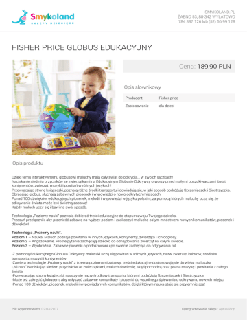 SMYKOLAND.PL ŻABNO 53, 88-342 WYLATOWO 784 387 126 lub (52) 56 99 128 FISHER PRICE GLOBUS EDUKACYJNY Cena: 189,90 PLN Opis słownikowy Producent Fisher price Zastosowanie dla dzieci Opis produktu Dzięki temu interaktywnemu globusowi maluchy mają cały świat do odkrycia... w swoich rączkach! Naciskanie siedmiu przycisków ze zwierzątkami na Edukacyjnym Globusie Odkrywcy otworzy przed małymi poszukiwaczami świat kontynentów, zwierząt, muzyki i powitań w różnych językach! Przewracając stronę książeczki, poznają różne środki transportu i dowiadują się, w jaki sposób podróżują Szczeniaczek i Siostrzyczka. Obracając globus, słuchają zabawnych piosenek i wypowiedzi o nowo odkrytych miejscach. Ponad 100 dźwięków, edukacyjnych piosenek, melodii i wypowiedzi w języku polskim, za pomocą których maluchy uczą się, że odkrywanie świata może być świetną zabawą! Każdy maluch uczy się i bawi na swój sposób. Technologia „Poziomy nauki” pozwala dobierać treści edukacyjne do etapu rozwoju Twojego dziecka. Przesuń przełącznik, aby przenieść zabawę na wyższy poziom i zaskoczyć malucha całym mnóstwem nowych komunikatów, piosenek i dźwięków! Technologia „Poziomy nauki”. Poziom 1 – Nauka. Maluch poznaje powitania w innych językach, kontynenty, zwierzęta i ich odgłosy. Poziom 2 – Angażowanie. Proste pytania zachęcają dziecko do odnajdowania zwierząt na całym świecie. Poziom 3 – Wyobraźnia. Zabawne piosenki o podróżowaniu po świecie zachęcają do odgrywania ról. -Z pomocą Edukacyjnego Globusa Odkrywcy maluszki uczą się powitań w różnych językach, nazw zwierząt, kolorów, środków transportu, muzyki i kontynentów -Zawiera technologię „Poziomy nauki” z trzema poziomami zabawy: treści edukacyjne dostosowują się do wieku maluszka -„Ni-hao!” Naciskając siedem przycisków ze zwierzątkami, maluch dowie się, skąd pochodzą oraz pozna muzykę i powitania z całego świata -Przewracając strony książeczki, nauczy się nazw środków transportu, którymi podróżują Szczeniaczek i Siostrzyczka -Może też zakręcić globusem, aby usłyszeć zabawne komunikaty i piosenki do wspólnego śpiewania o odkrywaniu nowych miejsc -Ponad 100 dźwięków, piosenek, melodii i wypowiadanych komunikatów, dzięki którym nauka staje się przyjemniejsza! Plik wygenerowano: 02-03-2017 Oprogramowanie sklepu: AptusShop SMYKOLAND.PL ŻABNO 53, 88-342 WYLATOWO 784 387 126 lub (52) 56 99 128 Wiek: 6-36 m+ Galeria Plik wygenerowano: 02-03-2017 Powered by TCPDF (www.tcpdf.org) Oprogramowanie sklepu: AptusShop