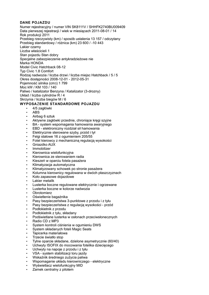 DANE POJAZDU Numer rejestracyjny / numer VIN SK8111V / SHHFK2740BU009409 Data pierwszej rejestracji / wiek w miesiącach 2011-08-01 / 14 Rok produkcji 2011 Przebieg rzeczywisty (km) / sposób ustalenia 13 157 / odczytany Przebieg standardowy / różnica (km) 23 600 / -10 443 Lakier czarny Liczba właścicieli 1 Stan pojazdu Stan dobry Specjalne zabezpieczenie antykradzieżowe nie Marka HONDA Model Civic Hatchback 08-12 Typ Civic 1.8 Comfort Rodzaj nadwozia / liczba drzwi / liczba miejsc Hatchback / 5 / 5 Okres dostępności 2008-12-01 - 2012-05-31 Pojemność silnika (cm3) 1 799 Moc kW / KM 103 / 140 Paliwo / katalizator Benzyna / Katalizator (3-drozny) Układ / liczba cylindrów R / 4 Skrzynia / liczba biegów M / 6 WYPOSA Ż ENIE STANDARDOWE POJAZDU • 4/5 zagłówki • ABS • Airbag 6 sztuk • Aktywne zagłówki przednie, chroniące kręgi szyjne • BA - system wspomagania hamowania awaryjnego • EBD - elektroniczny rozdział sił hamowania • Elektrycznie sterowane szyby, przód i tył • Felgi stalowe 16 z ogumieniem 205/55 • Fotel kierowcy z mechaniczną regulacją wysokości • Gniazdko AUX • Immobilizer • Kierownica wielofunkcyjna • Kierownica ze sterowaniem radia • Kieszeń w oparciu fotela pasażera • Klimatyzacja automatyczna • Klimatyzowany schowek po stronie pasażera • Kolumna kierownicy regulowana w dwóch płaszczyznach • Koło zapasowe dojazdowe • Lakier metalik • Lusterka boczne regulowane elektrycznie i ogrzewane • Lusterka boczne w kolorze nadwozia • Obrotomierz • Oświetlenie bagażnika • Pasy bezpieczeństwa 3-punktowe z przodu i z tyłu • Pasy bezpieczeństwa z regulacją wysokości - przód • Podłokietnik z przodu • Podłokietnik z tyłu, składany • Podświetlane lusterka w osłonach przeciwsłonecznych • Radio CD z MP3 • System kontroli ciśnienia w ogumieniu DWS • System składanych foteli Magic Seats • Tapicerka materiałowa • Trzecie światło stop • Tylne oparcie składane, dzielone asymetrycznie (60/40) • Uchwyty ISOFIX do mocowania fotelika dziecięcego • Uchwyty na napoje z przodu i z tyłu • VSA - system stabilizacji toru jazdy • Wskaźnik średniego zużycia paliwa • Wspomaganie układu kierowniczego - elektryczne • Wyświetlacz wielofunkcyjny MID • Zamek centralny z pilotem • Zderzaki w kolorze nadwozia WYPOSA Ż ENIE DODATKOWE POJAZDU Alarm Czujniki parkowania – tył NOTATK I Nota t k a do w y c eny: Podczas przeprowadzonych oględzin stwierdzono następujące nieznaczne uszkodzenia eksploatacyjne nadwozie - liczne drobne zarysowania na wielu elementach nadwozia , nieliczne pkt odpryski na przednich elementach - zderzak przedni - drobne zarysowany i otarcia z lewej strony - pokrywa komory silnika - nieliczne pkt odpryski - płat dachu - miejscowe zarysowanie - drzwi przednie lewe - pkt odpryski , nieznaczne zarysowania - drzwi tylne lewe - zarysowania w dolnej części po środku - błotnik przedni prawy - zarysowana nakładka wnęki koła - zderzak tylny - z lewej strony miejscowo wgnieciony zdeformowany , pościerany zarysowany - wyposażenie kabiny - tapicerka i obicia tapicerskie - zabrudzenia eksploatacyjne , deska rozdzielcza - miejscowe dwa wgniecenia z uszkodzeniem deski , - opony kół przednich - MICHELIN 215/55 R16 i tylnych NOKIAN 215/55 R16 - średnie zużycie eksploatacyjne , - jest koło zapasowe dojazdowe Nie stwierdzono znacznie podwyższonej grubości powłoki lakierowej nadwozia . W przedstawionej książce gwarancyjnej brak wpisu o wykonaniu przeglądu gwarancyjnego - są dwa kpl kluczyków .