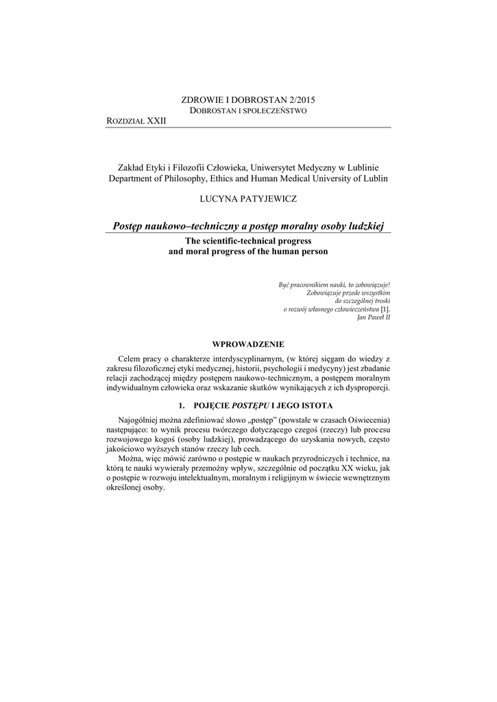 ZDROWIE I DOBROSTAN 2/2015 DOBROSTAN I SPOŁECZEŃSTWO ROZDZIAŁ XXII Zakład Etyki i Filozofii Człowieka, Uniwersytet Medyczny w Lublinie Department of Philosophy, Ethics and Human Medical University of Lublin LUCYNA PATYJEWICZ Postęp naukowo–techniczny a postęp moralny osoby ludzkiej The scientific-technical progress and moral progress of the human person Być pracownikiem nauki, to zobowiązuje! Zobowiązuje przede wszystkim do szczególnej troski o rozwój własnego człowieczeństwa [1]. Jan Paweł II WPROWADZENIE Celem pracy o charakterze interdyscyplinarnym, (w której sięgam do wiedzy z zakresu filozoficznej etyki medycznej, historii, psychologii i medycyny) jest zbadanie relacji zachodzącej między postępem naukowo-technicznym, a postępem moralnym indywidualnym człowieka oraz wskazanie skutków wynikających z ich dysproporcji. 1. POJĘCIE POSTĘPU I JEGO ISTOTA Najogólniej można zdefiniować słowo „postęp” (powstałe w czasach Oświecenia) następująco: to wynik procesu twórczego dotyczącego czegoś (rzeczy) lub procesu rozwojowego kogoś (osoby ludzkiej), prowadzącego do uzyskania nowych, często jakościowo wyższych stanów rzeczy lub cech. Można, więc mówić zarówno o postępie w naukach przyrodniczych i technice, na którą te nauki wywierały przemożny wpływ, szczególnie od początku XX wieku, jak o postępie w rozwoju intelektualnym, moralnym i religijnym w świecie wewnętrznym określonej osoby. ZDROWIE I DOBROSTAN 2/2015 Dobrostan i społeczeństwo Błędem byłoby odnosić pojęcie „postępu” 1) do całości nauk – ze względu na różnorodność kryteriów ocen rozwoju w poszczególnych naukach. Jeszcze nikt nie dokonał ich syntezy ani oceny z perspektywy postępu, a dotyczy to zarówno nauk humanistycznych, jak ścisłych, przyrodniczych i społecznych, nie mówiąc o innych; 2) do wszystkich sfer ludzkiego życia i działalności – z uwagi na ich różnorodność, a tym bardziej na często odmienne skutki w obszarze każdej; Można je natomiast oceniać, a nawet jest to konieczne, ze służby wartościom podstawowym: życiu, zdrowiu i godności każdego człowieka. Jeśli jakaś działalność człowieka, np. polityczna, narusza jego prawa moralne do tych wartości, a przez to uniemożliwia realizację celu zaistnienia określonej osoby w świecie (celem tym jest udoskonalanie duchowe, zwłaszcza moralne, do poziomu czynnej miłości Boga i bliźniego), trzeba ją uznać za wysoce szkodliwą moralnie, a zatem za niepostępową; 3) do tzw. człowieka ogólnego rozumianego jako „ludzkość” – ponieważ każdy człowiek istnieje realnie i rozwija się lub nie rozwija tylko jako osoba. Jego sukcesem duchowych jest każde zbliżenie się do wzoru moralnego i religijnego, jakim jest Jezus, a kilkaset lat przed Nim, dla starożytnych ateńczyków, był Sokrates. Błędem jest również mówienie o tzw. człowieku postępowym, jako nowoczesnym, czyli żyjącym zgodnie z wymaganiami nowoczesnej cywilizacji naukowotechnicznej. Człowiek został tu zredukowany (zawężony) do bycia użytkownikiem dóbr cywilizacyjnych, do bytu konsumpcyjnego, z pominięciem jego duchowej istoty i należnych mu z tego tytułu praw. Józef Bocheński sprawdził niektóre odmiany postępu do zabobonów. Stwierdził, że „wierzenie w ciągły postęp ludzkości ku coraz wyższym, lepszym stanom, ku rajowi na ziemi, ku >>światłu<< i tym podobnym, jest jednym z najszkodliwszych zabobonów. (…). Jego treść jest mniej więcej następująca. Człowiek jest w swojej istocie stworzeniem postępowym, staje się, jako gatunek, coraz lepszy, coraz doskonalszy. Owo doskonalenie występuje we wszystkich dziedzinach. Na płaszczyźnie poglądu na świat, człowiek przechodzi od zabobonów do nauki. W nauce idzie do coraz większej wiedzy, w technice opanowuje coraz lepiej świat. W moralności staje się coraz lepszy, w polityce wynajduje coraz doskonalsze formy rządów. W sztuce tworzy arcydzieła coraz doskonalsze. Tylko w religii nie ma postępu, bo ona jest zabobonem, który postęp skutecznie eliminuje, a skoro postęp daje tak wspaniałe wyniki, pierwszym i najświętszym obowiązkiem każdego zdrowego człowieka jest służenie postępowi ludzkości, któremu należy wszystko i wszystkich podporządkować. (…). Wiara w postęp (…) otrzymała wsparcie ze strony ewolucji Darwina oraz ze strony rozwoju nowoczesnych nauk przyrodniczych i techniki. Zoologia wykazała, że w świecie zwierząt występuje stały postęp. To twierdzenie przeniesiono na dzieje ludz310 Lucyna Patyjewicz Postęp naukowo–techniczny a postęp moralny osoby ludzkiej kie. (…). Ale to przeniesienie kategorii biologicznych na naszą historię jest najzupełniej bezpodstawne. (…). Mieliśmy, począwszy od XVII wieku, wspaniały rozwój nauk przyrodniczych i opartych na nim technologii. Zwłaszcza wyniki tych ostatnich są imponujące. Ale nie ma w dziejach, o ile wiadomo, żadnego postępu moralnego w ludzkości. (…). Mówić o stałym postępie moralnym ludzkości jest wciąż zabobonem. (…). Prawda, że pewien ograniczony postęp jest możliwy i u jednostki i w narodach. O taki postęp należy więc zabiegać”[2]. Zdaniem polskiego socjologa Jana Szczepańskiego, postęp naukowo-techniczniczny nie jest do końca oczywisty, ani racjonalny. Wymienia on następujące aspekty nauki: „jako system tworzenia wiedzy naukowej: jako system sprawdzanej i zaakceptowanej wiedzy;(…) jako system instytucji badawczych i ich organizacji; (…) jako społeczność uczonych , ich kształcenia, awansował, traktowania, wykorzystywania. Z tych czterech aspektów nauki, tylko w jednym z nich nauka jest systemem logicznie spójnym, prawie zupełnie racjonalnym: mianowicie nauka jako system pojęć, twierdzeń, hipotez, teorii i metod. (…). Natomiast nauka jako proces tworzenia wiedzy, (…), badania społeczne, archeologiczne, etnologiczne, psychologiczne i psychiatryczne – to ci