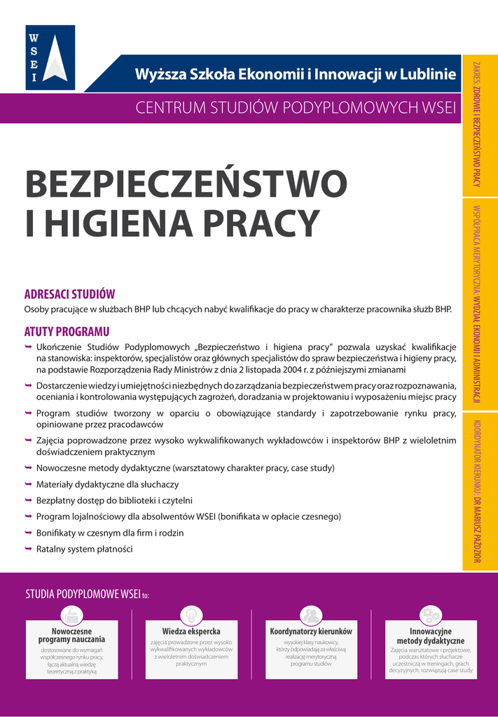 CENTRUM STUDIÓW PODYPLOMOWYCH WSEI ADRESACI STUDIÓW Osoby pracujące w służbach BHP lub chcących nabyć kwalifikacje do pracy w charakterze pracownika służb BHP. ATUTY PROGRAMU Ukończenie Studiów Podyplomowych „Bezpieczeństwo i higiena pracy” pozwala uzyskać kwalifikacje na stanowiska: inspektorów, specjalistów oraz głównych specjalistów do spraw bezpieczeństwa i higieny pracy, na podstawie Rozporządzenia Rady Ministrów z dnia 2 listopada 2004 r. z późniejszymi zmianami Dostarczenie wiedzy i umiejętności niezbędnych do zarządzania bezpieczeństwem pracy oraz rozpoznawania, oceniania i kontrolowania występujących zagrożeń, doradzania w projektowaniu i wyposażeniu miejsc pracy Zajęcia poprowadzone przez wysoko wykwalifikowanych wykładowców i inspektorów BHP z wieloletnim doświadczeniem praktycznym Nowoczesne metody dydaktyczne (warsztatowy charakter pracy, case study) Materiały dydaktyczne dla słuchaczy Bezpłatny dostęp do biblioteki i czytelni Program lojalnościowy dla absolwentów WSEI (bonifikata w opłacie czesnego) Bonifikaty w czesnym dla firm i rodzin Ratalny system płatności KOORDYNATOR KIERUNKU: DR MARIUSZ PAŹDZIOR Program studiów tworzony w oparciu o obowiązujące standardy i zapotrzebowanie rynku pracy, opiniowane przez pracodawców WSPÓŁPRACA MERYTORYCZNA: WYDZIAŁ EKONOMII I ADMINISTRACJI BEZPIECZEŃSTWO I HIGIENA PRACY ZAKRES: ZDROWIE I BEZPIECZEŃSTWO PRACY Wyższa Szkoła Ekonomii i Innowacji w Lublinie STUDIA PODYPLOMOWE WSEI to: Nowoczesne programy nauczania dostosowane do wymagań współczesnego rynku pracy, łączą aktualną wiedzę teoretyczną z praktyką Wiedza ekspercka Koordynatorzy kierunków zajęcia prowadzone przez wysoko wykwalifikowanych wykładowców z wieloletnim doświadczeniem praktycznym wysokiej klasy naukowcy, którzy odpowiadają za właściwą realizację merytoryczną programu studiów Innowacyjne metody dydaktyczne Zajęcia warsztatowe i projektowe, podczas których słuchacze uczestniczą w treningach, grach decyzyjnych, rozwiązują case study STUDIA PODYPLOMOWE Bezpieczeństwo i higiena pracy PROGRAM STUDIÓW Program studiów 180 godzin zajęć (wykłady, ćwiczenia, warsztaty) Organizacja i metodyka szkolenia Organizacja i zasady funkcjonowania służby BHP Prawo pracy Zarządzanie kulturą bezpieczeństwa pracy ORGANIZACJA ZAJĘĆ Zajęcia rozpoczynają się w marcu (semestr letni) lub w październiku (semestr zimowy) Studia trwają 2 semestry Zajęcia odbywają się średnio 1 raz w miesiącu w trybie weekendowym, w piątki od godz. 1600, soboty i w niedziele od godz. 830 ZASADY REKRUTACJI Zagrożenia występujące w środowisku pracy Kandydaci muszą posiadać dyplom ukończenia studiów wyższych (licencjat, inżynier, magister) Kandydaci przyjmowani są na podstawie kolejności zgłoszeń Aby zostać przyjętym na studia podyplomowe w WSEI należy wypełnić elektroniczny formularz dostępny na stronie Uczelni oraz złożyć w Centrum Studiów Podyplomowych WSEI komplet wymaganych dokumentów: dyplom/odpis ukończenia studiów wyższych wypełniony kwestionariusz zgłoszeniowy wypełnione podanie o przyjęcie na studia dwie fotografie (wymiar: 3,5 x 4,5) dowód uiszczenia opłaty rekrutacyjnej Egzamin OPŁATY ZA STUDIA Prawna ochrona pracy Ocena zgodności maszyn i urządzeń oraz środków ochrony zbiorowej i indywidualnej pracowników z wymaganiami BHP Psychologiczne problemy człowieka w środowisku pracy Ergonomia Zarządzanie bezpieczeństwem i ryzykiem pracy Środki ochrony indywidualnej Pierwsza pomoc przedmedyczna Aktualny cennik znajduje się na stronie Uczelni Przy jednorazowej opłacie udzielana jest bonifikata w wyokości 5% czesnego Uczelnia oferuje bonifikaty rodzinne oraz dla studentów i absolwentów WSEI Istnieje możliwość płatności ratalnej Opłata rekrutacyjna wynosi 100 zł. Studenci i absolwenci Wyższej Szkoły Ekonomii i Innowacji w Lublinie są zwolnieni z opłaty rekrutacyjnej Wpłat należy dokonać na konto Wyższej Szkoły Ekonomii i Innowacji w Lublinie: mBank o/Lublin nr 02 1140 1094 0000 2027 6900 1001 WARUNKI UKOŃCZENIA STUDIÓW Aktywny udział w zajęciach min. 80% obecności Pozytywne zaliczenie wszystkich przedmiotów Pozytywne zaliczenie egzaminu końcowego Wniesienie wymaganej opłaty za studia ABSOLWENCI OTRZYMUJĄ LICZBA MIEJSC OGRANICZONA Świadectwo ukończenia studiów podyplomowych WSEI Kartę słuchacza Dyplom Menedżerski REKRUTACJA na semestr letni do 28 lutego zgłoszenia na semestr zimowy do 15 września CENTRUM STUDIÓW PODYPLOMOWYCH Wyższa Szkoła Ekonomii i Innowacji w Lublinie ul. Projektowa 4, 20-209 Lublin + 48 81 749 32 24 [email protected] DOWIEDZ SIĘ WIĘCEJ w w w.wsei.lublin.pl