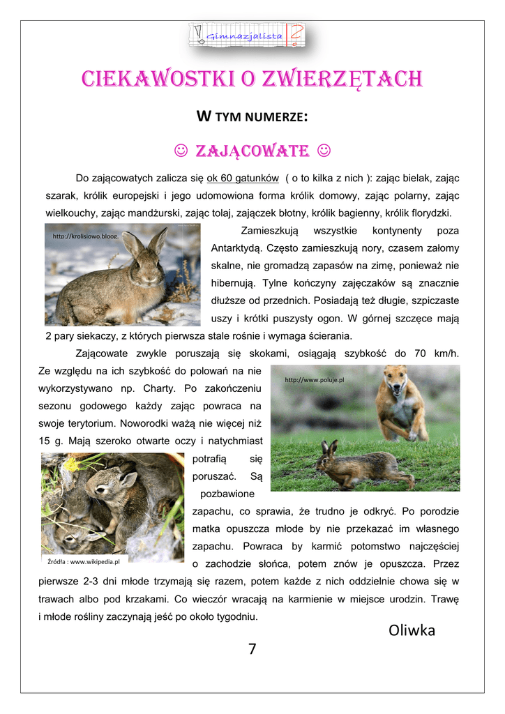 CIEKAWOSTKI O ZWIERZĘTACH ZWIERZ TACH W TYM NUMERZE: ☺ ZAJĄCOWATE ☺ Do zającowatych cowatych zalicza się si ok 60 gatunków ( o to kilka z nich ): ) zając bielak, zając szarak, królik europejski i jego udomowiona forma królik domowy,, zając zaj polarny, zając wielkouchy, zając mandżurski, urski, zając zaj tolaj, zajączek błotny, królik bagienny, bagienny królik florydzki. Zamieszkują http://krolisiowo.bloog. wszystkie kontynenty poza Antarktydą. Często zamieszkują ą nory, czasem załomy skalne, nie gromadzą zapasów apasów na zimę, zim ponieważ nie hibernują. Tylne kończyny zajęczaków ęczaków są s znacznie dłuższe od przednich. Posiadają też długie, szpiczaste uszy i krótki puszysty ogon. W górnej szczęce szcz mają 2 pary siekaczy, z których pierwsza stale rośnie i wymaga ścierania. Zającowate cowate zwykle poruszają poruszaj się skokami, osiągają szybkość szybko do 70 km/h. Ze względu na ich szybkość ść do polowań polowa na nie http://www.poluje.pl wykorzystywano np. Charty. Po zakończeniu sezonu godowego każdy dy zając zają powraca na swoje terytorium.. Noworodki ważą nie więcej niż 15 g. Mają szeroko otwarte oczy i natychmiast potrafią się poruszać. Są pozbawione zapachu, co sprawia, że e trudno je odkryć. odkry Po porodzie matka opuszcza młode by nie przekazać przekaza im własnego zapachu. Powraca by karmić potomstwo najczęściej najcz Źródła : www.wikipedia.pl o zachodzie słońca, potem znów je opuszcza. Przez pierwsze 2-3 3 dni młode trzymają się razem, potem każde de z nich oddzielnie chowa się si w trawach albo pod krzakami. Co wieczór wracają wracaj na karmienie w miejsce urodzin. Trawę i młode rośliny zaczynają jeść ść po około tygodniu. 7 Oliwka