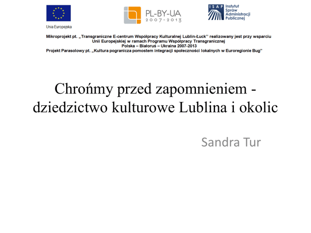 Chrońmy przed zapomnieniem dziedzictwo kulturowe Lublina i okolic Sandra Tur Kultura jest jednym z najważniejszych pojęć współczesnej rzeczywistości i zajmuje czołowe miejsce w wielu naukach humanistycznych. Kultura jest pojęciem wieloznacznym. Nie istnieje jej jedna, uniwersalna definicja, co daje jej wymiar abstrakcyjny. Kultura znacząco wpływa na życie społeczne – dzięki niej ludzie porozumiewają się, tworzą swoją tożsamość, historię i dziedzictwo. Obrazuje to dobrze słowa Ralph’a Linton’a, który twierdzi, że: „Kultura jest konfiguracją wyuczonych zachowań i ich rezultatów, których elementy składowe są podzielane i przekazywane przez członków danego społeczeństwa”(Linton R., „Kulturowe podstawy osobowości”, Warszawa 1975, s. 44). Kultura, prócz dziedzictwa materialnego, to również niematerialny system znaków, wartości, symboli czy norm, „kultura to system znaków służących międzyosobowej komunikacji”(Eco U., „Pejzaż semiotyczny”, Warszawa 1972, s. 29). Istotnym elementem kultury jest jej akceptowanie i zrozumienie przez członków danego społeczeństwa. W tym rozumieniu „o swoistości i odmienności kultury społeczeństwa nie decydują obiekty materialne, wytwory artystyczne oraz idee, bo one mogą być wspólne dla wielu społeczeństw, lecz znaczenia, jakie im są przypisywane w myślach i działaniach członków społeczeństwa, w ramach którego one występują. W tym ujęciu kultura jawi się jako zjawisko dynamiczne w sensie obiektywnym i subiektywnym”(Dyczewski L., „Kultura polska w procesie przemian”, Lublin 1995, s. 39). Dziedzictwo kulturowe to ogół dorobku społeczeństw lub narodów w zakresie nauki, sztuki, architektury, oświaty, techniki, wytworzonego w trakcie jego historycznego rozwoju i przekazywanego z pokolenia na pokolenie. Smolski R., Smolski M., Stadtmüller E.H., “Słownik Encyklopedyczny Edukacja Obywatelska”, Wydawnictwo Europa, 1999 Według danych UNESCO, dotyczących dziedzictwa kulturowego, dzieli się ono na dwa podstawowe elementy: 1. 2. materialne, na które składają się zabytki nieruchome i ruchome niematerialne, jest przekazywane przede wszystkim za pomocą przekazu ustnego i tradycji (http://www.unesco.pl/dzialalnosc/kultura/dziedzictwo-kulturowe.html) „W rozumieniu Konwencji UNESCO, której tekst został przyjęty na 32 sesji Konferencji Generalnej • • • • • UNESCO w październiku 2003 r., dziedzictwo niematerialne to zwyczaje, przekaz ustny, wiedza i umiejętności oraz związane z nimi przedmioty i przestrzeń kulturowa, które są uznane za część własnego dziedzictwa przez daną wspólnotę, grupę lub jednostki. Ten rodzaj dziedzictwa jest przekazywany z pokolenia na pokolenie i ustawicznie odtwarzany przez wspólnoty i grupy w relacji z ich środowiskiem, historią i stosunkiem do przyrody. Dla danej społeczności dziedzictwo niematerialne jest źródłem poczucia tożsamości i ciągłości. Dziedzictwo niematerialne w rozumieniu wspomnianej wyżej Konwencji obejmuje: Tradycje i przekazy ustne, w tym język jako narzędzie przekazu Spektakle i widowiska Zwyczaje, obyczaje i obchody świąteczne Wiedzę o wszechświecie i przyrodzie oraz związane z nią praktyki Umiejętności związane z tradycyjnym rzemiosłem” (http://www.unesco.pl/dzialalnosc/kultura/dziedzictwo-kulturowe/dziedzictwo-niematerialne.html 2008 (23.05.2014) 20 maja 2010 roku w Opactwie Benedyktynów w Tyńcu odbyła się konferencja „Kultura i dziedzictwo kulturowe w rozwoju regionu”. W trakcie konferencji poruszane były różne ujęcia kultury i dziedzictwa kulturowego w odniesieniu do regionu, a przede wszystkim Małopolski. Ciekawe spostrzeżenia miał prof. dr hab. Jerzy Hausner, który jest kierownikiem Katedry Gospodarki i Administracji Publicznej Uniwersytetu Ekonomicznego w Krakowie. Profesor Hausner swoją wypowiedź zaczął od znanych słów Max’a Weber’a: „Kultura stanowi z punktu widzenia człowieka, obdarzony sensem i znaczeniem, skończony wycinek bezsensownej nieskończoności”. Słowa te oddaja wartość znaczenia kultury dla społeczeństwa. Po przeprowadzonym panelu dyskusyjnym Profesor Jerzy Hausner postawił dwanaście tez dotyczących kultury i rozwoju regionu: „1) Dziedzictwo kulturowe to rzecz do „myślenia” nie tylko do „konserwacji”. Przemyślenie i interpretacja są niezbędne aby dziedzictwo trwało i się rozwijało; 2) Kreatywność rozwija się za sprawą rozbudzenia kulturowych potrzeb; 3) Rozbudzanie kulturowych potrzeb wymaga stworzenia warunków wyboru, pokazywania różnych sposobów zaspokajania potrzeb i różnych wzorów; 4) Organizacja działalności kulturalnej powinna stawać się instytucjami w rzeczywistym znaczeniu, czyli być wzorcotwórcze; 5) Niezależnie od problemów finansowych i personalnych instytucje kultury muszą być wzorcotwórcze, tworzyć normy, reguły standardy; 6) Potrzebne są wielowątkowe wydarzenia o synergicznych efektach, łączących różne elementy dziedzictwa; 7) Potrzebne jest powołanie nowych narracji po to by interpretować dziedzictwo kulturowe; 8) Niezbędne jest akcentowanie wielofunkcyjności kultury w kontekście rozwoju. W związku z tym potrzebne jest celowe i świadome wydatkowanie pieniędzy na rzecz kultury, aby wiązać środki publiczne z wielofunkcyjnością kultury na rzecz rozwoju; 9) Technologie informatyczne jako niezbędny warunek rozpowszechniania treści kulturowych, zwłaszcza jeśli technologie generują interaktywność; 10) Niezbędna jest digitalizacja – „Książka się umocni jeśli będziemy potrafili ją zdygitalizować”; 11) Dopuszczenie wielości form prawno- organizacyjnych do prowadzenia działalności kulturalnej. Publiczne finansowanie kultury powinno być zorientowane na nowe formy działalności kulturalnej; 12) Osoby, które mają odgrywać ważną rolę w działalności kulturalnej nie mogą być tylko animatorami, potrzebni są ko