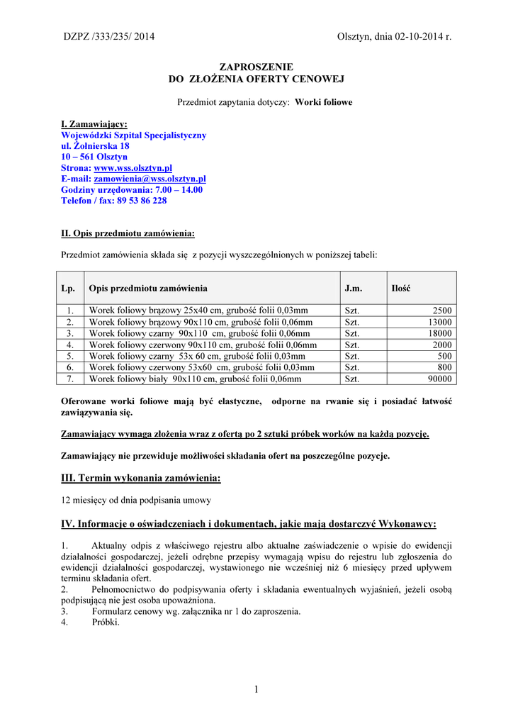 DZPZ /333/235/ 2014 Olsztyn, dnia 02-10-2014 r. ZAPROSZENIE DO ZŁOŻENIA OFERTY CENOWEJ Przedmiot zapytania dotyczy: Worki foliowe I. Zamawiający: Wojewódzki Szpital Specjalistyczny ul. Żołnierska 18 10 – 561 Olsztyn Strona: www.wss.olsztyn.pl E-mail: [email protected] Godziny urzędowania: 7.00 – 14.00 Telefon / fax: 89 53 86 228 II. Opis przedmiotu zamówienia: Przedmiot zamówienia składa się z pozycji wyszczególnionych w poniższej tabeli: Lp. 1. 2. 3. 4. 5. 6. 7. Opis przedmiotu zamówienia J.m. Worek foliowy brązowy 25x40 cm, grubość folii 0,03mm Worek foliowy brązowy 90x110 cm, grubość folii 0,06mm Worek foliowy czarny 90x110 cm, grubość folii 0,06mm Worek foliowy czerwony 90x110 cm, grubość folii 0,06mm Worek foliowy czarny 53x 60 cm, grubość folii 0,03mm Worek foliowy czerwony 53x60 cm, grubość folii 0,03mm Worek foliowy biały 90x110 cm, grubość folii 0,06mm Szt. Szt. Szt. Szt. Szt. Szt. Szt. Oferowane worki foliowe mają być elastyczne, zawiązywania się. Ilość 2500 13000 18000 2000 500 800 90000 odporne na rwanie się i posiadać łatwość Zamawiający wymaga złożenia wraz z ofertą po 2 sztuki próbek worków na każdą pozycję. Zamawiający nie przewiduje możliwości składania ofert na poszczególne pozycje. III. Termin wykonania zamówienia: 12 miesięcy od dnia podpisania umowy IV. Informacje o oświadczeniach i dokumentach, jakie mają dostarczyć Wykonawcy: 1. Aktualny odpis z właściwego rejestru albo aktualne zaświadczenie o wpisie do ewidencji działalności gospodarczej, jeżeli odrębne przepisy wymagają wpisu do rejestru lub zgłoszenia do ewidencji działalności gospodarczej, wystawionego nie wcześniej niż 6 miesięcy przed upływem terminu składania ofert. 2. Pełnomocnictwo do podpisywania oferty i składania ewentualnych wyjaśnień, jeżeli osobą podpisującą nie jest osoba upoważniona. 3. Formularz cenowy wg. załącznika nr 1 do zaproszenia. 4. Próbki. 1 DZPZ /333/235/ 2014 Olsztyn, dnia 02-10-2014 r. V. Osoby uprawnione do porozumiewania się z wykonawcami: Osobą upoważnioną ze strony Zamawiającego do kontaktowania się z wykonawcami jest: Stanisława Masłowska – Kierownik Działu Zamówień Publicznych i Zaopatrzenia, tel. 89 53 86 228. Ofertę cenową należy złożyć do dnia 07 października 2014 roku do godziny 14.30 na adres: Wojewódzki Szpital Specjalistyczny Dział Zamówień Publicznych i Zaopatrzenia ul. Żołnierska 16 B, pok. 2 / 9 10 – 561 Olsztyn lub skan oryginału dokumentów wysłać na adres e-mail: [email protected]. Załączniki: Zał. Nr 1 - Formularz cenowy Zał. Nr 2 – projekt umowy DYREKTOR WOJEWÓDZKIEGO SZPITALA SPECJALISTYCZNEGO W OLSZTYNIE Irena Kierzkowska ( Podpis osoby uprawnionej ) 2
