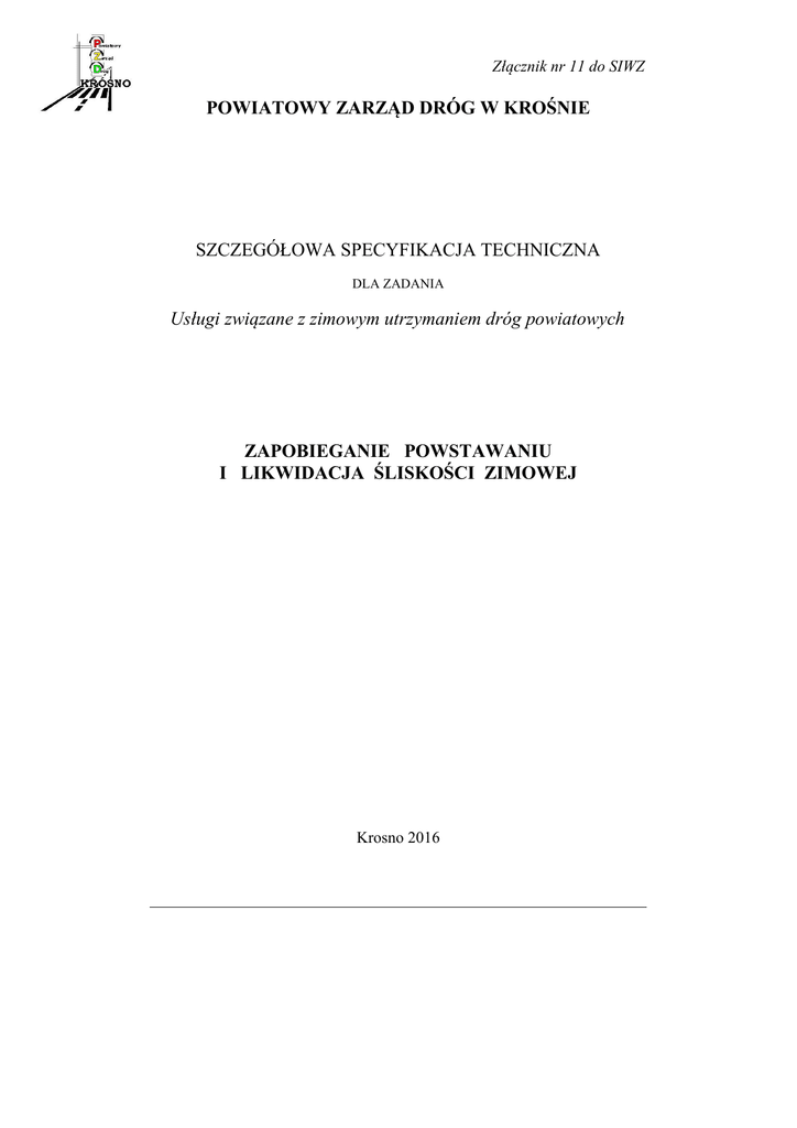 Złącznik nr 11 do SIWZ POWIATOWY ZARZĄD DRÓG W KROŚNIE SZCZEGÓŁOWA SPECYFIKACJA TECHNICZNA DLA ZADANIA Usługi związane z zimowym utrzymaniem dróg powiatowych ZAPOBIEGANIE POWSTAWANIU I LIKWIDACJA ŚLISKOŚCI ZIMOWEJ Krosno 2016 SPIS TREŚCI 1. WSTĘP ............................................................................................................................ 3 2. MATERIAŁY ................................................................................................................. 4 3. SPRZĘT .......................................................................................................................... 8 4. TRANSPORT ............................................................................................................... 12 5. WYKONANIE ROBÓT .............................................................................................. 12 6. KONTROLA JAKOŚCI ROBÓT .............................................................................. 18 7. OBMIAR ROBÓT ....................................................................................................... 20 8. ODBIÓR ROBÓT ........................................................................................................ 20 9. PODSTAWA PŁATNOŚCI ........................................................................................ 20 10. PRZEPISY ZWIĄZANE ............................................................................................. 20 11. ZAŁĄCZNIKI .............................................................................................................. 24 NAJWAŻNIEJSZE OZNACZENIA I SKRÓTY OST ST POWIAT GDDKiA IBDiM IMGW - ogólna specyfikacja techniczna - specyfikacja techniczna wykonania i odbioru robót budowlanych - Powiat Krośnieński - Generalna Dyrekcja Dróg Krajowych i Autostrad - Instytut Badawczy Dróg i Mostów - Instytut Meteorologii i Gospodarki Wodnej D-10.10.01c Zapobieganie powstawaniu i likwidacja śliskości zimowej 3 1. WSTĘP 1.1. Przedmiot SST Przedmiotem niniejszej szczegółowej specyfikacji technicznej (SST) są wymagania dotyczące wykonania i odbioru robót związanych z zapobieganiem powstawania i likwidacją śliskości zimowej na drodze. 1.2. Zakres stosowania SST Szczegółowa specyfikacja techniczna (SST) stanowi dokument przetargowy i kontraktowy przy zlecaniu i realizacji robót na drogach powiatowych dla zadnia: „Usługi związane z zimowym utrzymaniu dróg powiatowych na terenie Powiatu Krośnieńskiego ” 1.3. Zakres robót objętych SST Ustalenia zawarte w niniejszej specyfikacji dotyczą zasad prowadzenia robót związanych z wykonaniem i odbiorem robót przy zwalczaniu śliskości zimowej, obejmujących: zapobieganie powstawania śliskości zimowej, likwidację śliskości zimowej, przy zastosowaniu materiałów chemicznych, uszorstniających lub mechanicznych. 1.4. Określenia podstawowe 1.4.1. Zimowe utrzymanie dróg (ZUD) – prace mające na celu zmniejszenie lub ograniczenie zakłóceń ruchu drogowego, wywołanych czynnikami atmosferycznymi, jak śliskość zimowa oraz opady śniegu. 1.4.2. Śliskość zimowa - zjawisko występujące na drogach wskutek tworzenia się na jezdniach warstwy lodu albo zlodowaciałego lub ubitego śniegu. 1.4.3. Zwalczanie śliskości zimowej - zabiegi mające na celu zapobieganie występowaniu śliskości zimowej oraz zabiegi likwidujące powstałą śliskość zimową. 1.4.4. Zapobieganie występowaniu śliskości zimowej - uodpornienie nawierzchni drogi przed powstawaniem na niej warstwy lodu lub zlodowaciałego śniegu przez pokrycie jej środkami chemicznymi obniżającymi temperaturę zamarzania wody. 1.4.5. Likwidacja śliskości zimowej - usunięcie z nawierzchni drogi lodu lub zlodowaciałego albo ubitego śniegu przy użyciu środków chemicznych, uszorstniających lub mechanicznych albo środków tych łącznie. 1.4.6. Uszorstnienie lodu lub zlodowaciałego lub ubitego śniegu - posypanie nawierzchni kruszywem w celu zwiększenia czepności kół pojazdu z nawierzchnią. 1.4.7. Gołoledź - cienka warstwa lodu grubości do 1 mm powstała na skutek opadu na nawierzchnię o temperaturze ujemnej, mgły roszącej, mżawki lub deszczu. 1.4.8. Lodowica - warstwa lodu o grubości do kilku centymetrów, powstała z zamarzniętej, nie usuniętej z nawierzchni wody, pochodzącej ze stopnienia śniegu, lodu lub opadu deszczu. 1.4.9. Zlodowaciały lub ubity śnieg - warstwa śniegu w postaci: a) przymarzniętej do nawierzchni pozostałości nie usuniętej warstwy śniegu grubości kilku milimetrów, 4 Zapobieganie powstawaniu i likwidacja śliskości zimowej D-10.10.01c b) przymarzniętej do nawierzchni zlodowaciałej lub ubitej, nie usuniętej warstwy śniegu grubości kilku centymetrów, c) zlodowaciałej lub ubitej powierzchniowo warstwy śniegu o znacznej grubości. 1.4.10. Śliskość pośniegowa - rodzaj śliskości zimowej, powstającej w wyniku zalegania na jezdni przymarzniętej do nawierzchni pozostałości nie usuniętego ubitego śniegu, pokrywającego ją całkowicie lub częściowo warstewką o grubości kilku milimetrów. 1.4.11. Śliskość śniegowa - rodzaj śliskości zimowej, powstającej w wyniku zalegania na jezdni nie usuniętej warstwy śniegu grubości powyżej kilku centymetrów, którego górna warstwa lodowacieje (ruch pojazdów tworzy na niej zwykle różnej głębokości koleiny i wyboje pogarszające bezpieczeństwo i prędkość ruchu). 1.4.12. Szron - osad lodu, na ogół o wyglądzie krystalicznym, przybierający kształt lasek, igiełek itp., tworzący się w procesie bezpośredniej kondensacji pary wodnej z powietrza przy temperaturze poniżej 0°C. 1.4.13. Szadź - osad atmosferyczny utworzony z ziarenek lodu rozdzielonych pęcherzykami powietrza, powstający z nagłego zamarzania przechłodzonych kropelek wody (mgły lub chmury), gdy temperatura wyziębionych powierzchni jest niższa lub nieznacznie wyższa od 0°C. 1.4.14. Noś