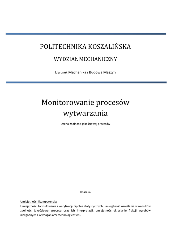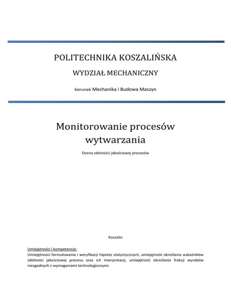 POLITECHNIKA KOSZALIŃSKA WYDZIAŁ MECHANICZNY kierunek Mechanika i Budowa Maszyn Monitorowanie procesów wytwarzania Ocena zdolności jakościowej procesów Koszalin Umiejętności i kompetencje: Umiejętności formułowania i weryfikacji hipotez statystycznych, umiejętność określania wskaźników zdolności jakościowej procesu oraz ich interpretacji, umiejętność określanie frakcji wyrobów niezgodnych z wymaganiami technologicznymi. Ocena zdolności jakościowej procesów o rozkładzie normalnym W procesie wytwarzania wielostopniowego wałka istotne jest zapewnienie wymaganej odchyłki , φ20 φ30 ± , , średnic czopów łożysk tocznych (średnica 1 wałka 20 , średnica 2 wałka 30 ) Dokonano pomiaru średnic wałka próbek pobieranych w odstępie 30 minut (każda z próbek zawierała 5 losowo wybranych wałków w 5 jednorodnych podgrupach z partii 100 sztuk). Wyniki pomiarów zestawiono w tablicy 1 i 2 (plik ocenazdolnoscip1.mat). Rysunek 1. Schemat wytwarzanego wałka z wyszczególnieniem monitorowanych wymiarów czopów łożysk tocznych Tablica 1. Wyniki pomiarów średnicy 1 wałka Podgrupa 1 Podgrupa 2 Podgrupa 3 Podgrupa 4 Podgrupa 5 1 2 3 4 5 1 2 3 4 5 1 2 3 4 5 1 2 3 4 5 1 2 3 4 5 Pod grup a1 1 2 1 2 3 4 20,027 19,999 19,984 19,993 20,001 19,995 20,024 20,034 19,969 19,970 19,996 20,003 20,000 20,010 19,990 20,035 20,011 19,997 20,001 19,979 19,978 19,983 20,007 20,022 19,994 20,009 19,980 19,988 19,994 20,008 20,013 20,012 19,988 19,998 20,011 20,008 20,003 20,037 20,031 20,000 19,972 19,983 19,985 20,027 19,984 19,985 19,976 20,006 19,995 20,010 20,014 19,987 20,012 20,006 19,963 20,011 19,991 20,005 19,979 20,018 19,978 19,989 19,986 20,015 20,012 20,027 19,988 19,975 19,983 20,007 20,007 19,985 20,039 20,009 20,022 20,026 19,989 20,006 20,002 20,004 20,012 20,009 20,012 20,015 19,989 19,984 19,988 20,013 19,964 20,002 19,986 20,042 19,973 20,004 19,937 20,017 19,990 20,025 20,005 20,005 11 12 13 14 19,978 19,996 20,017 19,983 20,010 19,996 20,065 20,003 Numer próbki 5 6 19,993 20,030 20,016 20,004 20,014 19,991 19,975 20,019 20,019 19,986 20,022 20,040 19,990 19,993 19,988 19,970 19,981 19,977 19,988 20,011 19,989 20,011 20,015 20,004 19,985 20,012 20,038 19,982 20,010 19,958 20,006 20,010 19,984 20,047 19,975 19,994 20,003 20,002 19,991 20,005 20,006 19,986 19,989 19,999 19,989 20,009 19,994 19,996 19,982 20,036 Numer próbki 15 16 19,996 20,020 20,022 19,978 7 8 9 10 20,003 19,998 19,999 19,986 19,994 19,996 19,981 19,993 19,986 20,007 20,001 20,036 20,014 19,999 19,993 20,017 20,005 19,987 20,049 19,987 20,022 19,979 20,005 19,995 19,973 20,011 19,998 19,983 19,990 20,017 20,013 19,991 20,007 20,001 20,009 20,030 20,001 20,022 20,016 20,013 19,975 19,966 20,004 19,988 20,004 19,977 19,997 20,005 19,977 20,011 19,990 20,015 20,012 19,957 20,014 20,003 19,964 20,019 20,031 19,992 19,998 20,014 19,997 19,994 20,005 19,995 20,005 20,029 19,973 19,956 20,001 20,030 19,988 20,014 19,999 19,994 20,032 20,039 20,005 20,035 19,986 20,010 19,956 19,969 20,042 19,959 19,967 20,004 19,968 19,990 20,000 19,995 19,993 19,998 20,019 20,025 19,998 20,013 19,994 19,999 17 18 19 20 20,003 19,969 20,001 19,994 19,991 19,974 20,030 19,978 Podgrupa 2 Podgrupa 3 Podgrupa 4 Podgrupa 5 3 4 5 1 2 3 4 5 1 2 3 4 5 1 2 3 4 5 1 2 3 4 5 19,990 20,010 19,962 19,969 20,002 20,031 19,986 19,993 19,966 20,014 20,018 20,037 20,022 20,001 20,002 20,022 20,015 19,983 20,011 20,002 19,988 20,001 19,997 19,994 20,026 19,998 19,989 19,969 20,017 19,985 20,022 20,001 19,979 19,987 20,008 19,999 20,017 19,975 20,010 20,036 20,016 19,999 19,988 19,982 19,993 20,002 20,016 19,984 20,012 20,026 19,994 20,007 19,995 19,934 20,046 19,981 19,962 20,027 20,021 20,024 19,991 19,998 20,031 20,016 19,951 19,992 19,982 20,008 19,987 19,995 20,023 20,018 19,984 20,021 19,981 19,983 19,974 20,009 19,973 20,013 19,993 19,969 19,973 20,020 20,000 20,020 19,993 20,004 20,006 19,979 20,023 19,986 19,961 19,985 19,990 19,974 19,992 20,013 19,982 19,983 20,019 20,001 20,009 20,010 20,024 20,017 19,998 20,033 19,997 19,970 20,046 19,992 19,999 20,003 19,976 19,967 19,994 19,982 19,971 19,966 19,973 20,028 20,009 19,985 20,000 20,020 19,985 20,005 20,031 20,031 20,012 20,019 19,992 19,996 20,001 19,988 20,036 20,011 19,975 20,002 20,009 19,993 19,975 20,053 20,021 19,973 19,996 20,006 19,995 20,011 20,024 19,972 20,012 19,998 19,993 20,003 20,016 20,032 19,986 19,997 19,996 20,026 20,006 19,966 20,002 20,013 20,018 20,004 20,024 19,994 20,000 19,996 19,987 19,982 20,008 20,016 20,027 19,950 19,970 19,979 20,006 20,020 19,975 20,029 19,985 20,026 20,002 20,058 19,999 20,007 19,959 20,025 20,019 19,959 19,981 19,969 20,032 20,011 20,029 19,982 19,999 20,001 20,009 19,994 20,021 20,006 19,974 20,000 19,953 19,981 20,039 19,976 19,974 20,004 19,985 19,992 20,009 20,018 19,982 19,990 19,999 20,017 20,045 19,972 20,003 19,984 20,021 20,013 20,014 20,013 7 8 9 10 30,011 29,978 30,028 29,994 29,968 29,996 30,014 30,056 29,976 29,933 29,955 29,995 29,994 30,025 30,028 29,996 29,959 30,033 30,044 29,992 30,028 29,949 29,947 29,967 30,042 29,939 30,039 30,035 30,03 29,971 30,022 30,038 30,004 29,987 30,001 30,055 29,958 29,97 30,036 30,031 30,028 29,972 29,99 30,028 30 30,039 30,009 30,011 30,002 29,996 30,077 29,958 29,915 30,009 30,031 30,021 29,991 29,995 30,012 29,982 29,994 29,986 29,981 29,984 30,019 30,005 30,01 29,991 29,982 30,017 30,048 29,954 29,947 30,012 30,011 29,987 30,018 29,981 30,016 30,047 30,014 29,971 29,995 30,011 Tablica 2. Wyniki pomiarów średnicy 2 wałka Podgrupa 1 Podgrupa 2 Podgrupa 3 Podgrupa 4 g r u 1 2 3 4 5 1 2 3 4 5 1 2 3 4 5 1 2 3 4 5 1 1 2 3 4 30,031 29,998 29,936 29,97 30,025 29,989 29,981 30,035 30,028 30,037 30,031 29,984 29,927 30,047 29,972 29,996 29,992 29,985 30,004 30,007 29,988 30,005 30,054 30,011 29,932 29,994 30 29,958 29,983 29,995 30,009 30,073 29,999 30,023 29,995 30,013 29,977 29,979 29,961 29,993 30,019 30,042 29,965 29,971 30,058 29,987 30,05 30,028 30,02 30,023 29,996 30,012