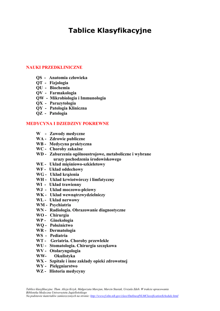 Tablice Klasyfikacyjne NAUKI PRZEDKLINICZNE QS QT QU QV QW QX QY QZ - Anatomia człowieka Fizjologia Biochemia Farmakologia Mikrobiologia i Immunologia Parazytologia Patologia Kliniczna Patologia MEDYCYNA I DZIEDZINY POKREWNE W WA WB WC WD WE WF WG WH WI WJ WK WL WM WN WO WP WQ WR WS WT WU WV WWWX WY WZ - Zawody medyczne Zdrowie publiczne Medycyna praktyczna Choroby zakaźne Zaburzenia ogólnoustrojowe, metaboliczne i wybrane urazy pochodzenia środowiskowego Układ mięśniowo-szkieletowy Układ oddechowy Układ krąŜenia Układ krwiotwórczy i limfatyczny Układ trawienny Układ moczowo-płciowy Układ wewnątrzwydzielniczy Układ nerwowy Psychiatria Radiologia. Obrazowanie diagnostyczne Chirurgia Ginekologia PołoŜnictwo Dermatologia Pediatria Geriatria. Choroby przewlekłe Stomatologia. Chirurgia szczękowa Otolaryngologia Okulistyka Szpitale i inne zakłady opieki zdrowotnej Pielęgniarstwo Historia medycyny Tablice klasyfikacyjne. Tłum. Alicja Krzyk, Małgorzata Marcjan, Marcin Stasiak, Urszula Zdeb. W trakcie opracowania Biblioteka Medyczna Uniwersytetu Jagiellońskiego Na podstawie materiałów zamieszczonych na stronie: http://wwwcf.nlm.nih.gov/class/OutlineofNLMClassificationSchedule.html NAUKI PRZEDKLINICZNE QS - Anatomia człowieka QS 1-132 Anatomia QS 504-539 Histologia QS 604-681 Embriologia QT - Fizjologia QT 1-33.1 Wydawnictwa informacyjne i ogólne QT 34-37.5 Fizyka. Matematyka. InŜynieria QT 104-172 Fizjologia człowieka QT 180-245 Fizjologia. Higiena QT 250-275 Czas wolny lub aktywność w czasie wolnym. Sport. Medycyna sportowa. QU - Biochemia QU 1-54 Wydawnictwa informacyjne i ogólne QU 55-70 Białka. Aminokwasy. Peptydy QU 75-99 Węglowodany. Lipidy QU 100-133 Biochemia człowieka. Metabolizm. QU 135-144 Enzymy QU 145-220 Witaminy QU 300-550 Komórki i genetyka QU 300-400 Komórki QU 450-550 Genetyka Tablice klasyfikacyjne. Tłum. Alicja Krzyk, Małgorzata Marcjan, Marcin Stasiak, Urszula Zdeb. W trakcie opracowania Biblioteka Medyczna Uniwersytetu Jagiellońskiego Na podstawie materiałów zamieszczonych na stronie: http://wwwcf.nlm.nih.gov/class/OutlineofNLMClassificationSchedule.html QV - Farmakologia QV 1-55 Wydawnictwa informacyjne i ogólne QV 60-75 Środki dermatologiczne. Środki gastroenterologiczne QV 76-115 Środki działające na układ nerwowy ośrodkowy. Środki znieczulające ogólnie, miejscowo i przewodowo QV 120-140 Środki działające na układ nerwowy autonomiczny (wegetatywny). Pierwiastki niemetaliczne i ich związki (farmakologia). Środki działające na połączenia nerwowo-mięśniowe QV 150-160 Środki działające na układ krąŜenia. Środki regulujące wydalanie wody. Diuretyki. Antydiuretyki QV 170-177 Środki wpływające na płodność, kontrolujące rozród QV 180-195 Środki hematologiczne QV 220-243 Środki odkaŜające miejscowo. Barwniki. Smoła QV 247-269 Środki przeciwzapalne. Środki przeciw zakaŜeniom QV 270-285 Woda. Elektrolity QV 290-318 Metale cięŜkie. Gazy QV 350-370 Środki przeciwbakteryjne. Wyciągi tkankowe QV 600-667 Toksykologia QV 600-607 Toksykologia ogólnie QV 610-618 Trucizny nieorganiczne QV 627-633 Trucizny organiczne QV 662-667 Gazy trujące. Środki chemiczne QV 701-835 Farmacja i leki QV 701-737 Farmacja i leki ogólnie QV 738-772 Standaryzacja leku. Farmakognozja. Rośliny lecznicze QV 773-835 Procesy farmaceutyczne. Pakowanie. Informacja o leku QW - Mikrobiologia. Immunologia QW 1-300 Mikrobiologia QW 1-52 Wydawnictwa informacyjne i ogólne QW 55-85 Mikrobiologia środowiska QW 115-155 Bakterie QW 160-170 Wirusy QW 180-190 Grzyby. Przetrwalniki (Spory) bakteryjne QW 300 Wojna biologiczna QW 501-949 Immunologia QW 501-540 Wydawnictwa informacyjne. Immunologia ogólna Tablice klasyfikacyjne. Tłum. Alicja Krzyk, Małgorzata Marcjan, Marcin Stasiak, Urszula Zdeb. W trakcie opracowania Biblioteka Medyczna Uniwersytetu Jagiellońskiego Na podstawie materiałów zamieszczonych na stronie: http://wwwcf.nlm.nih.gov/class/OutlineofNLMClassificationSchedule.html QW 541-568 Rodzaje odporności QW 570-630.5 Antygeny i przeciwciała. Toksyny i antytoksyny QW 640-730 Odpowiedź immunologiczna QW 800-949 Immunoterapia i nadwraŜliwość QX - Parazytologia QX 1-45 Wydawnictwa informacyjne i ogólne QX 50-195 Pierwotniaki QX 200-451 Robaki pasoŜytnicze. Pierścienice QX 460-483 Stawonogi QX 500-675 Owady. Inne pasoŜyty QY - Patologia kliniczna QY 1-39 Wydawnictwa informacyjne i ogólne QY 50-110 Zwierzęta laboratoryjne. Techniki laboratoryjne QY 120-350 Testy diagnostyczne QY 400-490 Krew. Chemia krwi QZ - Patologia QZ 1-39 Wydawnictwa informacyjne i ogólne QZ 40-109 Patogeneza. Etiologia QZ 140-190 Objawy chorób QZ 200-380 Nowotwory ogólnie. Torbiele ogólnie Tablice klasyfikacyjne. Tłum. Alicja Krzyk, Małgorzata Marcjan, Marcin Stasiak, Urszula Zdeb. W trakcie opracowania Biblioteka Medyczna Uniwersytetu Jagiellońskiego Na podstawie materiałów zamieszczonych na stronie: http://wwwcf.nlm.nih.gov/class/OutlineofNLMClassificationSchedule.html MEDYCYNA I DZIEDZINY POKREWNE W - Zawody medyczne W 1-28 Wydawnictwa informacyjne i ogólne W 32-64 Prawo. Etyka. Stosunki personel-pacjent W 74-80 Ekonomika opieki lekarskiej W 82-83.1 Technologia biomedyczna W 84-85.5 Opieka zdrowotna. Ochrona praw pacjenta W 87-96 Praktyka zawodowa W 100-275 Planowanie opieki medycznej, stomatologicznej i farmaceutycznej W 322-323 Opieka społeczna medyczna W 601-925 Nauki sądowe W 601-750 Wydawnictwa informacyjne i ogólne W 775-867 Badania medyczno-prawne W 900-925 Ocena niepełnosprawności. Odszkodowanie WA - Zdrowie Publiczne WA 1-106 Wydawnictwa informacyjne i ogólne WA 108-245 Medycyna zapobiegawcza WA 250-295 Zapobieganie wypadkom i urazom WA 300-395 Problemy zdrowotne poszczególnych grup ludzi WA 400-495 Medycyna pracy, zdrowie, choroby zawodowe, bezpieczeństwo i higiena w środowisku pracy WA 525-590 Administracja i organizacja opieki zdrowotnej WA670-847 Warunki sanitarne. Kontrola środowiska WA 670-672.1 Wa
