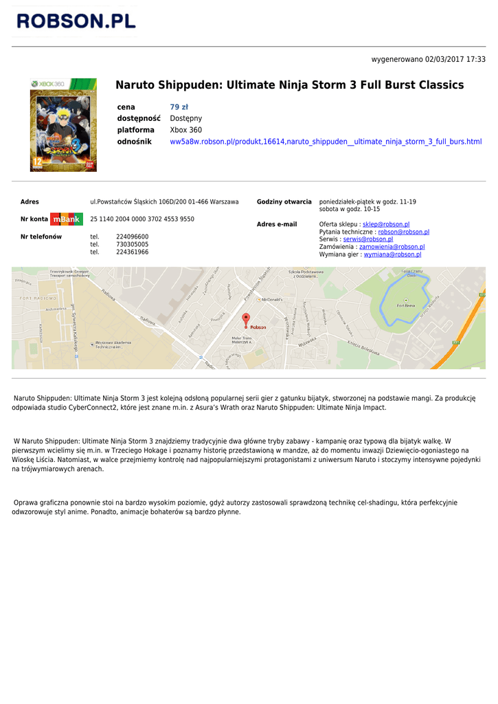 wygenerowano 02/03/2017 17:33 Naruto Shippuden: Ultimate Ninja Storm 3 Full Burst Classics cena 79 zł dostępność Dostępny platforma Xbox 360 odnośnik ww5a8w.robson.pl/produkt,16614,naruto_shippuden__ultimate_ninja_storm_3_full_burs.html Adres ul.Powstańców Śląskich 106D/200 01-466 Warszawa Nr konta 25 1140 2004 0000 3702 4553 9550 Nr telefonów tel. 224096600 tel. 730305005 tel. 224361966 Godziny otwarcia poniedziałek-piątek w godz. 11-19 sobota w godz. 10-15 Adres e-mail Oferta sklepu : [email protected] Pytania techniczne : [email protected] Serwis : [email protected] Zamówienia : [email protected] Wymiana gier : [email protected] Naruto Shippuden: Ultimate Ninja Storm 3 jest kolejną odsłoną popularnej serii gier z gatunku bijatyk, stworzonej na podstawie mangi. Za produkcję odpowiada studio CyberConnect2, które jest znane m.in. z Asura’s Wrath oraz Naruto Shippuden: Ultimate Ninja Impact. W Naruto Shippuden: Ultimate Ninja Storm 3 znajdziemy tradycyjnie dwa główne tryby zabawy - kampanię oraz typową dla bijatyk walkę. W pierwszym wcielimy się m.in. w Trzeciego Hokage i poznamy historię przedstawioną w mandze, aż do momentu inwazji Dziewięcio-ogoniastego na Wioskę Liścia. Natomiast, w walce przejmiemy kontrolę nad najpopularniejszymi protagonistami z uniwersum Naruto i stoczymy intensywne pojedynki na trójwymiarowych arenach. Oprawa graficzna ponownie stoi na bardzo wysokim poziomie, gdyż autorzy zastosowali sprawdzoną technikę cel-shadingu, która perfekcyjnie odwzorowuje styl anime. Ponadto, animacje bohaterów są bardzo płynne.