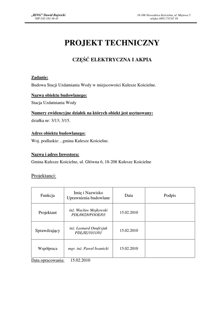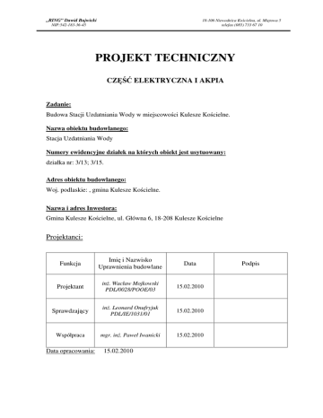„RING” Dawid Bujwicki 18-106 Niewodnica Kościelna, ul. Miętowa 5 telefax (085) 733 67 10 NIP:542-183-36-45 PROJEKT TECHNICZNY CZĘŚĆ ELEKTRYCZNA I AKPIA Zadanie: Budowa Stacji Uzdatniania Wody w miejscowości Kulesze Kościelne. Nazwa obiektu budowlanego: Stacja Uzdatniania Wody Numery ewidencyjne działek na których obiekt jest usytuowany: działka nr: 3/13; 3/15. Adres obiektu budowlanego: Woj. podlaskie: , gmina Kulesze Kościelne. Nazwa i adres Inwestora: Gmina Kulesze Kościelne, ul. Główna 6, 18-208 Kulesze Kościelne Projektanci: Funkcja Imię i Nazwisko Uprawnienia budowlane Data Projektant inż. Wacław Mojkowski PDL/0028/POOE/03 15.02.2010 Sprawdzający inż. Leonard Onufryjuk PDL/IE/1031/01 15.02.2010 Współpraca mgr. inż. Paweł Iwanicki 15.02.2010 Data opracowania: 15.02.2010 Podpis „RING” Dawid Bujwicki NIP:542-183-36-45 18-106 Niewodnica Kościelna, ul. Miętowa 5 telefax (085) 733 67 10 „RING” Dawid Bujwicki 18-106 Niewodnica Kościelna, ul. Miętowa 5 telefax (085) 733 67 10 NIP:542-183-36-45 Spis zawartości projektu I – Opis projektu 1. PODSTAWA OPRACOWANIA ............................................................ 5 2. PRZEDMIOT OPRACOWANIA........................................................... 5 3. ZAKRES OPRACOWANIA ................................................................... 5 3.1. LINIE KABLOWE: .................................................................................... 5 3.2. INSTALACJE WEWNĘTRZNE: ................................................................... 5 3.3. SZAFY .................................................................................................... 5 4. MATERIAŁY WYKORZYSTANE PRZY OPRACOWANIU .......... 5 5. STEROWANIE PRACĄ STACJI UZDATNIANIA WODY .............. 6 6. PROJEKTOWANE ROZWIĄZANIA .................................................. 7 6.1. PARAMETRY ZASILANIA SUW ............................................................... 7 6.2. ZESTAWIENIE MOCY............................................................................... 7 6.3. SZAFY ROZDZIELCZE W BUDYNKU SUW................................................ 8 6.3.1. 6.3.2. Rozdzielnia główna RE ................................................................................... 8 Szafa Technologiczna SSS .............................................................................. 9 6.4. INSTALACJE WEWNĘTRZNE .................................................................. 11 6.4.1. 6.4.2. Instalacje oświetleniowe i gniazd jedno/trójfazowych budynku SUW ......... 11 Instalacja technologiczna............................................................................... 12 6.5. INSTALACJE ZEWNĘTRZNE ................................................................... 13 6.5.1. Instalacja uziemienia i ochrony odgromowej ................................................ 13 6.6. INSTALACJA POŁĄCZEŃ WYRÓWNAWCZYCH ........................................ 14 6.7. LINIE KABLOWE ................................................................................... 15 6.7.1. 6.7.2. 6.7.3. 6.7.4. ZW3 6.7.5. Linie kablowe - Wytyczne montażowe ......................................................... 15 Linia kablowa z budynku SUW do pompy głębinowej PG1......................... 15 Linia kablowa z budynku SUW do pompy głębinowej PG2......................... 15 Linia kablowa z budynku SUW do zbiornika wyrównawczego ZW1, ZW2 i 16 Linia kablowa z budynku SUW do osadnika popłuczyn OP ........................ 16 6.8. ZESTAW HYDROFOROWY ..................................................................... 16 6.9. POWIADAMIANIE SMS ......................................................................... 17 6.10. ZASILANIE AWARYJNE STACJI ........................................................... 17 6.11. WIZUALIZACJA ................................................................................. 17 6.12. KOMUNIKACJA RADIOWA SUW I STANOWISKA WIZUALIZACJI ......... 19 6.13. POMIARY .......................................................................................... 19 7. UWAGI KOŃCOWE ............................................................................. 20 8. INFORMACJA BIOZ - INFORMACJA DOTYCZĄCA BEZPIECZEŃSTWA I OCHRONY ZDROWIA...................................... 21 „RING” Dawid Bujwicki NIP:542-183-36-45 18-106 Niewodnica Kościelna, ul. Miętowa 5 telefax (085) 733 67 10 8.1. ZAKRES RZECZOWY ROBÓT:................................................................. 21 8.2. ELEMENTY ZAGOSPODAROWANIA DZIAŁKI LUB TERENU MOGĄCE STWARZAĆ ZAGROŻENIE BEZPIECZEŃSTWA I ZDROWIA LUDZI ....................... 21 8.3. PRZEWIDYWANE ZAGROŻENIA WYSTĘPUJĄCE PODCZAS REALIZACJI NASTĘPUJĄCYCH ROBÓT: ............................................................................... 21 8.4. SPOSÓB PROWADZENIA INSTRUKTAŻU PRACOWNIKÓW PRZED PRZYSTĄPIENIEM DO REALIZACJI ROBÓT SZCZEGÓLNIE NIEBEZPIECZNYCH: ... 21 8.5. OSOBA ODPOWIEDZIALNA ZA INSTRUKTAŻ PRACOWNIKÓW- KIEROWNIK BUDOWY ........................................................................................................ 21 8.6. ŚRODKI TECHNICZNE I ORGANIZACYJNE ZAPOBIEGAJĄCE NIEBEZPIECZEŃSTWOM WYNIKAJĄCYM Z WYKONYWANIA ROBÓT BUDOWLANYCH W STREFACH SZCZEGÓLNEGO ZAGROŻENIA ZDROWIA LUB W ICH SĄSIEDZTWIE: .......................................................................................... 22 II – Oświadczenie projektanta III – Uprawniania projektanta IV – Rysunki 1. 2. 3. 4. 5. 6. Rysunek nr 1 – Zagospodarowanie terenu Rysunek nr 2 – Schemat rozmieszczenia opraw oświetleniowych Rysunek nr 3 – Schemat rozmieszczenia gniazd elektrycznych Rysunek nr 4 – Schemat jednokreskowy Rysunek nr 5 – Schemat rozmieszczenia koryt kablowych Rysunek nr 6 – Schemat instalacji uziemiającej i odgromowej budynku SUW V – Schemat szafy sterującej SSS „RING” Dawid Bujwicki 18-106 Niewodnica Kościelna, ul. Miętowa 5 telefax (085) 73