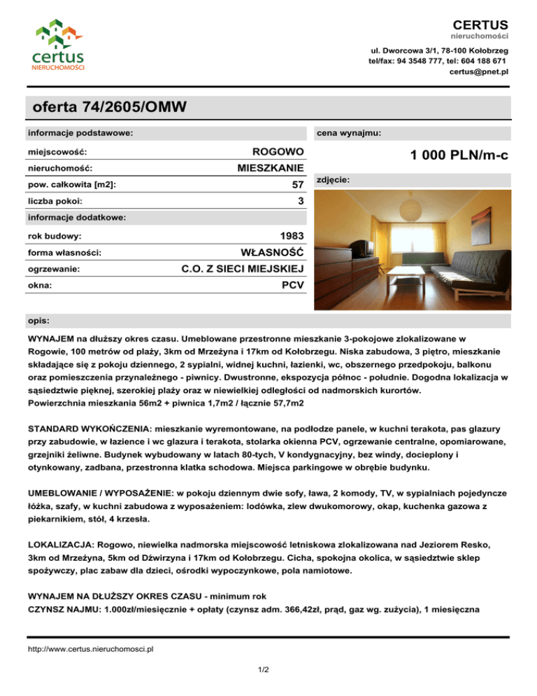 CERTUS nieruchomości ul. Dworcowa 3/1, 78-100 Kołobrzeg tel/fax: 94 3548 777, tel: 604 188 671 [email protected] oferta 74/2605/OMW informacje podstawowe: miejscowość: nieruchomość: cena wynajmu: ROGOWO 1 000 PLN/m-c MIESZKANIE 57 pow. całkowita [m2]: zdjęcie: 3 liczba pokoi: informacje dodatkowe: 1983 rok budowy: forma własności: ogrzewanie: WŁASNOŚĆ C.O. Z SIECI MIEJSKIEJ PCV okna: opis: WYNAJEM na dłuższy okres czasu. Umeblowane przestronne mieszkanie 3-pokojowe zlokalizowane w Rogowie, 100 metrów od plaży, 3km od Mrzeżyna i 17km od Kołobrzegu. Niska zabudowa, 3 piętro, mieszkanie składające się z pokoju dziennego, 2 sypialni, widnej kuchni, łazienki, wc, obszernego przedpokoju, balkonu oraz pomieszczenia przynależnego - piwnicy. Dwustronne, ekspozycja północ - południe. Dogodna lokalizacja w sąsiedztwie pięknej, szerokiej plaży oraz w niewielkiej odległości od nadmorskich kurortów. Powierzchnia mieszkania 56m2 + piwnica 1,7m2 / łącznie 57,7m2 STANDARD WYKOŃCZENIA: mieszkanie wyremontowane, na podłodze panele, w kuchni terakota, pas glazury przy zabudowie, w łazience i wc glazura i terakota, stolarka okienna PCV, ogrzewanie centralne, opomiarowane, grzejniki żeliwne. Budynek wybudowany w latach 80-tych, V kondygnacyjny, bez windy, docieplony i otynkowany, zadbana, przestronna klatka schodowa. Miejsca parkingowe w obrębie budynku. UMEBLOWANIE / WYPOSAŻENIE: w pokoju dziennym dwie sofy, ława, 2 komody, TV, w sypialniach pojedyncze łóżka, szafy, w kuchni zabudowa z wyposażeniem: lodówka, zlew dwukomorowy, okap, kuchenka gazowa z piekarnikiem, stół, 4 krzesła. LOKALIZACJA: Rogowo, niewielka nadmorska miejscowość letniskowa zlokalizowana nad Jeziorem Resko, 3km od Mrzeżyna, 5km od Dźwirzyna i 17km od Kołobrzegu. Cicha, spokojna okolica, w sąsiedztwie sklep spożywczy, plac zabaw dla dzieci, ośrodki wypoczynkowe, pola namiotowe. WYNAJEM NA DŁUŻSZY OKRES CZASU - minimum rok CZYNSZ NAJMU: 1.000zł/miesięcznie + opłaty (czynsz adm. 366,42zł, prąd, gaz wg. zużycia), 1 miesięczna http://www.certus.nieruchomosci.pl 1/2 CERTUS nieruchomości ul. Dworcowa 3/1, 78-100 Kołobrzeg tel/fax: 94 3548 777, tel: 604 188 671 [email protected] kaucja. ISTNIEJE MOŻLIWOŚĆ ZAKUPU - CENA MIESZKANIA 270.000zł OFERTA http://www.certus.nieruchomosci.pl/oferta/396/2605/OMS W celu uzyskania szczegółowych informacji o ofercie prosimy o kontakt telefoniczny, bądź mailowy http://www.certus.nieruchomosci.pl 2/2