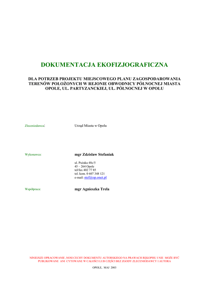 DOKUMENTACJA EKOFIZJOGRAFICZNA DLA POTRZEB PROJEKTU MIEJSCOWEGO PLANU ZAGOSPODAROWANIA TERENÓW POŁOŻONYCH W REJONIE OBWODNICY PÓŁNOCNEJ MIASTA OPOLE, UL. PARTYZANCKIEJ, UL. PÓŁNOCNEJ W OPOLU Zleceniodawca: Urząd Miasta w Opolu Wykonawca: mgr Zdzisław Stefaniak ul. Pużaka 48c/5 45 – 264 Opole tel/fax 402 77 85 tel. kom. 0 607 348 121 e-mail: [email protected] Współpraca: mgr Agnieszka Trela NINIEJSZE OPRACOWANIE ,NOSI CECHY DOKUMENTU AUTORSKIEGO NA PRAWACH RĘKOPISU I NIE MOŻE BYĆ PUBLIKOWANE ANI CYTOWANE W CAŁOŚCI LUB CZĘŚCI BEZ ZGODY ZLECENIODAWCY I AUTORA OPOLE, MAJ 2003 SPIS TREŚCI 1. Wprowadzenie 2. Metodyka pracy 3. Wykorzystane materiały 4. Omówienie i ocena podkładu mapowego 5. Położenie terenu badań 6. Charakterystyka poszczególnych komponentów środowiska przyrodniczego oraz ich wzajemnych powiązań 6.1. Charakterystyka poszczególnych elementów środowiska 6.2. Charakterystyka dotychczasowych zmian środowiska 6.3. Charakterystyka struktury przyrodniczej 6.4. Charakterystyka powiązań przyrodniczych 6.5. Walory krajobrazowe i kulturowe 6.6. Prawne formy ochrony środowiska przyrodniczego 6.7. Charakterystyka jakości i zagrożeń środowiska wraz z identyfikacją źródeł 7. Diagnoza stanu środowiska przyrodniczego 7.1. Ocena odporności środowiska na degradację oraz zdolności do regeneracji 7.2. Ocena stanu ochrony i użytkowania zasobów przyrodniczych 7.3. Ocena stanu zachowania walorów krajobrazowych oraz możliwości ich kształtowania 7.4. Ocena zgodności dotychczasowego użytkowania i zagospodarowania obszaru z cechami i uwarunkowaniami przyrodniczymi 7.5. Ocena jakości stanu środowiska oraz jego zagrożeń i możliwości ich minimalizacji 8. Wstępna prognoza dalszych zmian środowiska przyrodniczego 9. Przyrodnicze predyspozycje dla kształtowania struktury funkcjonalno - przestrzennej 10. Ocena przydatności funkcjonalno – przestrzennej środowiska przyrodniczego 10.1. Ocena możliwości rozwoju dla różnych rodzajów użytkowania terenu 10.2. Ocena ograniczeń dla i form zagospodarowania terenu 11. Uwarunkowania ekofizjograficzne – okreśłenie przydatności terenu dla realizacji funkcj 1 3 4 5 6 7 7 27 28 29 31 31 31 38 38 39 39 40 40 43 45 47 47 48 52 1 1. WPROWADZENIE. Niniejsza dokumentacja ekofizjograficzna została wykonana na podstawie umowy z dnia 08.04.2003 r. zawartej pomiędzy wykonawcą a Prezydentem miasta Opole dla potrzeb projektu miejscowego planu zagospodarowania terenów położonych w rejonie obwodnicy północnej miasta Opola, ul. Partyzanckiej, ul. Północnej w Opolu. Dokumentacja niniejsza stanowi dokumentację ekofizjograficzną podstawową w rozumieniu art. 72 ust 5 Ustawy z dnia 27 kwietnia 2001 r. – Prawo ochrony środowiska (Dz.U. nr 62, poz. 627 z 20.06.2001 r.) i sporządzone zostało w zakresie określonym w Rozporządzenia Ministra Środowiska z dnia 9 września 2002 r. w sprawie opracowań fizjograficznych (Dz.U. nr 155, poz. 1298). Celem dokumentacji ekofizjograficznej jest stworzenie podstaw dla podejmowania decyzji planistycznych zgodnych z zasadami zrównoważonego rozwoju, gdzie do najważniejszych kwestii należą: możliwość odtwarzania zasobów naturalnych, racjonalne użytkowanie zasobów nieodnawialnych oraz zagospodarowanie przestrzenne nie przekraczające naturalnych progów chłonności środowiska. Opracowanie jest dokumentacją sporządzaną przed podjęciem prac nad opracowaniem planu zagospodarowania przestrzennego i stanowi podstawę dla rozwiązań przestrzennych i ustaleń planistycznych, wynikających z rozpoznania i oceny lokalnych warunków środowiska geograficznego. Zakres przeprowadzonych prac badawczych i analitycznych przeprowadzono pod kątem realizacji następujących celów: - dostosowania funkcji, struktury i intensywności zagospodarowania przestrzennego do uwarunkowań przyrodniczych - zapewnienia trwałości podstawowych procesów przyrodniczych na obszarze objętym dokumentem planistycznym - zapewnienia warunków odnawialności zasobów przyrodniczych - eliminowania lub ograniczania zagrożeń i uciążliwości negatywnie oddziaływujących na środowisko i zdrowie ludzi - ustalenia kierunków rekultywacji i restytucji terenów znajdujących się pod wpływem procesów degradujących Dokumentacja ekofizjograficzna dla potrzeb projektu miejscowego planu zagospodarowania terenów położonych w rejonie obwodnicy północnej miasta Opola, ul. Partyzanckiej, ul. Północnej w Opolu. 2 Dokumentacja obejmuje następujące zagadnienia: - rozpoznanie i charakterystykę stanu i funkcjonowania środowiska ze szczególnym uwzględnieniem poszczególnych elementów przyrodniczych środowiska i ich wzajemnych powiązań oraz procesów zachodzących w środowisku - diagnozę stanu i funkcjonowania środowiska ze szczególnym uwzględnieniem odporności komponentów środowiska na degradację i jego zdolność do regeneracji, oceną użytkowania zasobów przyrodniczych, zachowania walorów krajobrazowych i możliwości ich kształtowania, zgodności użytkowania i zagospodarowania obszaru z cechami i uwarunkowaniami przyrodniczymi, oceną charakteru i intensywności zmian zachodzących w środowisku i możliwości minimalizacji zagrożeń środowiskowych - wstępną prognozę zmian środowiska z określeniem kierunków i intensywności przewidywanej intensywności niepożądanych przekształceń i degradacji środowiska, wynikające z dotychczasowego użytkowania i zagospodarowania - określenie predyspozycji terenu dla pełnienia funkcji przyrodniczych w kształtowanej strukturze funkcjonalno – przestrzennej obszaru planistycznego - ocenę przydatności środowiska z określeniem możliwości rozwoju i ograniczeń dla różnych rodzajów użytkowania i form zagospodarowania terenu - uwarunkowania ekofizjograficzne w postaci wniosków z analiz i ocen obejmujące określenie przydatności poszczególnych terenów dla rozwoju funkcji użytkowych, wskazanie terenów
