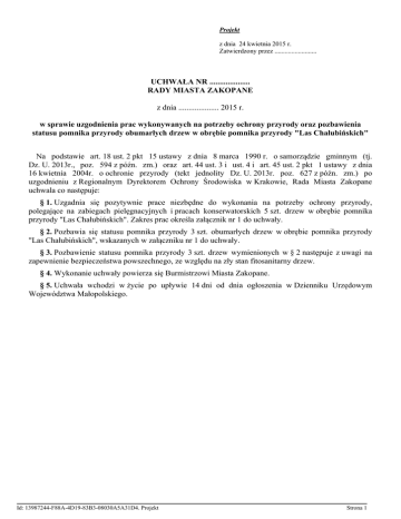 Projekt z dnia 24 kwietnia 2015 r. Zatwierdzony przez ......................... UCHWAŁA NR .................... RADY MIASTA ZAKOPANE z dnia .................... 2015 r. w sprawie uzgodnienia prac wykonywanych na potrzeby ochrony przyrody oraz pozbawienia statusu pomnika przyrody obumarłych drzew w obrębie pomnika przyrody "Las Chałubińskich" Na podstawie art. 18 ust. 2 pkt 15 ustawy z dnia 8 marca 1990 r. o samorządzie gminnym (tj. Dz. U. 2013r., poz. 594 z późn. zm.) oraz art. 44 ust. 3 i ust. 4 i art. 45 ust. 2 pkt 1 ustawy z dnia 16 kwietnia 2004r. o ochronie przyrody (tekt jednolity Dz. U. 2013r. poz. 627 z późn. zm.) po uzgodnieniu z Regionalnym Dyrektorem Ochrony Środowiska w Krakowie, Rada Miasta Zakopane uchwala co następuje: § 1. Uzgadnia się pozytywnie prace niezbędne do wykonania na potrzeby ochrony przyrody, polegające na zabiegach pielęgnacyjnych i pracach konserwatorskich 5 szt. drzew w obrębie pomnika przyrody "Las Chałubińskich". Zakres prac określa załącznik nr 1 do uchwały. § 2. Pozbawia się statusu pomnika przyrody 3 szt. obumarłych drzew w obrębie pomnika przyrody "Las Chałubińskich", wskazanych w załączniku nr 1 do uchwały. § 3. Pozbawienie statusu pomnika przyrody 3 szt. drzew wymienionych w § 2 następuje z uwagi na zapewnienie bezpieczeństwa powszechnego, ze względu na zły stan fitosanitarny drzew. § 4. Wykonanie uchwały powierza się Burmistrzowi Miasta Zakopane. § 5. Uchwała wchodzi w życie po upływie 14 dni od dnia ogłoszenia w Dzienniku Urzędowym Województwa Małopolskiego. Id: 13987244-F88A-4D19-83B3-08030A5A31D4. Projekt Strona 1 Załącznik do Uchwały Nr .................... Rady Miasta Zakopane z dnia .................... 2015r. Pomnik przyrody „Las Chałubińskich” – nr rej. woj. 121701-007 utworzonego na podstawie Rozp. Woj. Małop. Nr 1/2001 z dn. 04.01.2001r. (Dz. Urz Woj. Małop. Nr 4 poz.15) wraz z aktualizacją Rozp. Nr 3/09 Woj. Małop. z dn. 31.07.2009r. (Dz. Urz. Woj. Małop. Nr 493, poz. 3697), zlokalizowany na dz. ew. nr 305/1, 302 obr. 12 przy ulicach: Zamoyskiego, Chałubińskiego i Bulwary Słowackiego w Zakopanem. Nazwa Stan Obwód Nr gatunkowa Wys. zdrowotny Zabiegi pielęgnacyjne L.p. pnia* [nazwa polska] Lokalizacja Prace konserwatorskie inw. [m] [cm] [nazwa łacińska] (dz. ew. nr) dostateczny cięcie sanitarne, mechaniczne buk pospolity 1. 1 205 16 dz. ew. nr 305/1 wzmocnienie części korony Fagus sylvatica 305/2 narażonych na wyłamanie cięcie sanitarne, mechaniczne buk pospolity niedostateczny wzmocnienie części korony 2. 2 274 13 Fagus sylvatica dz. ew. nr 305/1 narażonych na wyłamanie buk pospolity dobry 3. 3 237 18 cięcie sanitarne Fagus sylvatica dz. ew. nr 305/1 buk pospolity dobry 4. 4 230 20 cięcie sanitarne Fagus sylvatica dz. ew. nr 305/1 buk pospolity dobry 5. 5 220 19 cięcie sanitarne Fagus sylvatica dz. ew. nr 305/1 6. 7. 8. 6 świerk pospolity Picea abies 7 świerk pospolity Picea abies 8 świerk pospolity Picea abies 232 100 157 24 obumarłe dz. ew. nr 302 usunięcie drzewa, które utraciło wartości przyrodnicze, celem zapewnienia bezpieczeństwa powszechnego 15 obumarłe dz. ew. nr 302 usunięcie drzewa, które utraciło wartości przyrodnicze, celem zapewnienia bezpieczeństwa powszechnego 14 obumarłe dz. ew. nr 302 usunięcie drzewa, które utraciło wartości przyrodnicze, celem zapewnienia bezpieczeństwa powszechnego * Obwód pnia drzewa mierzony na wys. 130 cm od poziomu gruntu Id: 13987244-F88A-4D19-83B3-08030A5A31D4. Projekt Strona 1 Uzasadnienie W związku z przeprowadzeniem przez pracownika tut. Urzędu oceny stanu zachowania pomnika przyrody „Las Chałubińskich” - nr rej. woj. 121701-007, utworzonego na podstawie Rozp. Woj. Małop. Nr 1/2001 z dn. 04.01.2001r. (Dz. Urz Woj. Małop. Nr 4 poz.15) oraz koniecznością wykonania zabiegów pielęgnacyjnych i prac konserwatorskich w obrębie drzewostanu, Gmina Miasto Zakopane wystapiła do Małopolskiego Urzędu Wojewódzkiego z wnioskiem o przyznanie dotacji na przeprowadzenie prac pielęgnacyjnych przy niniejszym pomniku przyrody. W ramach przyznanego dofinansowania zostaną przeprowadzone prace wykonywane na potrzeby ochrony przyrody, polegające na wykonaniu zabiegów pielęgnacyjnych i prac konserwatorskich drzew w obrębie pomnika przyrody "Las Chałubińskich". Ponadto z uwagi na utratę wartości przyrodniczych 3 szt. obumarłych drzew z gatunku świerk pospolity (Picea abies) zachodzi konieczność zniesienia formy ochrony przyrody. Pozbawienie statusu pomnika przyrody 3 szt. drzew uzgadnia się celem zapewnienia bezpieczeństwa powszechnego. Zgodnie z art. 45 ust. 2 pkt 1 ustawy z dnia 16 kwietnia 2004r. o ochronie przyrody (tekst jednolity Dz. U. 2013r. poz. 627 z późn. zm.) rada gminy jako organ ustanawiający pomnik przyrody uzgadnia w drodze uchwały prace niezbędne do wykonania na potrzeby ochrony przyrody. Na podstawie z art. 44 ust. ustawy z dnia 16 kwietnia 2004r. o ochronie przyrody (tekst jednolity Dz. U. 2013r. poz. 627 z późn. zm.) rada gminy ustanawia i znosi formy ochrony przyrody, takie jak np. pomnik przyrody, w drodze uchwały. Zniesienia form ochrony przyrody rada gminy może dokonać w razie utraty wartości przyrodniczych, ze względu na które ustanowiono pomnik przyrody oraz celem zapewnienia bezpieczeństwa powszechnego. Projekt uchwały w sprawie pozbawienia statusu pomnika przyrody wymaga uzgodnienia z właściwym Regionalnym Dyrektorem Ochrony Środowiska. Biorąc powyższe fakty pod uwagę, proponuje się podjęcie uchwały w sprawie uzgodnienia zabiegów pielęgnacyjnych i prac konserwatorskich drzew pomnikowych oraz pozbawienia statusu pomnika przyrody obumarłych drzew w obrębie pomnika przyrody „Las Chałubińskich”, zlokalizowanych na działkach ew. nr: 305/1, 302 obr. 12 przy ul. Zamoyskiego i ul. Chałubińskiego w Zakopanem. Projekt Uchwały został uzgodniony przez Regionalną Dyrekcję Ochrony Środowiska w Krakowie pismem znak: OP-I.623