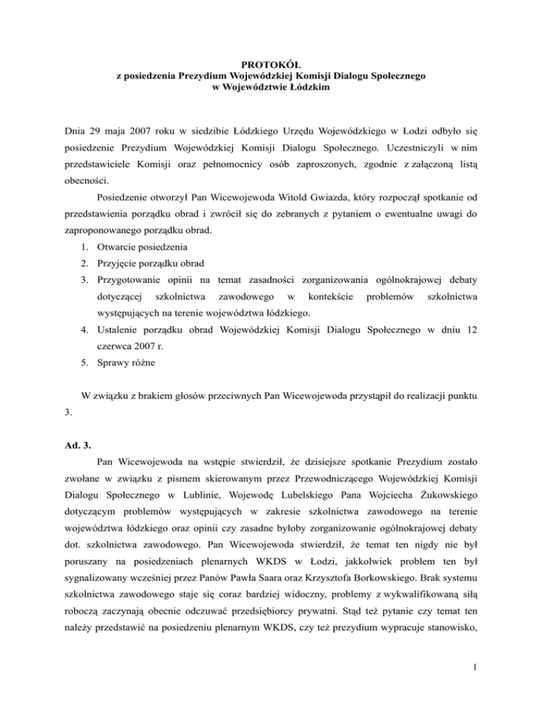 PROTOKÓŁ z posiedzenia Prezydium Wojewódzkiej Komisji Dialogu Społecznego w Województwie Łódzkim Dnia 29 maja 2007 roku w siedzibie Łódzkiego Urzędu Wojewódzkiego w Łodzi odbyło się posiedzenie Prezydium Wojewódzkiej Komisji Dialogu Społecznego. Uczestniczyli w nim przedstawiciele Komisji oraz pełnomocnicy osób zaproszonych, zgodnie z załączoną listą obecności. Posiedzenie otworzył Pan Wicewojewoda Witold Gwiazda, który rozpoczął spotkanie od przedstawienia porządku obrad i zwrócił się do zebranych z pytaniem o ewentualne uwagi do zaproponowanego porządku obrad. 1. Otwarcie posiedzenia 2. Przyjęcie porządku obrad 3. Przygotowanie opinii na temat zasadności zorganizowania ogólnokrajowej debaty dotyczącej szkolnictwa zawodowego w kontekście problemów szkolnictwa występujących na terenie województwa łódzkiego. 4. Ustalenie porządku obrad Wojewódzkiej Komisji Dialogu Społecznego w dniu 12 czerwca 2007 r. 5. Sprawy różne W związku z brakiem głosów przeciwnych Pan Wicewojewoda przystąpił do realizacji punktu 3. Ad. 3. Pan Wicewojewoda na wstępie stwierdził, że dzisiejsze spotkanie Prezydium zostało zwołane w związku z pismem skierowanym przez Przewodniczącego Wojewódzkiej Komisji Dialogu Społecznego w Lublinie, Wojewodę Lubelskiego Pana Wojciecha Żukowskiego dotyczącym problemów występujących w zakresie szkolnictwa zawodowego na terenie województwa łódzkiego oraz opinii czy zasadne byłoby zorganizowanie ogólnokrajowej debaty dot. szkolnictwa zawodowego. Pan Wicewojewoda stwierdził, że temat ten nigdy nie był poruszany na posiedzeniach plenarnych WKDS w Łodzi, jakkolwiek problem ten był sygnalizowany wcześniej przez Panów Pawła Saara oraz Krzysztofa Borkowskiego. Brak systemu szkolnictwa zawodowego staje się coraz bardziej widoczny, problemy z wykwalifikowaną siłą roboczą zaczynają obecnie odczuwać przedsiębiorcy prywatni. Stąd też pytanie czy temat ten należy przedstawić na posiedzeniu plenarnym WKDS, czy też prezydium wypracuje stanowisko, 1 które zostanie przesłane do WKDS w Lublinie. Pan Wicewojewoda poparł pomysł WKDS w Lublinie dotyczący zorganizowania ogólnokrajowej debaty dot. szkolnictwa zawodowego. Obecnie napływają informacje, że są olbrzymie braki potencjalnych pracowników z wykształceniem zawodowym. Pan Krzysztof Borkowski stwierdził, że temat szkolnictwa zawodowego jest bardzo istotny i był już poruszany w zeszłym roku na posiedzeniu WKDS przez pana Mirosława Kwiatkowskiego, Dyrektora Wojewódzkiego Urzędu Pracy w Łodzi, Pana Pawła Saara oraz jego samego. W opinii Pana Borkowskiego temat ten jest na tyle ważny, by nie prowadzić ogólnokrajowej debaty. Obecnie należy podjąć decyzje bądź istotne inicjatywy, żeby to szkolnictwo zawodowe odbudować. Należałoby się zastanowić nad kształtem oraz poziomem szkolnictwa zawodowego, które w przeszłości cieszyły się negatywną opinia społeczną ze względu na niski poziom nauczania. W związku z tym szkolnictwo zawodowe powinno oprócz przedmiotów zawodowych prowadzonych na wysokim poziomie i w sposób nowoczesny, obejmować przedmioty ogólnokształcące, tak by absolwent mógł od razu podjąć prace po skończeniu tej szkoły bez dłuższego wdrażania do zawodu. Szybkie i na dużą skalę wprowadzenie takiego systemu jest niezbędne. Pan Krzysztof Borkowski wyraził swoją obawę, że debata taka nie spowoduje żadnych zmian, gdyż debaty zwykle kończą się na podsumowaniach i nic dalej się nie dzieje. Pan Wicewojewoda stwierdził, że sama debata nie rozwiąże problemu, natomiast gdyby była to debata wszystkich 16 Wojewódzkich Komisji Dialogu Społecznego, wówczas zwróciłaby uwagę właściwych władz na ten problem. Jakkolwiek udział czy organizacja takiej debaty absolutnie nie zwalania członków WKDS w Łodzi od działań na własnym terenie. WKDS może tylko apelować do organów prowadzących szkoły, by uruchamiały kierunki zawodowe. Samorządy, które odpowiadają za szkoły szukają niedrogich form prowadzenia tych szkół, a kształcenie ogólnokształcące jest kształceniem najtańszym. Pan Wicewojewoda nadmienił, że 28 maja br. miał okazję spotkać się z samorządowcami powiatu łaskiego, którzy są organem prowadzącym dla Szkoły Rolniczej w Ostrówku koło Łasku. Do chwili obecnej na sześć uruchomionych kierunków w tej szkole zgłosiło się tylko 29 osób. W związku z tym profil kształcenia jest nieadekwatny, nie spełniający oczekiwań młodych ludzi, nie cieszy się popularnością. Z drugiej strony prawdziwe oblężenie przeżywają licea ogólnokształcące. Pojawia się więc pytanie czy WKDS jest w stanie przekonać organy prowadzące szkoły do przeprofilowania podlegających im placówek. Pan Krzysztof Borkowski dodał, że być może gdyby to była szkoła budowlana to zamiast 29 byłoby 290 chętnych do podjęcia nauki. 2 Pan Wicewojewoda stwierdził, że należy sobie zadać pytanie jak zmienić mentalność organów prowadzących szkoły, tak by przebranżowili swoje szkoły. Jest to niezwykle trudne. Na przykład w odległości ok. 30 km od Szkoły Rolniczej w Ostrówku w miejscowości Wojsławice znajduje się inna Szkoła Rolnicza, która cieszy się dużą popularnością, bo stworzono tam szereg nowych kierunków takich jak ekologia, technik krajobrazu, itp. W Sieradzu swoją siedzibę ma kilka dużych firm budowlanych, które bazują na absolwentach byłego Technikum Budowlanego w Sieradzu. Szkoła ta upadła, a w jej miejsce utworzono kolejne liceum ogólnokształcące. Pan Wicewojewoda zadał pytanie czy należy zwołać spotkanie z Panią Kurator, organami prowadzącymi szkoły, by zasugerować otworzenie innych kierunków jak np. budowlane, które są obecnie najbardziej poszukiwane. W opinii Pana Wicewojewody spotkanie z tymi decydentami, możliwość porozmawiania z nimi, wysłuchania ich argumentów, spowodowałoby, że powiaty utworzyłyby
