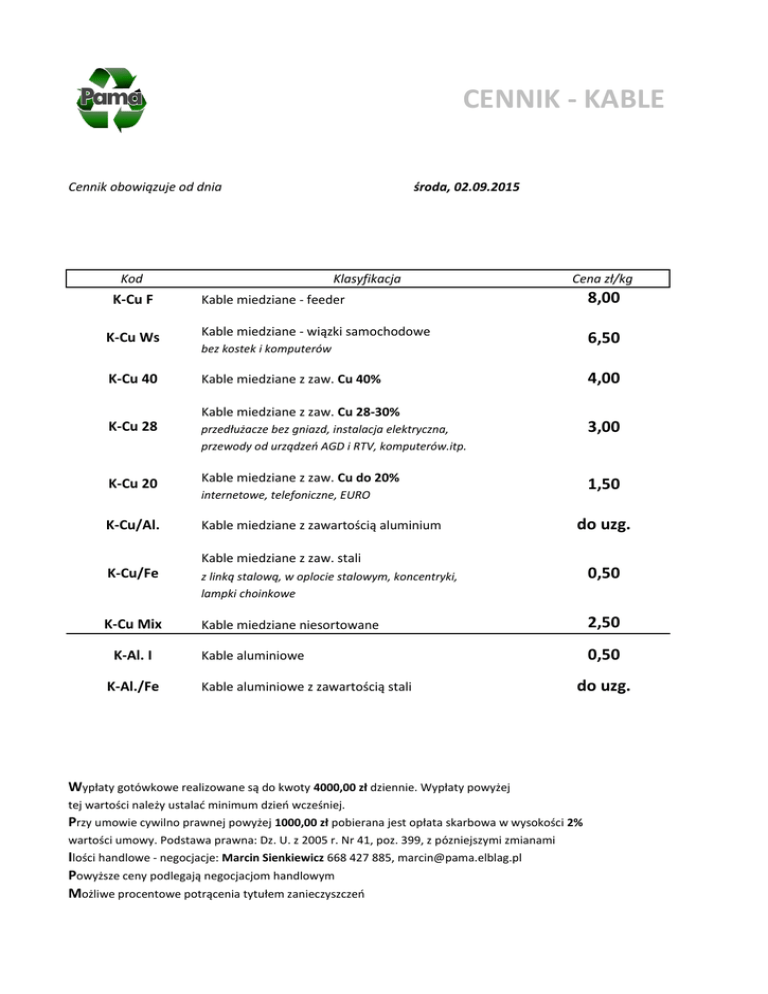 CENNIK - KABLE Cennik obowiązuje od dnia Kod K-Cu F K-Cu Ws środa, 02.09.2015 Klasyfikacja Cena zł/kg Kable miedziane - feeder 8,00 Kable miedziane - wiązki samochodowe 6,50 bez kostek i komputerów 4,00 K-Cu 40 Kable miedziane z zaw. Cu 40% K-Cu 28 przedłużacze bez gniazd, instalacja elektryczna, przewody od urządzeo AGD i RTV, komputerów.itp. 3,00 Kable miedziane z zaw. Cu do 20% 1,50 Kable miedziane z zaw. Cu 28-30% K-Cu 20 internetowe, telefoniczne, EURO do uzg. K-Cu/Al. Kable miedziane z zawartością aluminium K-Cu/Fe z linką stalową, w oplocie stalowym, koncentryki, lampki choinkowe 0,50 K-Cu Mix Kable miedziane niesortowane 2,50 Kable aluminiowe 0,50 Kable miedziane z zaw. stali K-Al. I K-Al./Fe Kable aluminiowe z zawartością stali do uzg. Wypłaty gotówkowe realizowane są do kwoty 4000,00 zł dziennie. Wypłaty powyżej tej wartości należy ustalad minimum dzieo wcześniej. Przy umowie cywilno prawnej powyżej 1000,00 zł pobierana jest opłata skarbowa w wysokości 2% wartości umowy. Podstawa prawna: Dz. U. z 2005 r. Nr 41, poz. 399, z pózniejszymi zmianami Ilości handlowe - negocjacje: Marcin Sienkiewicz 668 427 885, [email protected] Powyższe ceny podlegają negocjacjom handlowym Możliwe procentowe potrącenia tytułem zanieczyszczeo