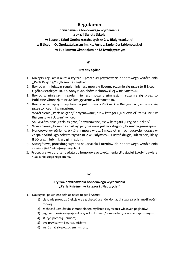 Regulamin przyznawania honorowego wyróżnienia z okazji Święta Szkoły w Zespole Szkół Ogólnokształcących nr 2 w Białymstoku, tj. w II Liceum Ogólnokształcącym im. Ks. Anny z Sapiehów Jabłonowskiej i w Publicznym Gimnazjum nr 32 Dwujęzycznym §1. Przepisy ogólne 1. Niniejszy regulamin określa kryteria i procedury przyznawania honorowego wyróżnienia ,,Perła Księżnej’’ i „Uczeń na szóstkę”. 2. Ilekroć w niniejszym regulaminie jest mowa o liceum, rozumie się przez to II Liceum Ogólnokształcące im. Ks. Anny z Sapiehów Jabłonowskiej w Białymstoku. 3. Ilekroć w niniejszym regulaminie jest mowa o gimnazjum, rozumie się przez to Publiczne Gimnazjum nr 32 Dwujęzyczne w Białymstoku. 4. Ilekroć w niniejszym regulaminie jest mowa o ZSO nr 2 w Białymstoku, rozumie się przez to liceum i gimnazjum. 5. Wyróżnienie „Perła Księżnej” przyznawane jest w kategorii „Nauczyciel” w ZSO nr 2 w Białymstoku i „Uczeń” w liceum. 5a. Wyróżnienie „Perła Księżnej” przyznawane jest w kategorii „Przyjaciel Szkoły”. 6. Wyróżnienie „Uczeń na szóstkę” przyznawane jest w kategorii „Uczeń” w gimnazjum. 7. Honorowe wyróżnienie, o którym mowa w ust. 1 może otrzymać nauczyciel uczący w Zespole Szkół Ogólnokształcących nr 2 w Białymstoku i uczeń drugiej lub trzeciej klasy II LO oraz II lub III klasy gimnazjum. 8. Szczegółową procedurę wyboru nauczyciela i uczniów do honorowego wyróżnienia zawiera §4 i 5 niniejszego regulaminu. 8a. Procedurę wyboru kandydata do honorowego wyróżnienia „Przyjaciel Szkoły” zawiera § 5a niniejszego regulaminu. §2. Kryteria przyznawania honorowego wyróżnienia ,,Perła Księżnej’ w kategorii „Nauczyciel” 1. Nauczyciel powinien spełniać następujące kryteria: 1) ciekawie prowadzić lekcje oraz zachęcać uczniów do nauki, stwarzając im możliwości rozwoju; 2) zachęcać uczniów do samodzielnego myślenia i wyrażania własnych poglądów; 3) jego uczniowie osiągają sukcesy w konkursach/olimpiadach/zawodach sportowych; 4) służyć pomocą uczniom; 5) być przyjaznym i wyrozumiałym; 6) wyróżniać się poczuciem humoru; 7) 8) 9) 10) 11) lubić swój zawód i uczniów; być konsekwentnym i charyzmatycznym; być autorytetem dla uczniów; mieć dobry kontakt z uczniami; szanować uczniów. §3. Kryteria przyznawania honorowego wyróżnienia ,,Perła Księżnej’ w kategorii „Uczeń” i „Uczeń na szóstkę” 1. Uczeń powinien spełniać następujące kryteria: 1) osiągać dobre wyniki w nauce lub sporcie; 2) wyróżniać się wysoka kulturą osobistą; 3) być pracowitym, ambitnym, oczytanym oraz elokwentnym; 4) rozwijać swoje pasje; 5) wyróżniać się wiedzą i umiejętnościami lub talentem; 6) być koleżeńskim oraz służyć innym pomocą; 7) angażować się w życie szkoły; 8) sumiennie wykonywać powierzone mu obowiązki; 9) być świadomym ,,obywatelem’’ społeczności szkolnej oraz dbać o dobre imię szkoły; 10) być cenionym przez nauczycieli. §4. Procedura przyznawania ,, Perły Księżnej” nauczycielowi ZSO nr 2 w Białymstoku 1. Powszechne głosowanie organizowane jest przez Samorząd Uczniowski i odbywa się najpóźniej na dwa tygodnie przed uroczystością. 2. W głosowaniu biorą udział uczniowie liceum i gimnazjum. 3. Uczniowie wybierają nauczyciela, którego chcą uhonorować wyróżnieniem „Perła Księżnej” w głosowaniu tajnym, wpisując imię i nazwisko swojego kandydata na kartkach przygotowanych wcześniej przez Samorząd Uczniowski. 3a. Honorowe wyróżnienie może być przyznane nauczycielowi raz na 3 lata. 4. Komisja skrutacyjna do liczenia głosów powoływana jest przez dyrektora szkoły i składa się z jednego nauczyciela ZSO nr 2 w Białymstoku oraz dwóch wybranych przedstawicieli Samorządu Uczniowskiego. 5. Ogłoszenie wyników oraz uroczyste wręczenie ,, Perły Księżnej’’ odbywa się w dn. 22 listopada na apelu z okazji Święta Szkoły. §5. Procedura przyznawania ,, Perły Księżnej’’ w kategorii „Uczeń” i „Uczeń na szóstkę” 1. Do 7 listopada danego roku społeczność każdej drugiej i trzeciej klasy ZSO nr 2 w Białymstoku wyłania na godzinie wychowawczej jednego ucznia - kandydata do wyróżnienia; w procedurze wyboru kandydata bierze udział wychowawca klasy oraz wszyscy uczniowie danej klasy. 2. Kandydatury spływają do kapituły powołanej przez Dyrektora Szkoły do 8 listopada danego roku w formie pisemnej wraz z charakterystyką ucznia zawierającą uzasadnienie spełniania przez ucznia kryteriów określonych w § 3. 1) Kapituła składa się z czterech nauczycieli oraz czterech uczniów (trzech uczniów liceum i jeden uczeń gimnazjum, będących jednocześnie przedstawicielami Samorządu Uczniowskiego); 2) Przewodniczącym Kapituły jest Dyrektor Szkoły. 3. Kapituła rozpatruje kandydatury uczniów do wyróżnienia i podejmuje decyzję o wyborze uczniów do wyróżnień w drodze głosowania tajnego oraz uzasadnia swój wybór. 4. W przypadku jednakowej liczby głosów na kandydatów decydujący głos w sprawie ma Dyrektor Szkoły. 5. Uczeń może otrzymać wyróżnienie, o którym mowa w § 1. tylko raz w cyklu nauki w liceum i gimnazjum. 6. Ogłoszenie wyników oraz uroczyste wręczenie wyróżnień, o których mowa w § odbywa się w dn. 22 listopada na apelu z okazji Święta Szkoły. §5a. 1. Honorowe wyróżnienie „Przyjaciel szkoły” przyznawane jest osobie, która w szczególny sposób angażuje się i wspiera życie szkoły w różnych formach. 2. Prawo zgłoszenia kandydata do wyróżnienia przysługuje w szczególności Dyrektorowi szkoły, który do współpracy przy podjęciu decyzji może zaprosić zespół kierowniczy i przedstawicieli Samorządu Uczniowskiego. 3. Honorowe wyróżnienie „Perła Księżnej” w kategorii „Przyjaciel Szkoły” jest wręczane podczas uroczystych obchodów Święta Szkoły. §6. Przepisy końcowe 1. Traci mo