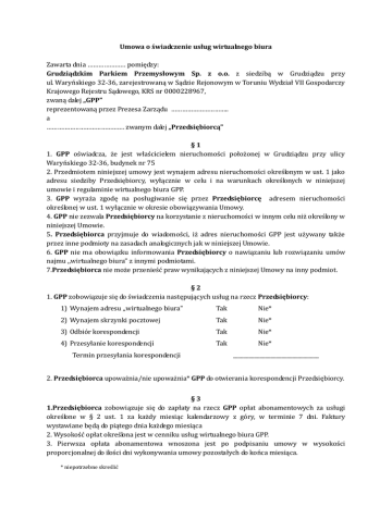 Umowa o świadczenie usług wirtualnego biura Zawarta dnia ………………… pomiędzy: Grudziądzkim Parkiem Przemysłowym Sp. z o.o. z siedzibą w Grudziądzu przy ul. Waryńskiego 32-36, zarejestrowaną w Sądzie Rejonowym w Toruniu Wydział VII Gospodarczy Krajowego Rejestru Sądowego, KRS nr 0000228967, zwaną dalej „GPP" reprezentowaną przez Prezesa Zarządu ………………………….. a ……………………………………. zwanym dalej „Przedsiębiorcą" §1 1. GPP oświadcza, że jest właścicielem nieruchomości położonej w Grudziądzu przy ulicy Waryńskiego 32-36, budynek nr 75 2. Przedmiotem niniejszej umowy jest wynajem adresu nieruchomości określonym w ust. 1 jako adresu siedziby Przedsiębiorcy, wyłącznie w celu i na warunkach określonych w niniejszej umowie i regulaminie wirtualnego biura GPP. 3. GPP wyraża zgodę na posługiwanie się przez Przedsiębiorcę adresem nieruchomości określonej w ust. 1 wyłącznie w okresie obowiązywania Umowy. 4. GPP nie zezwala Przedsiębiorcy na korzystanie z nieruchomości w innym celu niż określony w niniejszej Umowie. 5. Przedsiębiorca przyjmuje do wiadomości, iż adres nieruchomości GPP jest używany także przez inne podmioty na zasadach analogicznych jak w niniejszej Umowie. 6. GPP nie ma obowiązku informowania Przedsiębiorcy o nawiązaniu lub rozwiązaniu umów najmu ,,wirtualnego biura” z innymi podmiotami. 7.Przedsiębiorca nie może przenieść praw wynikających z niniejszej Umowy na inny podmiot. §2 1. GPP zobowiązuje się do świadczenia następujących usług na rzecz Przedsiębiorcy: 1) Wynajem adresu ,,wirtualnego biura" Tak Nie* 2) Wynajem skrzynki pocztowej Tak Nie* 3) Odbiór korespondencji Tak Nie* 4) Przesyłanie korespondencji Tak Nie* Termin przesyłania korespondencji ________________________________ 2. Przedsiębiorca upoważnia/nie upoważnia* GPP do otwierania korespondencji Przedsiębiorcy. §3 1.Przedsiębiorca zobowiązuje się do zapłaty na rzecz GPP opłat abonamentowych za usługi określone w § 2 ust. 1 za każdy miesiąc kalendarzowy z góry, w terminie 7 dni. Faktury wystawiane będą do piątego dnia każdego miesiąca 2. Wysokość opłat określona jest w cenniku usług wirtualnego biura GPP. 3. Pierwsza opłata abonamentowa wnoszona jest po podpisaniu umowy w wysokości proporcjonalnej do ilości dni wykonywania umowy pozostałych do końca miesiąca. * niepotrzebne skreślić 4. Faktury VAT będą wysyłany pocztą elektroniczną na adres ……………oraz w formie papierowej za pośrednictwem poczty na adres ……………………, który będzie jednocześnie adresem do przesyłania korespondencji, w przypadku korzystania przez Przedsiębiorcę z usługi wymienionej w § 2 ust. 1 pkt 4. 5. Brak otrzymania faktury w formie papierowej nie zwalnia Przedsiębiorcy z obowiązku zapłaty opłat abonamentowych 6. GPP zastrzega prawo do zmiany opłat abonamentowych raz w roku. W takim przypadku GPP zobowiązuje się do przesłania Przedsiębiorcy na jego adres poczty elektronicznej zawiadomienia o zmianie cennika usług co najmniej na miesiąc przed jego wprowadzeniem. 7. Należności wymienione w ust. 1 powyżej Przedsiębiorca zobowiązuje się wpłacać na rachunek bankowy GPP wskazany na fakturze. Nie uregulowanie należności wynikających z wystawionych przez GPP faktur w terminie określonym w niniejszej umowie spowoduje naliczenie odsetek ustawowych na każdy dzień opóźnienia. 8. Przedsiębiorca pokrywa koszty przesyłania na wskazany przez niego adres odbieranej przez GPP korespondencji Przedsiębiorcy. §4 1. Umowa zostaje zawarta na ……………………….., z tym że świadczenie usługi wynajęcia skrzynki pocztowej zlecane jest na okres co najmniej 6 miesięcy. 2. Rozwiązanie Umowy może nastąpić z zachowaniem jednomiesięcznego okresu wypowiedzenia przez każdą ze Stron w formie pisemnej, ze skutkiem na koniec miesiąca kalendarzowego. 3. GPP ma prawo rozwiązać Umowę bez wypowiedzenia ze skutkiem natychmiastowym w przypadkach: a) gdy Przedsiębiorca zalega z zapłatą opłaty przez okres dłuższy niż 14 dni; b) w przypadku rażącego naruszenia postanowień niniejszej Umowy przez Przedsiębiorcę. 4. W przypadku rozwiązania niniejszej Umowy w trybie natychmiastowym Przedsiębiorca traci prawo do zwrotu części opłaty za okres po wygaśnięciu Umowy. 5. GPP zastrzega sobie prawo dochodzenia odszkodowania przekraczającego wysokość zastrzeżonych kar umownych oraz odszkodowań na zasadach ogólnych. 6. Po rozwiązaniu umowy Przedsiębiorca zobowiązuje się do zgłoszenia zmiany adresu we właściwych rejestrach urzędowych. 7. GPP po rozwiązaniu umowy poinformuje operatorów pocztowych o pozbawieniu Przedsiębiorcy prawa do używania adresu nieruchomości GPP. §5 GPP zobowiązuje się do traktowania korespondencji Przedsiębiorcy jako materiałów poufnych. §6 1. GPP nie odpowiada za ewentualne szkody, w tym rzeczywiste straty oraz utracone korzyści powstałe z tytułu nie odbierania przez Przedsiębiorcę w terminie jakichkolwiek przesyłek 2. GPP nie odpowiada za ewentualne szkody, w tym rzeczywiste straty oraz utracone korzyści powstałe z tego tytułu, że pod adresem, o którym mowa w § 1 ust. 1 niniejszej Umowy jest jedynie zarejestrowana firma Przedsiębiorcy i nie jest to adres do kontaktów bezpośrednich z Przedsiębiorcą. 1. 2. 3. 4. 5. §7 Integralną częścią umowy jest Regulamin wirtualnego biura GPP wraz z cennikiem usług, określające szczegółowe zasady świadczenia usług. W sprawach nieuregulowanych mają zastosowanie przepisy Kodeksu Cywilnego. Wszelkie ewentualne spory wynikające z niniejszej umowy rozstrzygane będą przez Sąd właściwy dla siedziby GPP. Wszelkie zmiany postanowień niniejszej umowy, będą dokonywane w postaci pisemnych aneksów podpisanych przez obie strony pod rygorem nieważności. Umowa została sporządzona w dwóch egzemplarzach, po jednym dla każdej ze Stron