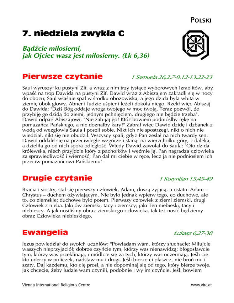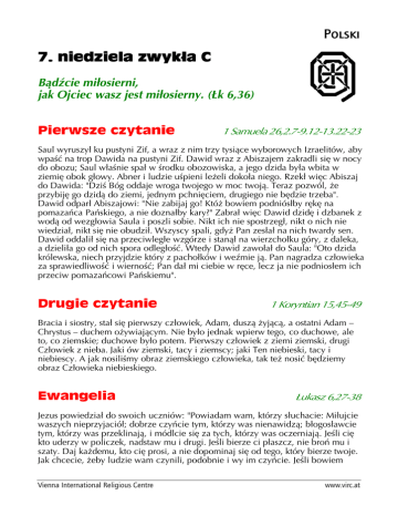 Polski Bądźcie miłosierni, jak Ojciec wasz jest miłosierny. (Łk 6,36) Saul wyruszył ku pustyni Zif, a wraz z nim trzy tysiące wyborowych Izraelitów, aby wpaść na trop Dawida na pustyni Zif. Dawid wraz z Abiszajem zakradli się w nocy do obozu; Saul właśnie spał w środku obozowiska, a jego dzida była wbita w ziemię obok głowy. Abner i ludzie uśpieni leżeli dokoła niego. Rzekł więc Abiszaj do Dawida: "Dziś Bóg oddaje wroga twojego w moc twoją. Teraz pozwól, że przybiję go dzidą do ziemi, jednym pchnięciem, drugiego nie będzie trzeba". Dawid odparł Abiszajowi: "Nie zabijaj go! Któż bowiem podniósłby rękę na pomazańca Pańskiego, a nie doznałby kary?" Zabrał więc Dawid dzidę i dzbanek z wodą od wezgłowia Saula i poszli sobie. Nikt ich nie spostrzegł, nikt o nich nie wiedział, nikt się nie obudził. Wszyscy spali, gdyż Pan zesłał na nich twardy sen. Dawid oddalił się na przeciwległe wzgórze i stanął na wierzchołku góry, z daleka, a dzieliła go od nich spora odległość. Wtedy Dawid zawołał do Saula: "Oto dzida królewska, niech przyjdzie który z pachołków i weźmie ją. Pan nagradza człowieka za sprawiedliwość i wierność; Pan dał mi ciebie w ręce, lecz ja nie podniosłem ich przeciw pomazańcowi Pańskiemu". Bracia i siostry, stał się pierwszy człowiek, Adam, duszą żyjącą, a ostatni Adam – Chrystus – duchem ożywiającym. Nie było jednak wpierw tego, co duchowe, ale to, co ziemskie; duchowe było potem. Pierwszy człowiek z ziemi ziemski, drugi Człowiek z nieba. Jaki ów ziemski, tacy i ziemscy; jaki Ten niebieski, tacy i niebiescy. A jak nosiliśmy obraz ziemskiego człowieka, tak też nosić będziemy obraz Człowieka niebieskiego. Jezus powiedział do swoich uczniów: "Powiadam wam, którzy słuchacie: Miłujcie waszych nieprzyjaciół; dobrze czyńcie tym, którzy was nienawidzą; błogosławcie tym, którzy was przeklinają, i módlcie się za tych, którzy was oczerniają. Jeśli cię kto uderzy w policzek, nadstaw mu i drugi. Jeśli bierze ci płaszcz, nie broń mu i szaty. Daj każdemu, kto cię prosi, a nie dopominaj się od tego, który bierze twoje. Jak chcecie, żeby ludzie wam czynili, podobnie i wy im czyńcie. Jeśli bowiem Vienna International Religious Centre www.virc.at miłujecie tylko tych, którzy was miłują, jakaż za to dla was wdzięczność? Przecież i grzesznicy miłość okazują tym, którzy ich miłują. I jeśli dobrze czynicie tym tylko, którzy wam dobrze czynią, jaka za to dla was wdzięczność? I grzesznicy to samo czynią. Jeśli pożyczek udzielacie tym, od których spodziewacie się zwrotu, jakaż za to dla was wdzięczność? I grzesznicy grzesznikom pożyczają, żeby tyleż samo otrzymać. Wy natomiast miłujcie waszych nieprzyjaciół, czyńcie dobrze i pożyczajcie, niczego się za to nie spodziewając. A wasza nagroda będzie wielka, i będziecie synami Najwyższego; ponieważ On jest dobry dla niewdzięcznych i złych. Bądźcie miłosierni, jak Ojciec wasz jest miłosierny. Nie sądźcie, a nie będziecie sądzeni; nie potępiajcie, a nie będziecie potępieni; odpuszczajcie, a będzie wam odpuszczone. Dawajcie, a będzie wam dane: miarą dobrą, natłoczoną, utrzęsioną i opływającą wsypią w zanadrze wasze. Odmierzą wam bowiem taką miarą, jaką wy mierzycie". "Nie czyń drugiemu, co tobie niemiłe." Reguła nadająca ton przeciętnemu zachowaniu się ludzi względem siebie. Bezprawie musi być karane; należy przepychać swoje racje; gdy jesteśmy prowokowani, bronimy się do granic możliwości; mieć ostatnie słowo do powiedzenia jest rzeczą niezwykle pomocną; a w ogóle dokąd byśmy zaszli, jeśli na wszystko będziemy się zgadzać? Dzisiejsze teksty biblijne płyną jednak pod prąd powszechnych ludzkich przekonań: Dawid mógł zabić swojego przeciwnika Saula – nie uczynił tego. Jezus konfrontuje nas z niesamowitym wyzwaniem: miłości nieprzyjaciół, rezygnacji z przemocy, miłości bezwarunkowej. Reguła "oko za oko" przeżyła się w Jezusowym programie życiowym. Jego apel brzmi zupełnie inaczej: nie reaguj tak, jak zareagowałbyś w oparciu o ludzkie wyrachowanie, lecz zachowaj się tak, jak Bóg zachowuje się względem ciebie. Jego miłość jest całkowita (tzn. niezależna od wartości, osiągnięć, warunków). Ta bezkresność nieoczekiwanej miłości, jaką Jezus uwidocznił na swoim przykładzie, jest modelem działania dla chrześcijan. Radykalizm Jezusowego wymagania wywołuje w nas pewien strach i wycofywanie się: niemożliwe, jak można w taki sposób kochać? Przekracza to ludzkie możliwości, nawet przy najlepszej woli. W ten sposób kuszeni jesteśmy, by odrzucić Jego sposób życia i kochania. Zapominamy przy tym, że, po pierwsze, wymaganie to nie jest wymaganiem w ludzkim tego słowa znaczeniu, lecz zaproszeniem do odpowiedzi na drogocenną miłość Boga w taki sam sposób i podarowania jej dalej. Czyż nie jest naszym ludzkim przekonaniem to, że doświadczenie bycia kochanym i zaakceptowanym pozwala łatwiej znosić trudności? Dokładnie tak samo jest z doświadczeniem miłości Boga. Po drugie nakreślone powyżej kierunki działania są jedynie celem, który zostanie osiągnięty całkowicie dopiero w królestwie Bożym. Jednak miłość taka jest istotnym celem ludzkiej egzystencji i wyłania się codziennie z miłości, którą każdego dnia ogarnia nas Bóg. Droga ku temu realizuje się w małych krokach codzienności: humor rozładowuje czasami napięte sytuacje; otwartość może pomóc rozwiązać poważny konflikt; niekiedy rezygnujemy świadomie z racji ostatniego słowa; być może uda się nam kiedyś przyjąć zadane przez kogoś cierpienie i mu przebaczyć; podarować coś tam, skąd nie otrzymamy żadnej zapłaty; nie spadnie nam korona z głowy, jeśli pierwsi uczynimy krok, rezygnując z naszej dumy... Taka postawa życiowa będzie, z czysto ludzkiego punktu widzenia, wyśmiewana zniewa