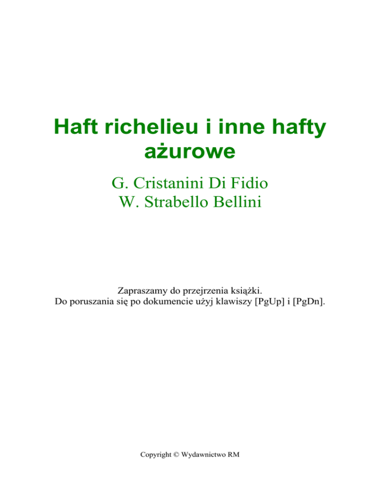 Haft richelieu i inne hafty ażurowe G. Cristanini Di Fidio W. Strabello Bellini Zapraszamy do przejrzenia książki. Do poruszania się po dokumencie użyj klawiszy [PgUp] i [PgDn]. Copyright © Wydawnictwo RM www.robotki.pl Kliknij tutaj, aby kupić tę książkę Spis treœci Tkaniny Nici Tamborek i inne akcesoria Kalkowanie wzoru Pranie i prasowanie haftu 4 5 6 9 10 ŒCIEGI Œcieg dziergany Brzegi i œciegi dziergane Haft angielski £uki z pikotkami Paj¹czki Haft pizañski 11 12 13 14 16 18 SERWETY I SERWETKI Klasyczna serweta na tacê Serweta z aplikacjami Serweta na œrodek sto³u Serweta z motywem pawia Prosty bie¿nik Elegancki bie¿nik 19 20 21 22 23 24 Serweta na tacê Jesienna serweta 26 29 Bo¿onarodzeniowa serwetka Choinka Poduszka z motywem kwiatów w wazonie Przeœcierad³o 46 48 30 34 Przeœcierad³o œlubne 50 Motyw stokrotek Okr¹g³a serwetka na tacê 35 36 POMYS£OWE PODARUNKI BIELIZNA STO£OWA I POŒCIELOWA Obrus z tulipanami 37 Komplet sto³owy z motywem bluszczu 38 Serwetka z motywem owoców 40 Serwetka z inicja³ami 41 Ozdoba na poduszkê z motywem kwiatów 42 Poduszki z motywem hortensji 44 Woreczki na lawendê Koszula nocna Chusteczki Serwetka na bombonierki Aba¿ur Ró¿owy rêcznik Serwetka pod kieliszek 52 53 54 55 56 58 60 BRZEGI I LAMÓWKI Brzeg poduszki Eleganckie wykoñczenie Kwiatuszek Brzegi w geometryczne wzory 61 62 63 63 3 Haft richelieu i inne hafty ażurowe (G. Cristanini Di Fidio, W. Strabello Bellini) www.robotki.pl Kliknij tutaj, aby kupić tę książkę Tamborek i inne akcesoria 3. Nastêpnie tkaninê z naniesionym rysunkiem umieœæ na mniejszym kole tamborka i przykryj j¹ drugim ko³em. Czêœæ, na której ma powstaæ haft, powinna znajdowaæ siê na œrodku tamborka: w ten sposób bêdzie mo¿na swobodnie operowaæ rêkoma, a wykonanie œciegów bêdzie ³atwiejsze. Tamborek sk³ada siê z dwóch kó³ek umieszczonych jedno w drugim. Utrzymuj¹ one tkaninê dok³adnie napiêt¹, co u³atwia wykonanie haftu. Okr¹g³y tamborek na stojaczku jest bardzo wygodny, bo bêdziesz mieæ dwie wolne rêce, jedn¹ pod, a drug¹ nad tkanin¹. To umo¿liwia wk³uwanie ig³y prostopadle do tkaniny. Tamborki maj¹ ró¿ne kszta³ty i wymiary, wykonane s¹ z drewna lub z plastiku, a ich ko³a zaciskane s¹ za pomoc¹ œruby lub sprê¿yny. Tamborek nie jest konieczny w wypadku haftu wycinanego, ale niezbêdny, jeœli we wzorze przewidziany jest œcieg at³askowy wypuk³y lub cieniowany. 1. W celu zabezpieczenia tkaniny owiñ ko³a tamborka wst¹¿k¹ lub p³óciennym paskiem materia³u. 2. Jeœli u¿ywasz tamborka, w wypadku haftu znajduj¹cego siê blisko krawêdzi tkaniny umieœæ dodatkowy kawa³ek materia³u, fastryguj¹c go do pozosta³ej czêœci tkaniny. 4. Jeœli tkanina jest bardzo cienka lub delikatna, 5. Naci¹gnij delikatnie materia³ znajduj¹cy siê poza przed na³o¿eniem jej na tamborek, z³ó¿ j¹ razem z kawa³kiem p³ótna. Nastêpnie umieœæ oba materia³y na tamborku i wytnij kawa³ek p³ótna, aby ods³oniæ wzór. tamborkiem. Dziêki temu powierzchnia, na której ma powstaæ haft, bêdzie dobrze napiêta. Przykrêæ œrubê i nie zmieniaj ju¿ pozycji tkaniny, ¿eby jej nie zniekszta³ciæ. Ig³y i szpilki Jakoœæ haftu zale¿y nie tylko od jego wykonania, ale równie¿ od precyzji rysunku i u¿ywanych narzêdzi. Przyk³adaj du¿¹ wagê do ka¿dego etapu pracy, równie¿ do etapu przygotowañ: bardzo dok³adnie nanieœ wzór do kalkowania na materia³. Uwa¿nie wybierz ig³ê do haftu, która musi byæ cienka i odpowiednia do u¿ywanych nici i wykonywanego wzoru. 6 Haft richelieu i inne hafty ażurowe (G. Cristanini Di Fidio, W. Strabello Bellini) 7 www.robotki.pl Kliknij tutaj, aby kupić tę książkę Kalkowanie wzoru Naparstek Zak³ada siê go na œrodkowy palec prawej rêki. Pomaga w przewlekaniu ig³y przez materia³. Zazwyczaj u¿ywa siê naparstków metalowych, ale s¹ równie¿ naparstki wykonane z innych materia³ów. Przed zakupem nale¿y naparstek przymierzyæ: za ciasny przeszkadza, a za du¿y spada z palca. Wzory haftu gotowe do zastosowania dostêpne s¹ na foliach, które nak³ada siê na tkaninê, a nastêpnie przeprasowuje gor¹cym ¿elazkiem. Jeœli chcesz stworzyæ w³asny rysunek, musisz go przenieœæ na pergamin lub papier kalkowy, aby móc go nastêpnie odbiæ na materiale. No¿yczki Potrzebne s¹ no¿yczki w ró¿nych rozmiarach: du¿e s³u¿¹ do rozcinania materia³ów, ma³e, specjalne do haftu, z d³ugimi, zaostrzonymi koñcówkami s¹ niezbêdne do precyzyjnego wyciêcia materia³u miêdzy haftem. No¿yczki o zaokr¹glonych ostrzach s¹ niezbêdne do wycinania ozdobnego wykoñczenia brzegów i materia³u miêdzy przêse³kami haftu. Przek³uwacz Ochraniacz na palce S³u¿y do dziurkowania tkaniny. Mo¿e byæ metalowy, koœciany lub plastikowy. Jest niezbêdny do wykonania haftu angielskiego. Ma³y przyrz¹d wykonany z odpornego plastiku. Zak³ada siê go na palec wskazuj¹cy lewej rêki, s³u¿y do ochrony palca przed uk³uciem ig³y. 1. Rozprasuj tkaninê, ¿eby rysunek móg³ byæ ideal- 2. Umieœæ rysunek na materiale w wybranym miej- nie przekalkowany. Wymierz go precyzyjnie, aby ustaliæ dok³adn¹ pozycjê haftu. scu i przypnij go szpilkami lub przymocuj taœm¹ klej¹c¹. 3. Pod rysunek wsuñ papier kalkowy zwrócony stron¹ barwi¹c¹ do do³u i dobrze zaostrzonym o³ówkiem obrysuj kontur rysunku. U¿ywaj papieru krawieckiego, jasnego do ciemnych materia³ów, ciemnego do jasnych. Pamiêtaj, ¿e nowy papier kalkowy brudzi materia³: ewentualny nadmiar barwnika usuñ kawa³kiem waty. 4. Przed usuniêciem papieru sprawdŸ, czy rysunek jest w ca³oœci i precyzyjnie odrysowany. Po jego usuniêciu ponowne umieszczenie wzoru w celu dokoñczenia kopiowania jest praktycznie niemo¿liwe. Wzory do haftu wycinanego. Niektóre pochodz¹ z pocz¹tku XX wieku. 8 Haft richelieu i inne hafty ażurowe (G. Cristanini Di Fidio, W. Strabello Bellini) 9 www.robotki.pl Kliknij tutaj, aby kupić tę książkę