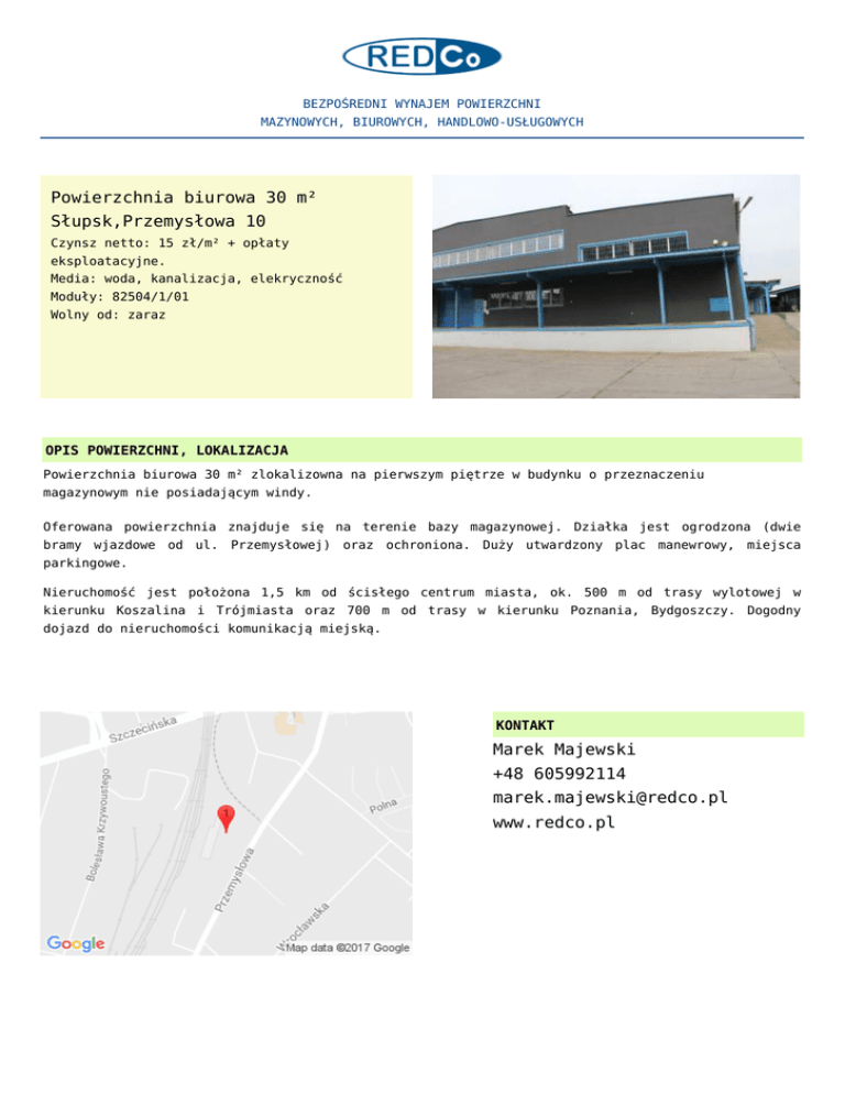 BEZPOŚREDNI WYNAJEM POWIERZCHNI MAZYNOWYCH, BIUROWYCH, HANDLOWO-USŁUGOWYCH Powierzchnia biurowa 30 m² Słupsk,Przemysłowa 10 Czynsz netto: 15 zł/m² + opłaty eksploatacyjne. Media: woda, kanalizacja, elekryczność Moduły: 82504/1/01 Wolny od: zaraz OPIS POWIERZCHNI, LOKALIZACJA Powierzchnia biurowa 30 m² zlokalizowna na pierwszym piętrze w budynku o przeznaczeniu magazynowym nie posiadającym windy. Oferowana powierzchnia znajduje się na terenie bazy magazynowej. Działka jest ogrodzona (dwie bramy wjazdowe od ul. Przemysłowej) oraz ochroniona. Duży utwardzony plac manewrowy, miejsca parkingowe. Nieruchomość jest położona 1,5 km od ścisłego centrum miasta, ok. 500 m od trasy wylotowej w kierunku Koszalina i Trójmiasta oraz 700 m od trasy w kierunku Poznania, Bydgoszczy. Dogodny dojazd do nieruchomości komunikacją miejską. KONTAKT Marek Majewski +48 605992114 [email protected] www.redco.pl