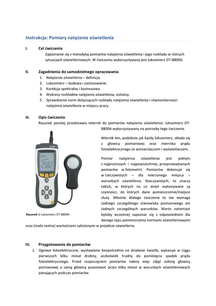 Instrukcja: Pomiary natężenia oświetlenia I. Cel ćwiczenia Zapoznanie się z metodyką pomiarów natężenia oświetlenia i jego rozkładu w różnych sytuacjach oświetleniowych. W ćwiczeniu wykorzystywany jest luksomierz DT-8809A. II. Zagadnienia do samodzielnego opracowania 1. 2. 3. 4. 5. III. Natężenie oświetlenia – definicja. Luksomierz – budowa i zastosowanie. Korekcja spektralna i kosinusowa Wykresy rozkładów natężenia oświetlenia, izoluksy. Sprawdzenie norm dotyczących rozkładu natężenia oświetlenia i równomierności natężenia oświetlenia w miejscu pracy. Opis ćwiczenia Rysunek poniżej przedstawia miernik do pomiarów natężenia oświetlenia: luksomierz DT8809A wykorzystywany na potrzeby tego ćwiczenia. Miernik ten, podobnie jak każdy luksomierz, składa się z głowicy pomiarowej oraz miernika prądu fotoelektrycznego ze wzmacniaczem i wyświetlaczem. Pomiar natężenia oświetlenia jest jednym z najprostszych i najpowszechniej przeprowadzanych pomiarów w fotometrii. Pomiarów dokonuje się w rzeczywistych – dla mierzonego miejsca – warunkach oświetlenia. Rzeczywistych, to znaczy takich, w których na co dzień wykonywane są czynności, do których dane pomieszczenie/miejsce służy. Właśnie dlatego ćwiczenie to nie wymaga żadnego szczególnego stanowiska pomiarowego ani żadnych szczególnych warunków. Warto natomiast Rysunek 1 Luksomierz DT-8809A byłoby wcześniej zapoznać się z odpowiednimi dla danego typu pomieszczenia normami oświetleniowymi oraz (mało realne) wartościami założonymi w projekcie oświetlenia. IV. Przygotowanie do pomiarów 1. Ogniwo fotoelektryczne, wystawione bezpośrednio na działanie światła, wykazuje w ciągu pierwszych kilku minut drobny, aczkolwiek trudny do pominięcia spadek prądu fotoelektrycznego. Przed rozpoczęciem pomiarów należy więc zdjąć osłonę głowicy pomiarowej a samą głowicę pozostawić przez kilka minut w warunkach oświetleniowych panujących podczas pomiarów. 2. Podczas wykonywania pomiarów należy dopilnować, by powierzchnia światłoczuła głowicy fotometrycznej nie była w żaden sposób zasłaniana ani przysłaniana przed światłem pochodzącym bezpośrednio od źródeł światła jak i światłem odbitym od elementów otoczenia. Wskazane jest też, aby ubiór obserwatora (osoby wykonującej pomiary) był ciemny. V. Zadania do wykonania: a) Pomiary natężenia światła w pomieszczeniu 1. Sporządź szkic pomieszczenia, w którym dokonywane będą pomiary. Zwróć szczególną uwagę na oświetlenie wewnętrzne (sufitowe i ścienne), oświetlenie zewnętrzne (okna, drzwi), oświetlenie stanowiska pracy (lampki biurowe). 2. Zmierz wymiary pomieszczenia. 3. W celu wyznaczenia rozkładu natężenia oświetlenia na płaszczyźnie, podziel ją na równe, elementarne pola, które również nanieś na szkic pomieszczenia, jak na rysunku poniżej. Rysunek 2 Przykład podziału pomieszczenia na elementarne pola o równej powierzchni. 4. W środku każdego pola 𝑖 zmierz luksomierzem natężenie oświetlenia 𝐸𝑖 – a wskazaną przez luksomierz wartość nanieść na wcześniej przygotowany szkic pomieszczenia. b) Pomiary natężenia światła przy stanowisku roboczym 1. Sporządź szkic powierzchni biurka, na którym będą przeprowadzane pomiary. Zwróć szczególną uwagę na kierunki, z których dochodzi oświetlenie powierzchni biurka (lampki biurowe, sufitowe i ścienne, okna i drzwi. 2. Zmierz wymiary powierzchni biurka. 3. W celu wyznaczenia rozkładu natężenia oświetlenia na płaszczyźnie, podziel ją na równe, elementarne pola, które również nanieś na szkic biurka. 4. W środku każdego pola 𝑖 zmierz luksomierzem natężenie oświetlenia 𝐸𝑖 – a wskazaną przez luksomierz wartość nanieść na wcześniej przygotowany szkic powierzchni biurka. c) Pomiary natężenia oświetlenia płaszczyzny pionowej (np. gablota na ścianie) 1. Sporządź szkic pionowej powierzchni wskazanej przez prowadzącego, na której będą przeprowadzane pomiary. Zwróć szczególną uwagę na kierunki, z których dochodzi oświetlenie powierzchni biurka (lampki biurowe, sufitowe i ścienne, okna i drzwi). 2. Zmierz wymiary powierzchni badanej. 3. W celu wyznaczenia rozkładu natężenia oświetlenia na płaszczyźnie, podziel ją na równe, elementarne pola, które również nanieś na szkic biurka. 4. W środku każdego pola 𝑖 zmierz luksomierzem natężenie oświetlenia 𝐸𝑖 – a wskazaną przez luksomierz wartość nanieść na wcześniej przygotowany szkic powierzchni badanej . VI. Opracowanie wyników Wyniki otrzymanych pomiarów natężenia światła przedstaw w formie tabeli oraz wykresu (rozkład natężenia, izoluksy). Z otrzymanych wyników rozkładu natężenia oświetlenia wyznacz wartość średnią: ∑𝑛𝑖 𝐸𝑖 𝐸ś𝑟 = 𝑛 Następnie oblicz wielkość zwaną równomiernością natężenia oświetlenia, która dana jest wzorem: min(𝐸𝑖 ) 𝛿= 𝐸ś𝑟 Na koniec dokonaj oceny zgodności wyznaczonych wartości średniego natężenia oświetlenia oraz równomierności natężenia oświetlenia z wymogami zawartymi w normie PN-EN 12464-1:2004. Światło i oświetlenie. Oświetlenie miejsc pracy. Część 1: Miejsca pracy we wnętrzach.