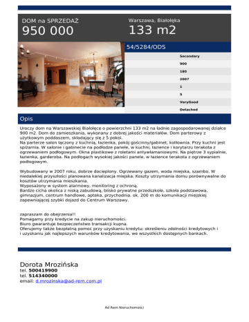 DOM na SPRZEDAŻ 950 000 Warszawa, Białołęka 133 m2 54/5284/ODS Secondary 900 180 2007 1 5 VeryGood Detached Opis Uroczy dom na Warszawskiej Białołęce o powierzchni 133 m2 na ładnie zagospodarowanej działce 900 m2. Dom do zamieszkania, wykonany z dobrej jakości materiałów. Dom parterowy z użytkowym poddaszem, składający się z 5 pokoi. Na parterze salon łączony z kuchnią, łazienka, pokój gościnny/gabinet, kotłownia. Przy kuchni jest spiżarnia. W salonie i gabinecie na podłodze panele, w kuchni, łazience i korytarzu terakota z ogrzewaniem podłogowym. Okna plastikowe z roletami antywłamaniowymi. Na piętrze 3 sypialnie, łazienka, garderoba. Na podłogach wysokiej jakości panele, w łazience terakota z ogrzewaniem podłogowym. Wybudowany w 2007 roku, dobrze docieplony. Ogrzewany gazem, woda miejska, szambo. W niedalekiej przyszłości planowana kanalizacja miejska. Koszty utrzymania domu porównywalne do kosztów utrzymania mieszkania. Wyposażony w system alarmowy, monitoring z ochroną. Bardzo cicha okolica z niską zabudową, blisko prywatne przedszkole, szkoła podstawowa, gimnazjum, centrum handlowe, apteka, przychodnia. ok. 200 m do komunikacji miejskiej zapewniającej szybki dojazd do Centrum Warszawy. zapraszam do obejrzenia!! Pomagamy przy kredycie na zakup nieruchomości. Biuro gwarantuje bezpieczeństwo transakcji kupna. Oferujemy także bezpłatną pomoc przy uzyskaniu kredytu: określeniu zdolności kredytowych i i uzyskaniu jak najlepszych warunków kredytowania, we wszystkich dostępnych bankach. Dorota Mrozińska tel. 500419900 tel. 514340000 email: [email protected] Ad Rem Nieruchomości Powered by TCPDF (www.tcpdf.org)