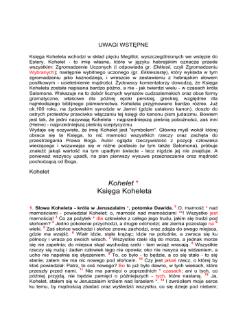 UWAGI WSTĘPNE Księga Koheleta wchodzi w skład pięciu Megillot, wyszczególnionych we wstępie do Estery. Kohelet - to imię własne, które w języku hebrajskim oznacza przede wszystkim: Zgromadzenie Uczonych (i odpowiada gr. Ekklesii, czyli Zgromadzeniu Wybranych); następnie wybitnego uczonego (gr. Ekklesiastę), który wykłada w tym zgromadzeniu jako kaznodzieja, i wreszcie w zestawieniu z hebrajskim słowem posiłkowym - ucieleśnienie mądrości. Żydowscy komentatorzy dowodzą, że Księga Koheleta została napisana bardzo późno, a nie - jak twierdzi wielu - w czasach króla Salomona. Wskazuje na to dobór licznych wyrazów cudzoziemskich oraz obce formy gramatyczne, właściwe dla późnej epoki perskiej, greckiej, względnie dla najmłodszego biblijnego piśmiennictwa. Koheleta przyjmowano bardzo różnie. Już ok.100 roku, na żydowskim synodzie w Jamni (gdzie ustalono kanon), doszło do ostrych protestów przeciwko włączaniu tej księgi do kanonu pism judaizmu. Bowiem jest tak, że jedni nazywają Koheleta - najprzedniejszą pieśnią pobożności, zaś inni (Heine) - najprzedniejszą pieśnią sceptycyzmu. Wydaje się oczywiste, że imię Kohelet jest "symbolem". Główna myśl wokół której obraca się ta Księga, to nić marności wszystkich rzeczy oraz zachęta do przestrzegania Prawa Boga. Autor ogląda rzeczywistość z pozycji człowieka wierzącego i wczuwając się w różne postacie (w tym także Salomona), próbuje znaleźć jakąś wartość na tym upadłym świecie - lecz nigdzie jej nie znajduje. A ponieważ wszyscy upadli, na plan pierwszy wysuwa przeznaczenie oraz mądrość pochodzącą od Boga. Kohelet Kohelet * Księga Koheleta 1. Słowa Koheleta - króla w Jeruszalaim *, potomka Dawida. 2 O, marność * nad marnościami - powiedział Kohelet; o, marność nad marnościami **! Wszystko jest marnością! 3 Co za pożytek * dla człowieka z całego jego trudu, jakim się trudzi pod słońcem? 4 Jedno pokolenie przychodzi, a drugie odchodzi; ale ziemia pozostaje na S wieki. 5 Zaś słońce wschodzi i słońce znowu zachodzi, oraz zdąża do swego miejsca, gdzie ma wzejść. 6 Wiatr idzie, stale krążąc; idzie na południe, a zwraca się ku północy i wraca po swoich wirach. 7 Wszystkie rzeki idą do morza, a jednak morze się nie zapełnia; do miejsca skąd wychodzą rzeki - tam wciąż wracają. 8 Wszystkie rzeczy się nużą i żaden człowiek tego nie opowie; oko nie nasyca się widzeniem, a ucho nie napełnia się słyszeniem. 9 To, co było - to będzie, a co się stało - to się stanie; zatem nie ma nic nowego pod słońcem. 10 Czy jest jakaś rzecz, o której by ktoś powiedział: Patrz, to coś nowego? Bo to już było dawno, w tych wiekach, które przeszły przed nami. 11 Nie ma pamięci o poprzednich * czasach; ani u tych, co później przyjdą, nie będzie pamięci o późniejszych - tych, które nastaną. 12 Ja, Kohelet, stałem się w Jeruszalaim królem nad Israelem *. 13 I zwróciłem moje serce ku temu, by mądrością zbadać oraz wyśledzić wszystko, co się dzieje pod niebem; ten czczy * popęd, który Bóg złożył w synach ludzkich, aby się nim trapili. 14 Widziałem wszystkie sprawy, które się dzieją pod słońcem - a oto wszystko jest marnością oraz pogonią * za wiatrem. 15 Co krzywe - nie daje się wyprostować, a czego brakuje - nie może wejść w rachubę. 16 I pomyślałem w swoim sercu, i powiedziałem: Oto zdobyłem wielką i coraz wyższą mądrość, ponad wszystkich, którzy byli w Jeruszalaim przede mną; więc moje serce przejrzało pełnię mądrości oraz wiedzy. 17 Ale kiedy zwróciłem moje serce ku temu, by sobie uświadomić czym jest mądrość i wiedza, szaleństwo * i głupota - poznałem, że to też jest pogonią za wiatrem. 18 Bo gdzie wiele mądrości - tam także wiele zgryzoty, a kto mnoży wiedzę mnoży też cierpienie. * hebrajska nazwa Księgi *1,1 żydowscy komentatorzy Pisma zwracają uwagę na fakt, że jest to tytuł wyjątkowy, nigdzie nie spotykany; bowiem starotestamentowi królowie używali tytułu - król Israela; patrz: 2 Królewska 23,13; Nehemiasz 13,26. *1,2 dokładnie: tchnienie, jako przeciwstawienie trwałości; każda rzecz nikła i znikoma **1,2 najwyższy stopień marności *1,3 także: zysk, korzyść, reszta *1,11 także: przednich, pierwszych, początkowych *1,12 ten tytuł odnosi się do czasów przed rozpadnięciem się państwa na dwa królestwa *1,13 właściwie: zły, daremny; bo nie dający rezultatu *1,14 dokładnie: pustą dążnością *1,17 od źródłosłowu: szumieć 2. Więc pomyślałem w swoim sercu: Zatem doświadczę cię * radością, rozkoszuj się szczęściem. Ale zaprawdę, i to jest marność. 2 O śmiechu powiedziałem: To szał *! A o radości: Do czego ona służy? 3 Zatem obmyśliłem w swoim sercu, by odtąd krzepić winem me ciało; tak jednak, by serce kierowało się mądrością. I abym się chwycił głupstwa, dopóki nie wypatrzę, co by było najwłaściwsze dla synów ludzkich, aby to czynić pod niebem po wszystkie dni ich życia. 4 Wykonałem wielkie dzieła *: Pobudowałem sobie domy i zasadziłem winnice. 5 Pozakładałem sobie ogrody, parki i zasadziłem w nich wszelkie owocowe drzewa. 6 Urządziłem sobie stawy wodne, aby zraszać z nich sad porosły drzewami. 7 Nakupiłem sobie niewolników, niewolnice i posiadałem też takich, co byli zrodzeni w domu. Miałem więcej rogacizny i owiec niż wszyscy, którzy byli przede mną w Jeruszalaim. 8 Nagromadziłem sobie też złota, srebra oraz najkosztowniejszych klejnotów królów i krain; sprowadziłem sobie śpiewaków, śpiewaczki i rozkosz ludzkich synów - mnóstwo pań *. 9 I tak stałem się wielkim i możniejszym od wszystkich, którzy byli przede mną w Jeruszalaim; przy tym zostawała też przy mnie moja mądrość. 10 Czego pożądały moje oczy - tego im nie wzbraniałem; nie odmawiałem mojemu sercu żadnej radości, bo cieszyło się moje serce z całej mojej pra