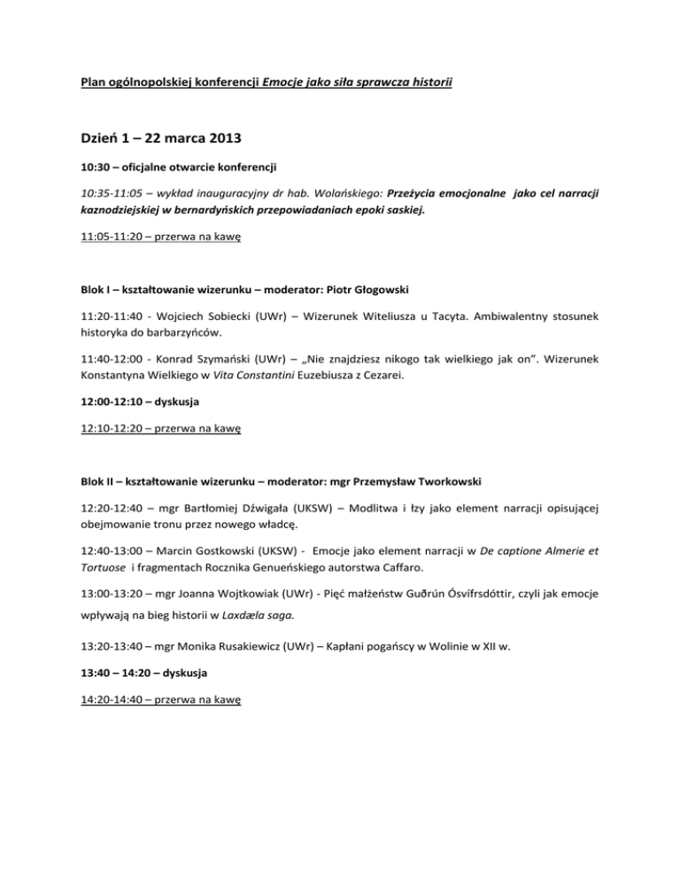 Plan ogólnopolskiej konferencji Emocje jako siła sprawcza historii Dzień 1 – 22 marca 2013 10:30 – oficjalne otwarcie konferencji 10:35-11:05 – wykład inauguracyjny dr hab. Wolańskiego: Przeżycia emocjonalne jako cel narracji kaznodziejskiej w bernardyńskich przepowiadaniach epoki saskiej. 11:05-11:20 – przerwa na kawę Blok I – kształtowanie wizerunku – moderator: Piotr Głogowski 11:20-11:40 - Wojciech Sobiecki (UWr) – Wizerunek Witeliusza u Tacyta. Ambiwalentny stosunek historyka do barbarzyńców. 11:40-12:00 - Konrad Szymański (UWr) – „Nie znajdziesz nikogo tak wielkiego jak on”. Wizerunek Konstantyna Wielkiego w Vita Constantini Euzebiusza z Cezarei. 12:00-12:10 – dyskusja 12:10-12:20 – przerwa na kawę Blok II – kształtowanie wizerunku – moderator: mgr Przemysław Tworkowski 12:20-12:40 – mgr Bartłomiej Dźwigała (UKSW) – Modlitwa i łzy jako element narracji opisującej obejmowanie tronu przez nowego władcę. 12:40-13:00 – Marcin Gostkowski (UKSW) - Emocje jako element narracji w De captione Almerie et Tortuose i fragmentach Rocznika Genueńskiego autorstwa Caffaro. 13:00-13:20 – mgr Joanna Wojtkowiak (UWr) - Pięć małżeństw Guðrún Ósvífrsdóttir, czyli jak emocje wpływają na bieg historii w Laxdæla saga. 13:20-13:40 – mgr Monika Rusakiewicz (UWr) – Kapłani pogańscy w Wolinie w XII w. 13:40 – 14:20 – dyskusja 14:20-14:40 – przerwa na kawę Blok III – kształtowanie wizerunku – moderator: mgr Piotr Piętkowski 14:40-15:00 – Tomasz Pełech (UWr) - „Dominus Tancredus, vir illustris” - wizerunek w oczach XII wiecznych kronikarzy (Albert z Akwizgranu, Anna Komnena, Fulcher z Chartres, Gesta Francorum, Radulf z Caen, Wilhelm z Tyru). 15:00-15:20 – mgr Przemysław Tworkowski (UWr) – Sposób ukazywania emocji w Grettis Saga. 15:20-15:40 – Dorota Wiśniewska (UWr) – Udział emocji w kształtowaniu historii – Jan Dymitr Solikowski o kulisach pierwszego bezkrólewia i krótkim panowaniu Henryka Walezego. 15:40-16:10 - dyskusja 16:15 – obiad 17:00 – zwiedzanie Wrocławia Dzień 2 – 23 marca 2013 Blok IV – emocje w życiu codziennym – moderator: Michał Dudziński 9:00-9:20 –Agnieszka Bortniczuk (UW) – Na marginesie ksiąg na marginesie życia? Wokół problemu ilustracji średniowiecznych rękopisów. 9:20-9:40 – Tymoteusz Siwiak (UWr) – Rodzina chłopska wobec władzy książęcej na Śląsku w okresie wczesnego średniowiecza na przykładzie rodziny Głąba opisanych w Księdze Henrykowskiej. Aspekt prawny. 9:40-9:50 – dyskusja 9:50-10:00 – przerwa na kawę Blok V – emocje w historiografii – moderator: mgr Joanna Wojtkowiak 10:00-10:20 – Jerzy Kowalczyk (UW) – Metody badań nad emocjami w historii wczesnego średniowiecza. 10:20-10:40 – Michał Kulpa (UJ) – Emocje w historiografii – charakterystyka chrześcijaństwa celtyckiego w Historii kościelnej ludu angielskiego. 10:40-11:00 – mgr Aleksandra Filipek (UWr) – Co mógł czuć kronikarz? Emocje jako przedmiot badań mediewisty na marginesie Cronica Domus Sarensis autorstwa Henryka Snycerza. 11:00-11:20 – mgr Piotr Piętkowski (UWr) - Dyskusja badawcza jako motor rozwoju badań mediewistycznych. Kilka przykładów polemik oraz sporów ze szczególnym uwzględnieniem dyskusji na temat datacji najstarszych dokumentów pomorskich dotyczących rozwoju majątku zgromadzenia klasztornego w Grobe koło Uznamu. 11:20-12:00 – dyskusja 12:05-14:15 – zwiedzanie Muzeum Uniwersyteckiego 14:15-15:10 – obiad Blok VI – uczuciowość ludzi minionych epok – moderator: mgr Aleksandra Filipek 15:20-15:40 – mgr Joanna Heluszka (UO) – Miłość – siła sprawcza czy destrukcja? Przykład księżnych opolskich. 15:40-16:10 – mgr Karolina Rybska (UPJPII) – Wpływ żon Władysława Jagiełły na sytuację polityczną państwa. 16:10-16:30 – Monika Jędrzejek (UPJPII) - Małżonka cesarzy – rzecz o Marii z Alanii. 16:30-16:50 – dyskusja 16:50-17:10 – przerwa na kawę Blok VI – uczuciowość ludzi minionych epok – moderator: Tymoteusz Siwiak 17:10-17:30 - Arkadiusz Borek (UW) – Awanturniczy podkanclerzy – emocje i życiowe doświadczenie w Kronice Janka z Czarnkowa. 17:30-17:50 – Jacek Wójcik (UWr) – Miłość do małej ojczyzny na podstawie Pieśni pochwalnej o mieście Świdnicy Nikolausa Thomasa . 17:50-18:10 – Patrycja Ziomek (UWr) – Jak matka o córkę walczyła – historia nieszczęsnych Beaty i Halszki Ostrogskich. 18:10-18:30 – dyskusja Dzień 3 – 24 marca 2013 Blok VIII - uczucia religijne – moderator: Tomasz Pełech 10:00-10:20 – Kwaśniewski Radosław (UWr) - Jak emocje budują historię – pewne elementy życiorysu św. Kolumby. 10:20-10:40 – Bielak Alicja (UW) – Radość z mistycznych zaślubin wyrażona tańcem – gra uczuciem lęku i współczucia w Plęsach aniołów. 10:40-11:00 – Olga Kupiec (UWr) - Emocje w mitologii i religii Celtów irlandzkich. 11:00-11:20 – Manikowski Kacper (UWr) – Pustelnie i mikrosanktuaria ziemi noworudzkiej jako przykłady barokowej religijności. 11:20-12:00 – dyskusja 12:00-12:10 – przerwa na kawę Blok IX – uczucia w czasach kryzysu – moderator: Tomasz Pełech 12:10-12:30 – Kamil Frączkiewicz (UWr) – Krucjata prostaczków. Rzecz o uczuciach i losach pierwszych krzyżowców pod wodzą Piotra z Amiens. 12:30-12:50 – Paweł Latoszek (UKSW) – Gdy pomazaniec podnosi rękę na pomazańca. Zabójstwo biskupa jako przyczynek do osłabienia władzy królewskiej w XI i XII w. 12:50-13:10 - mgr Piotr Goltz (UW) - Prywatna zemsta, polityczny oportunizm, czy może coś więcej? O przyczynach powstania Defensor pacis Marsyliusza z Padwy. 13:10-13:30 – dyskusja 13:30-13:40 – przerwa na kawę Blok X – uczucia w czasach kryzysu - moderator: Patrycja Ziomek 13:40-14:00 – Joanna Kacprzak (UWr) – Chciwość silniejsza niż strach, czyli konkwistadorzy u wybrzeży Peru. 14:00- 14:20 – Karolina Chojnacka (Uwr) – O