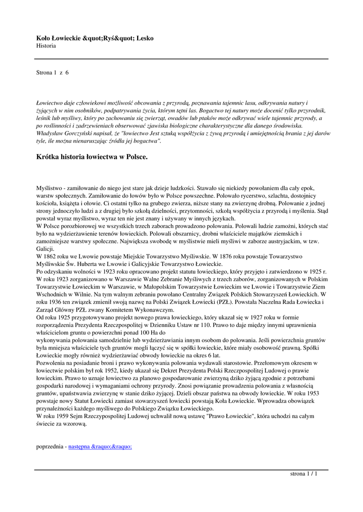 Koło Łowieckie "Ryś" Lesko Historia Strona 1 z 6 Łowiectwo daje człowiekowi możliwość obcowania z przyrodą, poznawania tajemnic lasu, odkrywania natury i żyjących w nim osobników, podpatrywania życia, którym tętni las. Bogactwo tej natury może docenić tylko przyrodnik, leśnik lub myśliwy, który po zachowaniu się zwierząt, owadów lub ptaków może odkrywać wiele tajemnic przyrody, a po roślinności i zadrzewieniach obserwować zjawiska biologiczne charakterystyczne dla danego środowiska. Władysław Gorczyński napisał, że "łowiectwo Jest sztuką współżycia z żywą przyrodą i umiejętnością brania z jej darów tyle, ile można nienaruszając źródła jej bogactwa". Krótka historia łowiectwa w Polsce. Myślistwo - zamiłowanie do niego jest stare jak dzieje ludzkości. Stawało się niekiedy powołaniem dla cały epok, warstw społecznych. Zamiłowanie do łowów było w Polsce powszechne. Polowało rycerstwo, szlachta, dostojnicy kościoła, książęta i ołowie. Ci ostatni tylko na grubego zwierza, niższe stany na zwierzynę drobną. Polowanie z jednej strony jednoczyło ludzi a z drugiej było szkołą dzielności, przytomności, szkołą współżycia z przyrodą i myślenia. Stąd powstał wyraz myślistwo, wyraz ten nie jest znany i używany w innych językach. W Polsce porozbiorowej we wszystkich trzech zaborach prowadzono polowania. Polowali ludzie zamożni, których stać było na wydzierżawienie terenów łowieckich. Polowali obszarnicy, drobni właściciele majątków ziemskich i zamożniejsze warstwy społeczne. Największa swobodę w myślistwie mieli myśliwi w zaborze austryjackim, w tzw. Galicji. W 1862 roku we Lwowie powstaje Miejskie Towarzystwo Myśliwskie. W 1876 roku powstaje Towarzystwo Myśliwskie Św. Huberta we Lwowie i Galicyjskie Towarzystwo Łowieckie. Po odzyskaniu wolności w 1923 roku opracowano projekt statutu łowieckiego, który przyjęto i zatwierdzono w 1925 r. W roku 1923 zorganizowano w Warszawie Walne Zebranie Myśliwych z trzech zaborów, zorganizowanych w Polskim Towarzystwie Łowieckim w Warszawie, w Małopolskim Towarzystwie Łowieckim we Lwowie i Towarzystwie Ziem Wschodnich w Wilnie. Na tym walnym zebraniu powołano Centralny Związek Polskich Stowarzyszeń Łowieckich. W roku 1936 ten związek zmienił swoją nazwę na Polski Związek Łowiecki (PZŁ). Powstała Naczelna Rada Łowiecka i Zarząd Główny PZŁ zwany Komitetem Wykonawczym. Od roku 1925 przygotowywano projekt nowego prawa łowieckiego, który ukazał się w 1927 roku w formie rozporządzenia Prezydenta Rzeczpospolitej w Dzienniku Ustaw nr 110. Prawo to daje między innymi uprawnienia właścicielom gruntu o powierzchni ponad 100 Ha do wykonywania polowania samodzielnie lub wydzierżawiania innym osobom do polowania. Jeśli powierzchnia gruntów była mniejsza właściciele tych gruntów mogli łączyć się w spółki łowieckie, które miały osobowość prawną. Spółki Łowieckie mogły również wydzierżawiać obwody łowieckie na okres 6 lat. Pozwolenia na posiadanie broni i prawo wykonywania polowania wydawali starostowie. Przełomowym okresem w łowiectwie polskim był rok 1952, kiedy ukazał się Dekret Prezydenta Polski Rzeczpospolitej Ludowej o prawie łowieckim. Prawo to uznaje łowiectwo za planowo gospodarowanie zwierzyną dziko żyjącą zgodnie z potrzebami gospodarki narodowej i wymaganiami ochrony przyrody. Znosi powiązanie prowadzenia polowania z własnością gruntów, upaństwawia zwierzynę w stanie dziko żyjącej. Dzieli obszar państwa na obwody łowieckie. W roku 1953 powstaje nowy Statut Łowiecki zamiast stowarzyszeń łowiecki powstają Koła Łowieckie. Wprowadza obowiązek przynależności każdego myśliwego do Polskiego Związku Łowieckiego. W roku 1959 Sejm Rzeczypospolitej Ludowej uchwalił nową ustawę "Prawo Łowieckie", która uchodzi na całym świecie za wzorową. poprzednia - następna »» strona 1 / 1