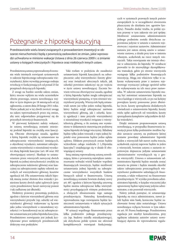 Czwartek, 3 grudzień 2009 Polish Construction Review – Numer 12 (105) Pożegnanie z hipoteką kaucyjną Przedstawiciele wielu branż związanych z prowadzeniem inwestycji w obszarze nieruchomości będą z pewnością zadowoleni ze zmian, jakie wprowadzi uchwalona w minione wakacje Ustawa z dnia 26 czerwca 2009 r. o zmianie ustawy o księgach wieczystych i hipotece oraz niektórych innych ustaw. Przedmiotową ustawą wprowadzonych zostanie wiele istotnych rozwiązań systemowych w zakresie hipotecznego zabezpieczania wierzytelności, które wywołają pewnego rodzaju rewolucję w funkcjonujących od ponad 25 lat przepisach dotyczących hipoteki. Z uwagi na bardzo szeroki zakres zmian, który mocno wpłynie na wielu uczestników obrotu prawnego, ustawa nowelizująca wejdzie w życie dopiero po 18 miesiącach od jej ogłoszenia, a zatem dnia 20 lutego 2011 roku. Warto jednak już w tej chwili zwrócić uwagę na zakres wprowadzanych przez nią zmian, aby móc odpowiednio przygotować się do przyszłych inwestycji finansowych. W pierwszej kolejności należy wskazać, że ustawą nowelizującą zostanie zniesiony podział hipoteki na zwykłą oraz kaucyjną. Obecnie obowiązuje zasada, zgodnie z którą hipoteki zwykłe są ustanawiane na zabezpieczenie wierzytelności istniejących, o określonej wysokości, natomiast zabezpieczeniu wierzytelności o nieustalonej wysokości służą hipoteki kaucyjne (art. 68 oraz 102 obowiązującej ustawy). Skutkuje to ustanawianiem przez wierzycieli zazwyczaj dwóch hipotek na jednej nieruchomości: zwykłej na zabezpieczenie należności głównej oraz kaucyjnej na zabezpieczenie zapłaty odsetek narosłych od wierzytelności głównej, kosztów egzekucji itd. Dla ustanowienia takich hipotek muszą zostać złożone dwa wnioski i poniesione koszty dwóch opłat sądowych (przy czym przedmiotowy koszt zazwyczaj ponosi i tak zadłużony już dłużnik). Niektórzy prawnicy prezentują podejście, zgodnie z którym wierzytelność główna oraz wierzytelności przyszłe (np. odsetki od wierzytelności głównej) traktowane są łącznie jako jedna wierzytelność o nieustalonej wysokości i w konsekwencji na jej zabezpieczenie ustanawiana jest jedna hipoteka kaucyjna. Przedmiotowe rozwiązanie jest jednak krytykowane przez niektórych przedstawicieli doktryny oraz praktyków. 14 Taki rozłam w podejściu do zasadności ustanawiania hipotek kaucyjnych na zabezpieczenie całej wierzytelności (kwoty głównej oraz świadczeń ubocznych takich, jak odsetki) powinien zakończyć się po wejściu w życie ustawy nowelizującej. Zacznie bowiem wówczas obowiązywać zasada, zgodnie z którą hipoteka będzie mogła zabezpieczać wierzytelność pieniężną, w tym również wierzytelność przyszłą. Wierzyciele będą ustanawiali zatem już tylko jeden rodzaj hipoteki, który będzie mógł zabezpieczać zarówno wierzytelność główną, jak i odsetki, koszty egzekucji i inne przyszłe wierzytelności o nieustalonej wysokości związane z wierzytelnością główną, o ile zostaną one wymienione w dokumencie stanowiącym podstawę wpisu hipoteki do księgi wieczystej. Składany będzie tylko jeden wniosek o wpis jednej hipoteki oraz ponoszona będzie jedna opłata sądowa. Efektem powyższych zmian będzie wykreślenie całego rozdziału 2 („Hipoteka kaucyjna”) znajdującego się w dziale II obowiązującej ustawy. Inną zmianą wprowadzoną ustawą nowelizującą, która z pewnością największe zainteresowanie wzbudzi wśród banków wspólnie finansujących inwestycje, będzie możliwość ustanawiania jednej hipoteki na zabezpieczenie wierzytelności wszystkich banków biorących udział w finansowaniu. Ustawą nowelizującą zostanie bowiem dodany nowy art. 682, zgodnie z którym hipoteką umowną będzie można zabezpieczać kilka wierzytelności przysługujących różnym podmiotom, a służących sfinansowaniu tego samego przedsięwzięcia. Naturalną konsekwencją wprowadzenia tego rozwiązania będzie konieczność ustanawiania w takich sytuacjach administratora hipoteki. W sytuacji wspólnego finansowania przez kilka podmiotów jednego przedsięwzięcia (np. budowy osiedla mieszkaniowego), jak dotychczas polski system nie oferował kompleksowych rozwiązań funkcjonują- cych w systemach prawnych innych państw europejskich (a w szczególności stworzenia płaszczyzny do działania tzw. agentów kredytu). Ponadto dodać trzeba, że polski system prawny w tym zakresie nie jest spójny. Możliwość ustanawiania administratorem jednego podmiotu została dotychczas zapewniona jedynie w ustawie o zastawie rejestrowym i rejestrze zastawów. Administrator zastawu jest zatem stroną umów o ustanowienie zastawu, a działa przy tym w imieniu własnym, aczkolwiek na rzecz innych wierzycieli. Takie rozwiązanie nie istnieje obecnie w odniesieniu do hipoteki. W rezultacie prowadzi to do niezwykłego skomplikowania transakcji, gdzie po stronie wierzyciela występuje kilka podmiotów finansujących inwestycję. Mogą oni właściwie tylko w zakresie wykonywania praw z zastawu rejestrowego wyznaczyć jednego spośród siebie do wykonywania na ich rzecz praw zastawnika. W zakresie ustanowienia hipoteki muszą być natomiast ustanawiane hipoteki na rzecz każdego z wierzycieli, co po raz kolejny powiększa koszty ponoszone przez dłużnika (m.in. koszty sporządzenia dodatkowych oświadczeń o ustanowieniu hipoteki, koszty wielu opłat sądowych od wniosków, koszty sporządzania kompletów załączników do kilku wniosków). Dzięki zmianom proponowanym ustawą nowelizującą, w przypadku finansowania inwestycji przez kilka podmiotów możliwe będzie zawarcie umowy, na podstawie której zostanie powołany administrator hipoteki (jeden z wierzycieli lub nawet osoba trzecia, aczkolwiek częściej zapewne będzie to jeden z wierzycieli, bowiem ustawa o zastawie rejestrowym dopuszcza jedynie ustanawianie administratorów wywodzących się z grona wierzyc