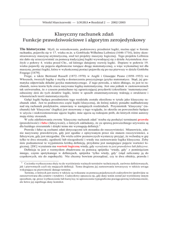 Witold Marciszewski — LOGIKA • Rozdział 2 — 2002/2003 Klasyczny rachunek zdań Funkcje prawdziwościowe i algorytm zerojedynkowy Tło historyczne. Myśl, że wnioskowanie, podstawowy przedmiot logiki, można ujać ˛ w formie rachunku, pojawiła si˛e w 17. wieku m.in. u Gottfrieda Wilhelma Leibniza (1646-1716), który skonstruowawszy maszyn˛e arytmetyczna,˛ snuł też projekty maszyny logicznej. Tego projektu Leibniza nie dało si˛e urzeczywistnić za pomoca˛ tradycyjnej logiki wywodzacej ˛ si˛e z dzieła Arystotelesa Analityki z połowy 4. wieku przed Chr., od którego datujemy rozwój logiki. Dopiero w połowie 19. wieku pojawiły si˛e poj˛ecia algebraiczne torujace ˛ drog˛e matematycznej, a wi˛ec wykonalnej też dla maszyny, postaci logiki, która w wykończonej postaci pojawiła si˛e po raz pierwszy w dziele Gottloba Fregego [1879]. Frege, a także Bertrand Russell (1872–1970) w Anglii i Giuseppe Peano (1858–1932) we Włoszech, tworzyli logik˛e z myśla˛ o dostarczeniu precyzyjnego j˛ezyka matematyce. Stad, ˛ jej gramatyka odpowiada składni j˛ezyka matematycznego. Z tego powodu, a także dlatego, że jest to rachunek, nowa teoria była zrazu nazywana logika˛ matematyczna.˛ Jest ona jednak w zastosowaniach tak uniwersalna, że z czasem poniechano tej ograniczajacej ˛ przydawki (określenie ‘matematyczna’ odnosimy dziś do tych działów logiki, które w sposób zmatematyzowany traktuja˛ o strukturze i własnościach teorii matematycznych). Gałaź ˛ logiki b˛edaca ˛ przedmiotem tego rozdziału została określona w tytule jako klasyczny rachunek zdań. Jest to podstawowa cz˛eść logiki klasycznej, do której należy ponadto nadbudowany nad nia˛ rachunek predykatów, omawiany w nast˛epnych rozdziałach. Przymiotnik ‘klasyczny’ (rachunek) lub ‘klasyczna’ (logika) jest stosowany z tego wzgl˛edu, że określa on powszechnie b˛edace ˛ w użyciu i niekwestionowane uj˛ecie logiki; inne uj˛ecia sa˛ rodzajem prób, do których różni autorzy maja˛ różny stosunek. W celu zdefiniowania zwrotu ‘klasyczny rachunek zdań’ trzeba si˛e posłużyć terminami prawda (prawdziwość) i fałsz (fałszywość), o których zakładamy, że za sprawa˛ powszechnego używania sa˛ dla każdego zrozumiałe i dzi˛eki temu nie wymagaja˛ definicji.1 Prawda i fałsz sa˛ cechami zdań dotyczacymi ˛ ich stosunku do rzeczywistości. Mianowicie, zdanie nazywamy prawdziwym, gdy jest zgodne z opisywanym przez nie stanem rzeczywistości, a fałszywym, gdy jest niezgodne. Do wielu celów poznawczych wystarczy przyjać, ˛ że wchodza˛ w gr˛e tylko te dwa stosunki, zgodność lub niezgodność i wtedy ma zastosowanie logika klasyczna. Żeby móc podsumować te wyjaśnienia krótka˛ definicja,˛ przydatne jest nast˛epujace ˛ poj˛ecie wartości logicznej. [Df:] wyrażenie ma wartość logiczna˛ wtedy, gdy wyrażenie to jest prawdziwe lub fałszywe. Definicja ta jest z rozmysłem zbudowana za pomoca˛ spójnika ‘wtedy, gdy’ z pomini˛eciem innego, cz˛esto spotykanego w definicjach, spójnika ‘tylko wtedy, gdy’ (stad ˛ zaliczamy ja˛ do czastkowych, ˛ nie do zupełnych). Nie chcemy bowiem przesadzać, ˛ czy te dwa obiekty, prawda i 1 Czcionka wytłuszczona służy tu do wyróżnienia ważnych terminów technicznych, zarówno definiowanych, jak i pierwotnych czyli nie majacych ˛ definicji. Temu drugiemu jej zastosowaniu towarzyszy w tekście uwaga wskazujaca ˛ na pierwotność danego terminu. Terminy, o których jest mowa w tekście sa˛ wskazane za pomoca˛ pojedynczych cudzysłowów (podwójne sa zarezerwowane dla cytatów i tytułów). Cudzysłowy opuszcza si˛e, gdy dany temin został już wyróżniony innym sposobem, np. przez wytłuszczenie lub kursyw˛e; to uproszczenie typograficzne pociaga ˛ pewna˛ wieloznaczność, ale łatwo jej zapobiega dany kontekst. 2 W. Marciszewski: Logika etc. • 2. Klasyczny Rachunek Zdań fałsz, wyczerpuja˛ zbiór wszystkich wartości logicznych. W rozważaniach filozoficznych nad stosunkiem naszej myśli i j˛ezyka do rzeczywistości zauważa si˛e, że o pewnych zdaniach nie da si˛e z sensem powiedzieć, że sa˛ zgodne lub niezgodne z rzeczywistościa.˛ Należałoby wtedy powiedzieć, że sa˛ one pod tym wzgl˛edem nieokreślone i uznać taka˛ nieokreśloność za osobna˛ wartość logiczna.˛ Wtedy wartości logicznych b˛edzie conajmniej trzy, a możliwe sa˛ rozważania prowadzace ˛ do jeszcze wi˛ekszej ich liczby. Racje przemawiajace ˛ za trzecia˛ wartościa,˛ zwiazane ˛ sa˛ zwykle z jakimś stanowiskiem filozoficznym. Jednym z przykładów jest spór teologów, czy zdania o ludzkich przyszłych uczynkach b˛edacych ˛ wynikiem wolnej woli maja˛ wartość prawdy lub fałszu, czy może owa˛ trzecia˛ wartość nieokreśloności (powstaje jednak problem, czy jej przyj˛ecie nie implikuje ograniczenia Boskiej wszechwiedzy). Inne racje biora˛ si˛e z pewnych rozważań w filozofii matematyki, jeszcze inne z refleksji metodologicznej nad fizyka˛ kwantowa.˛ Pierwze systemy logiki wielowartosciowej stworzyli około roku 1920 polski filozof Jan Łukasiewicz i amerykański matematyk polskiego pochodzenia Emil Post. Logika klasyczna, abstrahujac ˛ od wspomnianych kwestii filozoficznych, ogranicza liczb˛e wartości logicznych do dwóch; łaczy ˛ si˛e to z takim rozumieniem negacji (wyrażanej przez zwrot przeczacy ˛ ‘nie jest tak, że’ lub krótkie ‘nie’), że negacja zdania prawdziwego daje zdanie fałszywe, a negacja fałszywego daje zdanie prawdziwe. Podsumujmy to, jak nast˛epuje. [Df:]: rachunek zdań jest klasyczny wtedy i tylko wtedy, gdy prawda i fałsz sa˛ w nim jedynymi wartościami logicznymi. Tym sposobem określamy, co to znaczy, że teoria logiczna jest klasyczna. A co znaczy, że jest rachunkiem zadń, o tym traktuje reszta obecnego rozdziału. Konstrukcja rozdziału. Pierwsza cz˛eść omawia poj˛ecie funkcji prawdziwościowej, druga funkcje prawdziwoś