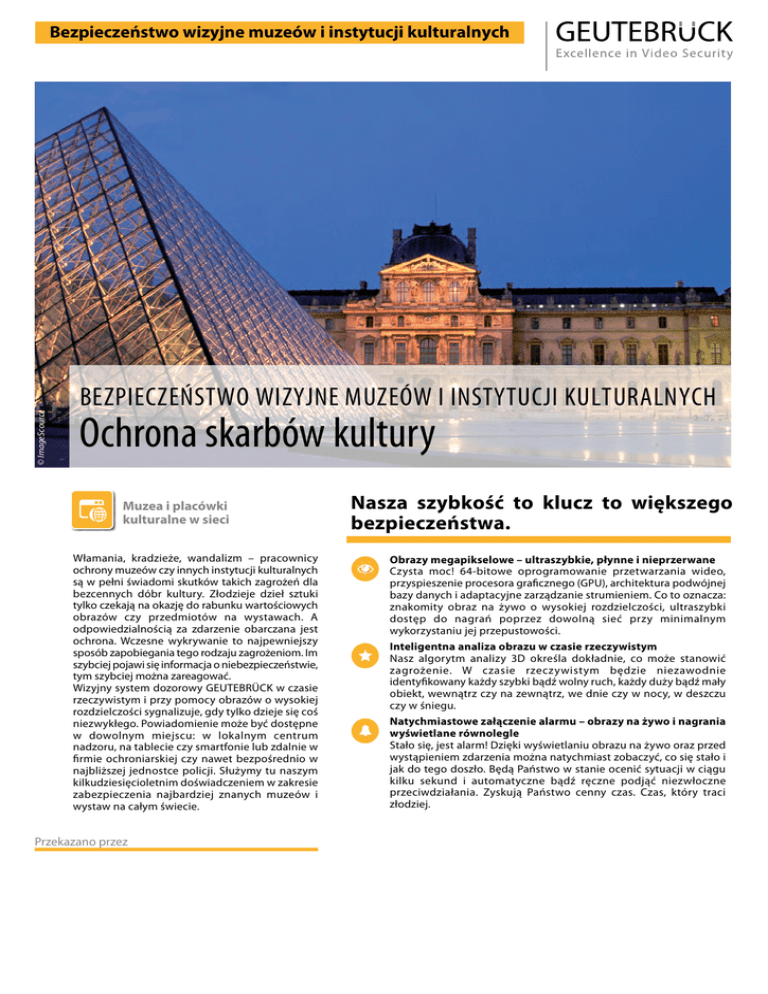© ImageScource Bezpieczeństwo wizyjne muzeów i instytucji kulturalnych BEZPIECZEŃSTWO WIZYJNE MUZEÓW I INSTYTUCJI KULTURALNYCH Ochrona skarbów kultury Muzea i placówki kulturalne w sieci Włamania, kradzieże, wandalizm – pracownicy ochrony muzeów czy innych instytucji kulturalnych są w pełni świadomi skutków takich zagrożeń dla bezcennych dóbr kultury. Złodzieje dzieł sztuki tylko czekają na okazję do rabunku wartościowych obrazów czy przedmiotów na wystawach. A odpowiedzialnością za zdarzenie obarczana jest ochrona. Wczesne wykrywanie to najpewniejszy sposób zapobiegania tego rodzaju zagrożeniom. Im szybciej pojawi się informacja o niebezpieczeństwie, tym szybciej można zareagować. Wizyjny system dozorowy GEUTEBRÜCK w czasie rzeczywistym i przy pomocy obrazów o wysokiej rozdzielczości sygnalizuje, gdy tylko dzieje się coś niezwykłego. Powiadomienie może być dostępne w dowolnym miejscu: w lokalnym centrum nadzoru, na tablecie czy smartfonie lub zdalnie w firmie ochroniarskiej czy nawet bezpośrednio w najbliższej jednostce policji. Służymy tu naszym kilkudziesięcioletnim doświadczeniem w zakresie zabezpieczenia najbardziej znanych muzeów i wystaw na całym świecie. Przekazano przez Nasza szybkość to klucz to większego bezpieczeństwa. Obrazy megapikselowe – ultraszybkie, płynne i nieprzerwane Czysta moc! 64-bitowe oprogramowanie przetwarzania wideo, przyspieszenie procesora graficznego (GPU), architektura podwójnej bazy danych i adaptacyjne zarządzanie strumieniem. Co to oznacza: znakomity obraz na żywo o wysokiej rozdzielczości, ultraszybki dostęp do nagrań poprzez dowolną sieć przy minimalnym wykorzystaniu jej przepustowości. Inteligentna analiza obrazu w czasie rzeczywistym Nasz algorytm analizy 3D określa dokładnie, co może stanowić zagrożenie. W czasie rzeczywistym będzie niezawodnie identyfikowany każdy szybki bądź wolny ruch, każdy duży bądź mały obiekt, wewnątrz czy na zewnątrz, we dnie czy w nocy, w deszczu czy w śniegu. Natychmiastowe załączenie alarmu – obrazy na żywo i nagrania wyświetlane równolegle Stało się, jest alarm! Dzięki wyświetlaniu obrazu na żywo oraz przed wystąpieniem zdarzenia można natychmiast zobaczyć, co się stało i jak do tego doszło. Będą Państwo w stanie ocenić sytuacji w ciągu kilku sekund i automatyczne bądź ręczne podjąć niezwłoczne przeciwdziałania. Zyskują Państwo cenny czas. Czas, który traci złodziej. Bezpieczeństwo wizyjne muzeów i instytucji kulturalnych ROZWIĄZANIA DO OCHRONY WYSTAW Dozór ogrodzenia Każde wejście osoby nieuprawnionej na strzeżony teren, szczególnie nocą, może być początkiem próby włamania. Z tego względu dobrze jest mieć podgląd granic obiektu. Otoczenie budynku jest monitorowane przy pomocy profesjonalnych, sieciowych kamer termowizyjnych działających bez rzucającego się w oczy oświetlenia. Każdy obiekt przemieszczający się w polu widzenia kamer jest wykrywany, analizowany, monitorowany i śledzony przez system analizy obrazu G-Tect/VMX. Pozwala to określić jego kierunek, wielkość i szybkość. Możliwe jest zaprogramowanie jakie obiekty poruszające się w jakich kierunkach wyzwolą alarm lub czy będą tylko wyświetlane prewencyjnie. Zobaczą Państwo najmniejsze podejrzane detale bez potrzeby ciągłego patrzenia na ekran. Wizyjny system dozorowy to niezawodny elektroniczny strażnik, na którym można polegać. Monitorowanie wystaw w ciągu dnia Po otwarciu wystawy system wizyjny automatycznie przełącza się na tryb monitorowania. W trybie tym prowadzony jest ciągły zapis obrazu z kamer wewnątrz obiektu. Przegląd całości można uzyskać poprzez ręczne lub automatyczne przełączanie obrazów z kamer w zaprogramowanej sekwencji. Opierając się na doświadczeniu, można wychwycić szczególne zachowanie gości będące próbą rozpoznania sytuacji. Wystarczy wyróżnić takie zachowanie znacznikami. Znaczniki są zapisywane na liście, dzięki czemu możliwa jest szczegółowa ocena obrazu i jego trwały zapis w razie potrzeby. Nagrania można łatwo eksportować lub przekazywać jako poszczególne ramki bądź plik wizyjny. Miejscem docelowym może być pamięć USB lub płyta DVD Video. Bezpieczeństwo wizyjne muzeów i instytucji kulturalnych Dozór nocny w zastosowaniach wewnętrznych Wystawa zamknięta, wszyscy goście opuścili budynek – świeci się oświetlenie awaryjne. Wizyjny system dozorowy pracuje teraz w trybie alarmowym. W kamerach wewnętrznych działa funkcja analizy obrazu. Każdy wykryty ruch w pomieszczeniu uruchamia zapis obrazu na żywo i natychmiastowe wyświetlanie obrazów alarmowych w pokoju strażników. Dzięki przekazywaniu alarmów w sieci lokalnej, przez internet czy e-mail automatycznie bądź ręcznie w ciągu kilku sekund na podstawie czytelnego obrazu sytuację może ocenić współpracująca firma ochroniarska lub najbliższa jednostka policji. Obraz można wyświetlać również na smartfonie i tablecie. Opis sprawcy? Nie jest konieczny, obraz wart jest więcej niż tysiąc słów! Ochrona przed sabotażem kamer System wizyjny może również chronić sam siebie. Wbudowana funkcja autoryzacji położenia kamery G-Tect/SV (Scene Validation) wykrywa obrócenie, zamalowanie sprayem, zakrycie lub inne działania podjęte celowo lub nie, skutkujące ograniczeniem funkcjonalności kamery. W przypadku wykrycia takich skutków podejmowane jest działanie alarmowe. Zalecamy automatyczne wyświetlanie obrazu z sąsiednich kamer, jak również nagrań sprzed wystąpienia zdarzenia w danej kamerze. W ten sposób dowiedzą się Państwo, jak doszło do niesprawności kamery i kto ponosi odpowiedzialność. Bezpieczeństwo wizyjne muzeów i instytucji kulturalnych Bezpieczeństwo najbardziej wartościowych dzieł sztuki Najbardziej wartościowe dzieła sztuki można zabezpieczyć przy pomocy wizyjnego systemu dozorowego. Możliwe jest utworzenie „n