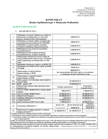 Załącznik nr 1 do uchwały nr 8/25/2016 Zarządu Banku Spółdzielczego w Radzyniu Podlaskim z dnia 15 grudnia 2016 r. KOMUNIKAT Banku Spółdzielczego w Radzyniu Podlaskim KLIENCI DETALICZNI I. 1. 2. 3. 4. 5. 6. 7. 8. 9. RACHUNKI W PLN: Minimalna wysokość wkładu oraz wpłat na książeczkę oszczędnościową a’vista (nie dotyczy Szkolnych Kas Oszczędności) Minimalna wysokość wpłaty na książeczkę oszczędnościową terminową STANDARD Minimalna wysokość wpłaty na lokatę terminową składaną drogą internetową Minimalna kwota progresywnej lokaty oszczędnościowej Minimalna kwota terminowej lokaty oszczędnościowej „Lokata z kontem” Maksymalna miesięczna kwota wypłat do rąk przedstawiciela ustawowego z rachunku osoby małoletniej, po ukończeniu 13 roku życia Minimalne miesięczne wpływy na ROR VIP Minimalna kwartalna kwota wpłat na ROR JUNIOR Maksymalna wysokość debetu dopuszczalnego w ROR 11.2 11.3 11.4 11.5 11.6 Maksymalna wysokość kredytu odnawialnego w ROR: ROR- pakiety STANDARD, OSZCZĘDNY i ELECTRO ROR – pakiet VIP Maksymalny dzienny limit operacji z kart bankowych: Visa CLASSIC DEBETOWA (Pakiet ROR Junior) Visa CLASSIC DEBETOWA MasterCard Paypass Naklejka zbliżeniowa Visa Paywave Usługa biometrii Karta kredytowa BPS Visa Credit 12. Transakcje zbliżeniowe** 13. Jednorazowa wypłata gotówki w ramach usługi cash back*** 10. 10.1 10.2 11. 11.1 100,00 PLN 100,00 PLN 1 000,00 PLN 1 000,00 PLN 5 000,00 PLN 2 000,00 PLN 3 000,00 PLN 50,00 PLN 800,00 PLN nie więcej jednak niż stałe wpływy na rachunek z ostatniego miesiąca kalendarzowego 20 000,00 PLN 40 000,00 PLN Wypłaty gotówkowe 500,00 PLN Transakcje bezgotówkowe * 1 000,00 PLN 10 000,00 PLN 10 000,00 PLN 0,00 PLN 10 000,00 PLN 2 000,00 PLN Karta Visa --------------do 300,00 PLN 50 000,00 PLN 50 000,00 PLN 50 000,00 PLN ------------20 000,00 PLN Naklejka Karta MasterCard zbliżeniowa 50,00 PLN 50,00 PLN do 300,00 PLN ---------------- *wypłaty gotówkowe obniżają dzienny limit transakcyjny **transakcje przeprowadzane jedynie na terenie Polski, limit dotyczy pojedynczej (jednorazowej) transakcji ***warunkiem wypłaty jest jednoczesne dokonanie transakcji bezgotówkowej dokonanej na terenie Polski- nie jest możliwa sama wypłata gotówki Limity na transakcje bezgotówkowe dokonywane kartą VISA lub MasterCard oraz naklejką zbliżeniową dotyczą również transakcji internetowych. Klient ma możliwość odrębnego zdefiniowania limitów na transakcje internetowe. Klienci Banku mają możliwość bezprowizyjnej wypłaty gotówki kartą płatniczą VISA CLASSIC DEBETOWA w bankomatach wszystkich banków na terenie całego kraju – usługa dostępna od dnia 01.02.2011 r. i nie dotyczy Pakietu ROR OSZCZĘDNY 1 II. 1. 1.1 1.2 1.3 2. 2.1 2.2 3. III. RACHUNKI W WALUTACH WYMIENIALNYCH: Minimalna wysokość wkładu oraz wpłat na rachunek oszczędnościowy płatny na każde żądanie: Dolar amerykański (USD) 20 USD Euro (EUR) 20 EUR Funt brytyjski (GBP) 20 GBP Minimalna wysokość wkładu na lokatach terminowych: Dolar amerykański (USD) 100 USD Euro (EUR) 100 EUR 1) Wypłaty gotówkowe powyżej kwoty: a) 1000 USD b) 1000 EUR c) 500 GBP należy zgłaszać z wyprzedzeniem co najmniej 5 dni roboczych w placówce Banku prowadzącej rachunek 2) Wypłaty gotówkowe powyżej kwoty: a) 5 000 GBP należy zgłaszać z wyprzedzeniem co najmniej 10 dni roboczych w placówce Banku prowadzącej rachunek 3) Bank nie przyjmuje wpłat gotówkowych i nie realizuje wypłat gotówkowych w bilonie walut wymienialnych. Kwoty nie mające pokrycia w banknotach danej waluty wymienialnej Bank wypłaca w złotych. 4) Przy obsłudze rachunków w walutach wymienialnych stosowane są kursy Banku: a) Kupna/sprzedaży dla dewiz – do rozliczeń operacji bezgotówkowych, b) Kupna/sprzedaży dla pieniędzy – do rozliczeń operacji gotówkowych. INNE POSTANOWIENIA: Kwota środków pieniężnych wolnych od zajęcia na podstawie 1 500,00 PLN w każdym miesiącu sądowego lub administracyjnego tytułu wykonawczego, w każdym kalendarzowym miesiącu kalendarzowym, w którym obowiązuje zajęcie – do (minimalne wynagrodzenie 1. wysokości 75% minimalnego wynagrodzenia za pracę ustalanego na w 2017 r. – dany rok, przysługującego pracownikowi zatrudnionemu w pełnym 2 000,00 PLN) miesięcznym wymiarze czasu pracy Kwota zapisu na wypadek śmierci – nie więcej niż przypadające na 85 542,80 PLN ostatni miesiąc przed śmiercią Posiadacza rachunku (przeciętne wynagrodzenie za dwudziestokrotne przeciętne miesięczne wynagrodzenie w sektorze 2. miesiąc styczeń 2017 r. – przedsiębiorstw, bez wypłat nagród z zysku, ogłoszone przez Prezesa 4 277,14 PLN) Głównego Urzędu Statystycznego Obowiązkowy system gwarantowania środków przez Bankowy 3. System Gwarancyjny: do wysokości (łącznie z odsetkami naliczonymi zgodnie z umową – 3.1 do dnia spełnienia warunku gwarancji) równowartości w złotych 100 % 100 000 EUR Maksymalne kwoty wypłat dziennych w bankach Zrzeszenia 4. Banku Polskiej Spółdzielczości S.A. 4.1 Realizowanych na podstawie czeków: 4.1.1. bez potwierdzenia 500,00 PLN 4.1.2 mających potwierdzenie 2 500,00 PLN 4.2 realizowanych na podstawie książeczki a’vista 4.2.1 bez potwierdzenia 500,00 PLN na podstawie telefonicznego potwierdzenia salda uzyskanego 4.2.2 2 500,00 PLN z jednostki operacyjnej prowadzącej konto oszczędnościowe do rąk osoby małoletniej powyżej 13 lat, o ile nie została ubezwłasnowolniona całkowicie, jednak pisemne zastrzeżenie przedstawiciela ustawowego osoby małoletniej może ograniczyć 4.2.3 500,00 PLN wypłatę do kwoty niższej lub wyłączyć możliwość wypłat przez małoletniego (informacja o zastrzeżeniu zamieszczana jest w książeczce a’vista) 4.2.4 Stan wkładu na książeczce a’vista po podjęciu ostatniej wypłaty nie niższy niż 5,00 PLN 4.2.5 Minimalna kwota wpłaty na książeczkę a’vista 5,00 PLN 2 5. 5.1 5.2 6. 7. 8. 9. 10. 11. 12.