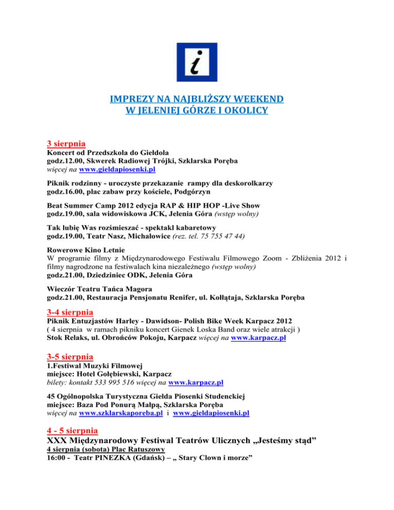 IMPREZY NA NAJBLIŻSZY WEEKEND W JELENIEJ GÓRZE I OKOLICY 3 sierpnia Koncert od Przedszkola do Giełdola godz.12.00, Skwerek Radiowej Trójki, Szklarska Poręba więcej na www.gieldapiosenki.pl Piknik rodzinny - uroczyste przekazanie rampy dla deskorolkarzy godz.16.00, plac zabaw przy kościele, Podgórzyn Beat Summer Camp 2012 edycja RAP & HIP HOP -Live Show godz.19.00, sala widowiskowa JCK, Jelenia Góra (wstęp wolny) Tak lubię Was rozśmieszać - spektakl kabaretowy godz.19.00, Teatr Nasz, Michałowice (rez. tel. 75 755 47 44) Rowerowe Kino Letnie W programie filmy z Międzynarodowego Festiwalu Filmowego Zoom - Zbliżenia 2012 i filmy nagrodzone na festiwalach kina niezależnego (wstęp wolny) godz.21.00, Dziedziniec ODK, Jelenia Góra Wieczór Teatru Tańca Magora godz.21.00, Restauracja Pensjonatu Renifer, ul. Kołłątaja, Szklarska Poręba 3-4 sierpnia Piknik Entuzjastów Harley - Dawidson- Polish Bike Week Karpacz 2012 ( 4 sierpnia w ramach pikniku koncert Gienek Loska Band oraz wiele atrakcji ) Stok Relaks, ul. Obrońców Pokoju, Karpacz więcej na www.karpacz.pl 3-5 sierpnia 1.Festiwal Muzyki Filmowej miejsce: Hotel Gołębiewski, Karpacz bilety: kontakt 533 995 516 więcej na www.karpacz.pl 45 Ogólnopolska Turystyczna Giełda Piosenki Studenckiej miejsce: Baza Pod Ponurą Małpą, Szklarska Poręba więcej na www.szklarskaporeba.pl i www.gieldapiosenki.pl 4 - 5 sierpnia XXX Międzynarodowy Festiwal Teatrów Ulicznych „Jesteśmy stąd” 4 sierpnia (sobota) Plac Ratuszowy 16:00 - Teatr PINEZKA (Gdańsk) – „ Stary Clown i morze” 17:00 18:00 19:15 20:00 21:30 21:45 - Teatr KLINIKA LALEK (Wolimierz) – „13 ekscentryków i słoooń” Teatr NA BRUKU (Wrocław) – „Piastowie” Teatr PRAWDZIWY (Bielawa) – „Wędrowcy” Teatr NIKOLI (Polska/Ukraina) – „Maruczella” uroczyste otwarcie festiwalu Teatr Sztuki Ruchu OCELOT (Złotoryja) 5 sierpnia (niedziela) Plac Ratuszowy 15:00 – 18:00 - GLINOLUDY (Bolesławiec) – „Parada z miłości do gliny” – charakteryzacja, happeningi, parada * – Plac Ratuszowy i uliczki starego miasta 16:00 – Clown Feliks (Kraków) – „Ale cyrki!” 18:00 - Teatr PINEZKA (Gdańsk) – „Zielona Kraina” 19:00 - Teatr KLINIKA LALEK (Wolimierz) – „Księga Gór” 20:30 - JANUSZ GRZYWACZ (Kraków) – „Muzyka osobista” – recital na instrumentach klawiszowych 21:30 - Teatr WOSKRESINNIA (Ukraina) – „Spotkać Prospera” więcej na www.teatrnorwida.pl organizator: Miasto Jelenia Góra, Teatr im. Cypriana Kamila Norwida Bezpieczne Lato w Górach godz.11.00, Schronisko Kamieńczyk więcej na www.szklarskaporeba.pl 4 sierpnia - sobota IV Maraton Karkonoski Mistrzostwa Świata w Długodystansowym Biegu Górskim 2012 godz.8.30, dolna stacja wyciągu na Szrenicę (do pokonania 44 km) więcej na www.szklarskaporeba.pl i www.maratonkarkonoski.pl Dzień Otwarty w Muzeum Miejskim „Dom Gerharta Hauptmanna” tradycyjnie w rocznicę zamieszkania Gerharta Hauptmanna w Willi „Łąkowy Kamień” podczas, którego oferujemy bezpłatny wstęp do muzeum i oprowadzanie, atrakcje w parku; otwarcie wystawy „Gerhart Hauptmann i Śląscy Nobliści”, spektakl operowy „Muzyczny Ogród Liczyrzepy” w ramach międzynarodowych warsztatów operowych organizowanych przez Międzynarodowe Towarzystwo Artystyczne „Opera Ducha Gór” w Karpaczu (wstęp wolny) godz. 9.00-18.00 w muzeum przy ul. Michałowickiej 32, Jelenia Góra- Jagniątków organizator: Miasto Jelenia Góra, Muzeum Miejskie „Dom Gerharta Hauptmanna" Wakacje z Przyrodą i Przygodą „O czym szumią Karkonoskie lasy” ( czas przejścia 4 godz.) godz.9.00, Szkółka KPN, ul. Myśliwska 9a, Jelenia Góra- Jagniątków więcej na www.kpnmab.pl Jeleniogórskie wycieczki sakralne; Zbiórka godz. 10.00, Apteka pod Koroną, Jelenia Góra- Cieplice zwiedzanie kościołów w Jeleniej Górze - Cieplicach; prowadzenie Antoni Witczak. organizator: PTTK Oddział „Sudety Zachodnie” Jelenia Góra V spacer krajoznawczy - prowadzący Krzysztof Tęcza Z Jagniątkowa czarnym szlakiem w kierunku Petrowki godz.10.00, przy Gospodzie Wedle Bucków, Jagniątków Aktywny wypoczynek z instruktorem godz.10.00, Droga Chomontowa, Karpacz Górny więcej na www.aktywnie.karpacz.pl Pinokio - bajka cyrkowa godz.12.00, Cyrkland, Miłków 26 c więcej na www.cyrkland.eu konieczna rezerwacja pod tel. 500 101 671 Koncert Giełda Miastu i Bicie Gitarowego Rekordu Świata godz.15.00, Park Rodzinny Esplanada, Szklarska Poręba kontakt: 75 717 3614 Koncert promenadowy w wykonaniu zespołu Re-gypz godz. 16.00 w muszli koncertowej w Parku Zdrojowym, Jelenia Góra- Cieplice organizator: Miasto Jelenia Góra, Przystań Twórcza - Cieplickie Centrum Kultury Muzycznie i nastrojowo... Marek Chuderewicz wokalista i gitarzysta zaprasza do wspólnej zabawy. godz. 19.00-24.00, Hotel*** Caspar, Jelenia Góra-Cieplice (bilet wstępu 10,- zł, rezerwacje stolików tel. 75 64 55 001) Wakacyjna loteria kabaretowa godz.19.00, Teatr Nasz, Michałowice (rez. tel. 75 755 47 44) Muzyka w Kościółku „Wang” godz.20.00, Kościół „Wang”, Karpacz więcej na www.karpacz.pl organizator: Fundacja „Karkonosze- Muzyka Serc” Dancing godz.20.00,Hotel Fenix, Jelenia Góra do 5 sierpnia Międzynarodowe Mistrzostwa Polski Western i Rodeo miejsce: Western City, Ściegny więcej na www.western.com.pl 5 sierpnia - niedziela XLII Rajd na raty Wyjazd pociągiem o godz. 7.25 Jelenia Góra - Harrachov (PKP); Harrachov - Kořenov (ČD), Kořenov - Jizerka - schronisko Orle - Jakuszce, Jakuszyce - Jelenia Góra (PKP; PKS) organizator: PTTK Oddział „Sudety Zachodnie” Jelenia Góra Relaks z Rowerem godz. 8.00 zbiórka na dworcu PKP w Jeleniej Górze Przejazd pociągiem do Marciszowa, Wieściszowice, Kolorowe Jeziorka, Raszów, Pisarzowice, Rędziny, Rozkosz, Miedzianka, Janowice Wielkie, Trzcińsko, Wojanów, Jelenia Góra; trasa liczy około 65 km; Uwaga! podczas wycieczki możemy zbierać punkty do odznaki kolarskiej; uc