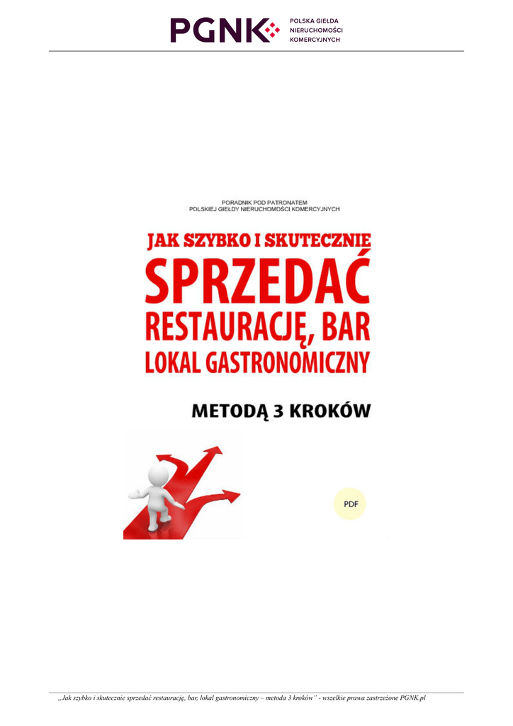 „Jak szybko i skutecznie sprzedać restaurację, bar, lokal gastronomiczny – metoda 3 kroków” - wszelkie prawa zastrzeżone PGNK.pl 1 Poradnik pod patronatem Polskiej Giełdy Nieruchomości Komercyjnych www.PGNK.pl Praktyczny poradnik szybkiej i skutecznej sprzedaży restauracji, baru oraz pozostałych lokali gastronomicznych metodą 3 kroków Jeżeli w tej chwili czytasz przygotowany przez nas poradnik, to znaczy, że zamierzasz sprzedać swoją restaurację, bar, pub, kawiarnię, herbaciarnię czy cukiernię. Ten poradnik przeprowadzi Cię krok po kroku przez cały ten proces. Podamy Ci informacje jak dokładnie możesz określić przedmiot sprzedaży i jego stan prawny. Wyjaśnimy Ci jakie dokumenty powinieneś przygotować do sfinalizowania transakcji. Podamy Ci również różne sposoby na wycenę Twojej nieruchomości oraz podpowiemy, jak przygotować ją do sprzedaży. Przeanalizujemy z Tobą w jaki sposób, w jakiej formie i gdzie umieścić Twoją ofertę sprzedaży aby Twoja nieruchomość szybko znalazła nabywcę. Dodatkowo podpowiemy Ci w jakich przypadkach warto skorzystać z pomocy agencji obrotu nieruchomościami. Życzymy szybkiej transakcji i zadowalającej ceny! „Jak szybko i skutecznie sprzedać restaurację, bar, lokal gastronomiczny – metoda 3 kroków” - wszelkie prawa zastrzeżone PGNK.pl 2 Krok 1 A w nim: dokładne określenie przedmiotu sprzedaży, czyli Twojej nieruchomości, jej stanu prawnego oraz dokumentów wymaganych do sprzedaży. Co sprzedajesz? Choć pozornie, pytanie to może się wydawać niezrozumiałe – bo każdy dobrze wie co chce sprzedać – mieliśmy okazję niejednokrotnie się przekonać, że jednak nie każdy wie, co dokładnie sprzedaje (np. granice i wielkości działek). Oferując do sprzedaży nieruchomość musisz mieć świadomość, że potencjalny kupujący dokładnie sprawdzi informacje i stan prawny Twojej działki oraz posadowionych na niej budynków. W związku z tym, to Ty jako pierwszy powinieneś wiedzieć o niej wszystko, gdyż to może pomóc Ci w ustaleniu atrakcyjnej ceny Twojej nieruchomości, udanych negocjacjach oraz szybkim jej zbyciu. W końcu przecież po to zamówiłeś ten poradnik! Po pierwsze, musisz dokładnie ustalić stan faktyczny swojej nieruchomości, czyli wielkość, położenie, granice, itp. oraz wszystkie sprawy dotyczące własności i ewentualnych obciążeń hipoteki. Powyższe informacje (aktualny stan, również prawny) ustalisz dzięki Ewidencji Gruntów i Budynków oraz w Księdze Wieczystej. Potem zapoznaj się z Miejscowym Planem Zagospodarowania Przestrzennego (a w przypadku jego braku ze studium). Kompletowanie dokumentacji oraz ustalenie stanu prawnego Różnica między Księgami Wieczystymi a Ewidencją Gruntów i Budynków sprowadza się do tego, że Księgi Wieczyste prowadzone są w celu ustalenia stanu prawnego nieruchomości, natomiast w EGiB uwidacznia się stan rzeczywisty. Wpis do EGiB ma przede wszystkim znaczenie informacyjne. „Jak szybko i skutecznie sprzedać restaurację, bar, lokal gastronomiczny – metoda 3 kroków” - wszelkie prawa zastrzeżone PGNK.pl 3 Ewidencja Gruntów i Budynków to prowadzony w jednolity sposób dla całego kraju zbiór informacji o gruntach, budynkach i lokalach oraz ich właścicielach i władających. Tak zwany operat ewidencyjny składa się z rejestrów, map i dokumentów uzasadniających wpisy do rejestrów. Ewidencja gruntów obejmuje m.in. informacje dotyczące położenia, granic i powierzchni gruntów, rodzajów użytków gruntowych oraz ich klas gleboznawczych. Można w nich również znaleźć oznaczenie ksiąg wieczystych lub innego zbioru dokumentów, jeżeli zostały założone dla nieruchomości, w skład której wchodzą grunty. Ponadto w ewidencji gruntów wskazuje się także właściciela nieruchomości. Ewidencja budynków zawiera m.in. informacje dotyczące położenia, przeznaczenia, funkcji użytkowych i ogólnych danych technicznych budynku. Tu również, jak w przypadku ewidencji gruntów wskazuje się właściciela nieruchomości, jego miejsce zamieszkania lub siedzibę oraz informacje o ewentualnym wpisaniu do rejestru zabytków. W przypadku ewidencji lokali, podawane są informacje o ich położeniu, funkcji oraz powierzchni użytkowej. Informacje z ewidencji gruntów, czyli tzw. wypis (dane o nieruchomości) i wyrys (kopia mapy z granicami działek, obrysem budynków, itp.) można uzyskać w Starostwie Powiatowym lub Urzędzie Miasta na prawach powiatu. Są one jawne i udzielane odpłatnie – wypis i wyrys może otrzymać właściciel lub władający oraz osoba, która wykaże interes prawny w pozyskaniu danych z ewidencji. ! RADA ! Jeżeli do sprzedawanej nieruchomości nie są doprowadzone jakieś media, to istnieje sposób, aby „uspokoić” kupującego. Możesz zaproponować mu przejrzenie tzw. mapy zasadniczej, na której przyszły właściciel zobaczy jak daleko od działki znajdują się wszystkie media. Dostępna jest ona w miejscu, gdzie otrzymuje się wypisy i wyrysy w Starostwie lub Urzędzie Miasta. „Jak szybko i skutecznie sprzedać restaurację, bar, lokal gastronomiczny – metoda 3 kroków” - wszelkie prawa zastrzeżone PGNK.pl 4 Księgi Wieczyste – przedstawiają stan prawny nieruchomości. Dzięki nim możemy ustalić komu i jakie przysługują prawa do danej nieruchomości. Księga wieczysta składa się z 4 działów w których wpisuje się: dział I: dział I-O: „Oznaczenie nieruchomości” – dane pochodzące z ewidencji gruntów, pozwalające na dokładne oznaczenie nieruchomości, dział I-Sp: „Spis praw związanych z własnością” – ewentualne prawa związane z prawem własności wpisanej nieruchomości, dział II – oznaczenie właściciela (właścicieli) lub użytkownika wieczystego, dział III – ograniczone prawa rzeczowe (z wyjątkiem hipotek), ograniczenia w rozporządzaniu nieruchomością lub użytkowaniem wieczystym oraz prawa osobiste i roszczeni