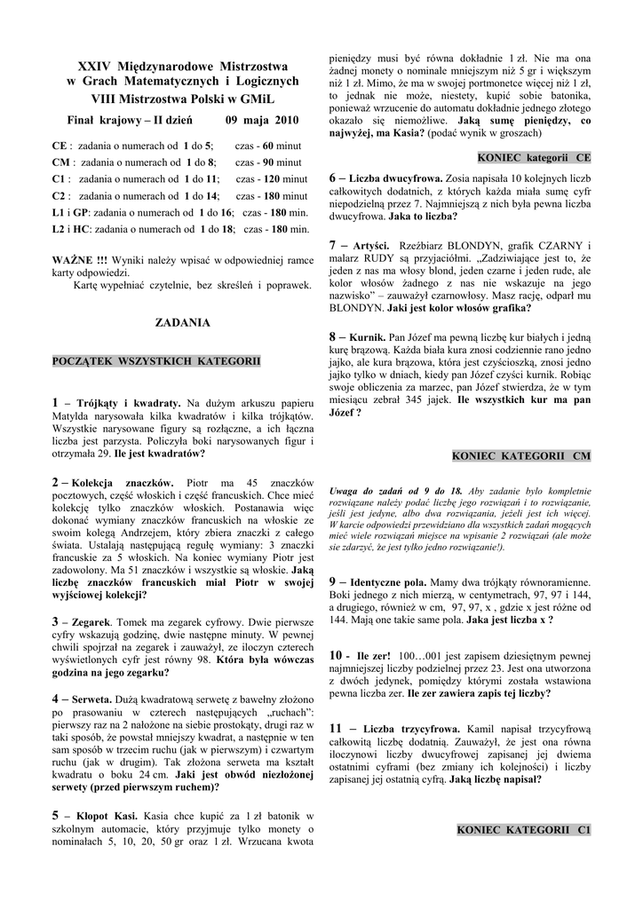 XXIV Międzynarodowe Mistrzostwa w Grach Matematycznych i Logicznych VIII Mistrzostwa Polski w GMiL Finał krajowy – II dzień 09 maja 2010 pieniędzy musi być równa dokładnie 1 zł. Nie ma ona Ŝadnej monety o nominale mniejszym niŜ 5 gr i większym niŜ 1 zł. Mimo, Ŝe ma w swojej portmonetce więcej niŜ 1 zł, to jednak nie moŜe, niestety, kupić sobie batonika, poniewaŜ wrzucenie do automatu dokładnie jednego złotego okazało się niemoŜliwe. Jaką sumę pieniędzy, co najwyŜej, ma Kasia? (podać wynik w groszach) CE : zadania o numerach od 1 do 5; czas - 60 minut CM : zadania o numerach od 1 do 8; czas - 90 minut C1 : zadania o numerach od 1 do 11; czas - 120 minut 6 – Liczba dwucyfrowa. Zosia napisała 10 kolejnych liczb C2 : zadania o numerach od 1 do 14; czas - 180 minut całkowitych dodatnich, z których kaŜda miała sumę cyfr niepodzielną przez 7. Najmniejszą z nich była pewna liczba dwucyfrowa. Jaka to liczba? L1 i GP: zadania o numerach od 1 do 16; czas - 180 min. KONIEC kategorii CE L2 i HC: zadania o numerach od 1 do 18; czas - 180 min. WAśNE !!! Wyniki naleŜy wpisać w odpowiedniej ramce karty odpowiedzi. Kartę wypełniać czytelnie, bez skreśleń i poprawek. 7 – Artyści. Rzeźbiarz BLONDYN, grafik CZARNY i malarz RUDY są przyjaciółmi. „Zadziwiające jest to, Ŝe jeden z nas ma włosy blond, jeden czarne i jeden rude, ale kolor włosów Ŝadnego z nas nie wskazuje na jego nazwisko” – zauwaŜył czarnowłosy. Masz rację, odparł mu BLONDYN. Jaki jest kolor włosów grafika? ZADANIA 8 – Kurnik. Pan Józef ma pewną liczbę kur białych i jedną POCZĄTEK WSZYSTKICH KATEGORII 1 – Trójkąty i kwadraty. Na duŜym arkuszu papieru Matylda narysowała kilka kwadratów i kilka trójkątów. Wszystkie narysowane figury są rozłączne, a ich łączna liczba jest parzysta. Policzyła boki narysowanych figur i otrzymała 29. Ile jest kwadratów? 2 – Kolekcja znaczków. Piotr ma 45 znaczków pocztowych, część włoskich i część francuskich. Chce mieć kolekcję tylko znaczków włoskich. Postanawia więc dokonać wymiany znaczków francuskich na włoskie ze swoim kolegą Andrzejem, który zbiera znaczki z całego świata. Ustalają następującą regułę wymiany: 3 znaczki francuskie za 5 włoskich. Na koniec wymiany Piotr jest zadowolony. Ma 51 znaczków i wszystkie są włoskie. Jaką liczbę znaczków francuskich miał Piotr w swojej wyjściowej kolekcji? 3 – Zegarek. Tomek ma zegarek cyfrowy. Dwie pierwsze cyfry wskazują godzinę, dwie następne minuty. W pewnej chwili spojrzał na zegarek i zauwaŜył, ze iloczyn czterech wyświetlonych cyfr jest równy 98. Która była wówczas godzina na jego zegarku? 4 – Serweta. DuŜą kwadratową serwetę z bawełny złoŜono po prasowaniu w czterech następujących „ruchach”: pierwszy raz na 2 nałoŜone na siebie prostokąty, drugi raz w taki sposób, Ŝe powstał mniejszy kwadrat, a następnie w ten sam sposób w trzecim ruchu (jak w pierwszym) i czwartym ruchu (jak w drugim). Tak złoŜona serweta ma kształt kwadratu o boku 24 cm. Jaki jest obwód niezłoŜonej serwety (przed pierwszym ruchem)? 5 – Kłopot Kasi. Kasia chce kupić za 1 zł batonik w szkolnym automacie, który przyjmuje tylko monety o nominałach 5, 10, 20, 50 gr oraz 1 zł. Wrzucana kwota kurę brązową. KaŜda biała kura znosi codziennie rano jedno jajko, ale kura brązowa, która jest czyścioszką, znosi jedno jajko tylko w dniach, kiedy pan Józef czyści kurnik. Robiąc swoje obliczenia za marzec, pan Józef stwierdza, Ŝe w tym miesiącu zebrał 345 jajek. Ile wszystkich kur ma pan Józef ? KONIEC KATEGORII CM Uwaga do zadań od 9 do 18. Aby zadanie bylo kompletnie rozwiązane naleŜy podać liczbę jego rozwiązań i to rozwiązanie, jeśli jest jedyne, albo dwa rozwiązania, jeŜeli jest ich więcej. W karcie odpowiedzi przewidziano dla wszystkich zadań mogących mieć wiele rozwiązań miejsce na wpisanie 2 rozwiązań (ale moŜe sie zdarzyć, Ŝe jest tylko jedno rozwiązanie!). 9 – Identyczne pola. Mamy dwa trójkąty równoramienne. Boki jednego z nich mierzą, w centymetrach, 97, 97 i 144, a drugiego, równieŜ w cm, 97, 97, x , gdzie x jest róŜne od 144. Mają one takie same pola. Jaka jest liczba x ? 10 - Ile zer! 100…001 jest zapisem dziesiętnym pewnej najmniejszej liczby podzielnej przez 23. Jest ona utworzona z dwóch jedynek, pomiędzy którymi została wstawiona pewna liczba zer. Ile zer zawiera zapis tej liczby? 11 – Liczba trzycyfrowa. Kamil napisał trzycyfrową całkowitą liczbę dodatnią. ZauwaŜył, Ŝe jest ona równa iloczynowi liczby dwucyfrowej zapisanej jej dwiema ostatnimi cyframi (bez zmiany ich kolejności) i liczby zapisanej jej ostatnią cyfrą. Jaką liczbę napisał? KONIEC KATEGORII C1 12 – Trzy w jednym. Począwszy od trzech liczb całkowitych dodatnich budujemy ciąg liczb, w którym kaŜdy wyraz jest sumą trzech bezpośrednio go poprzedzających liczb. Np. począwszy od 136, 9, 2 otrzymujemy ciąg 136, 9, 2, 147, 158, 307, 612, 1077, 1996, … Jak wybrać trzy pierwsze liczby całkowite a1, a2, a3, aby trzynasta liczba ciągu a1, a2, a3, … była równa 1996 ? 17 – Loteria. Zapraszamy do udziału w loterii! Prosimy napisać liczbę i za 1 zł wyciągnąć los. JeŜeli suma cyfr numeru waszego losu jest równa liczbie, którą napisaliście, to wygrywacie 10 zł. Losy mają numery od 100 do 999. Wylosowanie kaŜdego z nich jest jednakowo prawdopodobne. Jaką liczbę naleŜy napisać, aby prawdopodobieństwo wygranej 10 zł było największe i ile wynosi to prawdopodobieństwo? (podać je w postaci ułamka nieskracalnego). 13 – Błędne mnoŜenie. Uczeń ma pomnoŜyć dwie 14 – Kostka. Kostka brukowa ma kształt prostopadłościanu, którego wszystkie krawędzie mają róŜne długości wyraŜające się liczbami całkowitymi centymetrów. Pole powierzchni całkowitej tej kostki wynosi 194 cm2. Jaka jest jej objętość? 18 – Gra w tenisa. Dwana