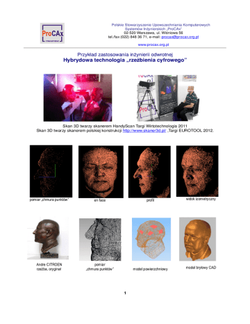 Polskie Stowarzyszenie Upowszechniania Komputerowych Systemów Inżynierskich „ProCAx” 02-520 Warszawa, ul. Wiśniowa 56 tel./fax (022) 848 36 71, e-mail: [email protected] www.procax.org.pl Przykład zastosowania inżynierii odwrotnej Hybrydowa technologia „rzeźbienia cyfrowego” Skan 3D twarzy skanerem HandyScan Targi Wirtotechnologia 2011 Skan 3D twarzy skanerem polskiej konstrukcji http://www.skaner3d.pl/ ,Targi EUROTOOL 2012. pomiar „chmura punktów” en face profil Andre CITROEN, rzeźba oryginał Andre CITROEN rzeźba, oryginał widok izometryczny model powierzchniowy pomiar „chmura punktów ” model powierzchniowy 1 model bryłowy CAD Pani Anna GĘBARSKA http://www.skaner3d.pl/ Plik *STL wykonany ze skanu 3D jej twarzy Przykłady wykonań 1) wydruk skanu 3D twarzy w naturalnej wielkości, technologa druku FDM, materiał ABS, pokrycie galwaniczne – miedź; 2) wydruk skanu 3D jw., wydruk bez wygładzenia chemicznego powierzchni, kolor ABS – czarny; 3) wydruk skanu 3D jw., wydruk po wygładzeniu powierzchni, kolor ABS – biały; Technologia inżynierii odwrotnej ma bardzo szerokie zastosowanie w budowie maszyn, medycynie, muzealnictwie, a nawet jako technologia „rzeźbienia cyfrowego” może być stosowana do przygotowania danych wejściowych do wykonywania dokładnych „rzeźb” w kamieniu przy pomocy obrabiarek CNC. 2