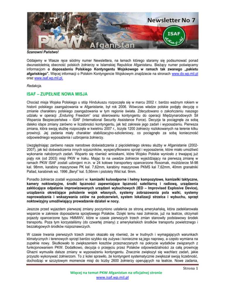 Szanowni Państwo! Oddajemy w Wasze ręce siódmy numer Newslettera, na łamach którego staramy się podsumować ponad dwunastoletnią obecność polskich żołnierzy w Islamskiej Republice Afganistanu. Bieżący numer poświęcamy informacjom o doposażeniu Polskiego Kontyngentu Wojskowego w ramach tak zwanego „pakietu afgańskiego”. Więcej informacji o Polskim Kontyngencie Wojskowym znajdziecie na stronach www.do.wp.mil.pl oraz www.isaf.wp.mil.pl. Redakcja. ISAF – ZUPEŁNIE NOWA MISJA Chociaż misja Wojska Polskiego u stóp Hindukuszu rozpoczęła się w marcu 2002 r. bardzo ważnym rokiem w historii polskiego zaangażowania w Afganistanie, był rok 2006. Wówczas władze polskie podjęły decyzję o zmianie charakteru polskiego zaangażowania w tym regionie świata. Zdecydowano o zakończeniu naszego udziału w operacji „Enduring Freedom” oraz skierowaniu kontyngentu do operacji Międzynarodowych Sił Wsparcia Bezpieczeństwa – ISAF (International Security Assistance Force). Decyzja ta pociągnęła za sobą daleko idące zmiany zarówno w liczebności kontyngentu, jak też zakresie jego zadań i wyposażeniu. Pierwsza zmiana, która swoją służbę rozpoczęła w kwietniu 2007 r., liczyła 1200 żołnierzy rozlokowanych na terenie kilku prowincji. Jej zadania miały charakter stabilizacyjno-szkoleniowy, co pociągnęło za sobą konieczność odpowiedniego wyposażenia i uzbrojenia żołnierzy. Uwzględniając zarówno nasze narodowe doświadczenia z pięcioletniego okresu służby w Afganistanie (20022007), jak też doświadczenia innych sojuszników, wyspecyfikowano sprzęt i wyposażenie, które miało umożliwić wykonanie nałożonych zadań. Wsparto się również wnioskami, które Wojsko Polskie wyniosło z trwającej już piąty rok (od 2003) misji PKW w Iraku. Mając to na uwadze żołnierze wyjeżdżający na pierwszą zmianę w ramach PKW ISAF zostali uzbrojeni m.in. w 24 kołowe transportery opancerzone Rosomak, moździerze M-98 kal. 98mm, karabiny maszynowe PK kal. 7,62mm, karabiny maszynowe PKMS kal 7,62mm, 40mm granatniki Pallad, karabinek wz. 1996 „Beryl” kal. 5,56mm i pistolety Wist kal. 9mm. Ponadto żołnierze zostali wyposażeni w: kamizelki kuloodporne i hełmy kompozytowe, kamizelki taktyczne, kamery noktowizyjne, środki łączności zapewniające łączność satelitarną i radiową, urządzenia zakłócające odpalanie improwizowanych urządzeń wybuchowych (IED – Improvised Explosive Device), urządzenia określające położenie wojsk własnych, systemy zobrazowania pola walki, systemy naprowadzania i wskazywania celów na podczerwień, system lokalizacji strzelca i wybuchu, sprzęt noktowizyjny umożliwiający prowadzenie działań w nocy. Jeszcze przed wyjazdem pierwszej zmiany poczyniono ustalenia ze stroną amerykańską, która zadeklarowała wsparcie w zakresie doposażenia sprzętowego Polaków. Dzięki temu nasi żołnierze, już na teatrze, otrzymali pojazdy opancerzone typu HMMWV, które w czasie pierwszych trzech zmian stanowiły podstawowy środek transportu. Poza tym korzystaliśmy (do czwartej zmiany) z amerykańskich środków transportu powietrznego i bezzałogowych środków rozpoznawczych. W czasie trwania pierwszych trzech zmian okazało się również, że w trudnych i wymagających warunkach klimatycznych i terenowych sprzęt bardzo szybko się zużywa i konieczne są jego naprawy, a często wymiana na zupełnie nowy. Skutkowało to zwiększeniem kosztów przeznaczanych na pokrycie wydatków związanych z funkcjonowaniem PKW. Dodatkowo, decyzja o przejęciu przez Polaków odpowiedzialności za całą prowincję Ghazni wymusiła dalsze zmiany w wyposażeniu kontyngentu. Znacznie zwiększył się wachlarz zadań, jakie przyszło wykonywać żołnierzom. To z kolei sprawiło, że kontyngent systematycznie zwiększał swoją liczebność, dochodząc w szczytowym momencie misji do liczby 2600 żołnierzy operujących na teatrze. Nowe zadania, Strona 1 Więcej na temat PKW Afganistan na oficjalnej stronie www.isaf.wp.mil.pl potrzeba zwiększenia mobilności oraz konieczność uniezależnienia się od pomocy amerykańskiej sprawiły, że w trakcie III zmiany w Afganistanie pojawiły się pierwsze polskie śmigłowce – transportowe Mi-17 i bojowe Mi-24. Pociągnęło to za sobą zmiany w strukturze organizacyjnej PKW (przemianowanego na Polskie Siły Zadaniowe – PSZ). Na tym etapie misji, m.in. na skutek rosnącej liczby ataków nieprzyjaciela z użyciem IED, zdecydowano o rezygnacji z pojazdów typu HMMWV i zastąpieniu ich kolejnymi transporterami Rosomak. W dalszej kolejności, po porozumieniu ze stroną amerykańską, Polacy otrzymali również pojazdy minoodporne typu MRAP. Wszystkie te zmiany wprowadzano w reakcji na potrzeby zgłaszane przez kolejnych dowódców kontyngentów. Niestety, na skutek obowiązywania ówczesnych regulacji prawnych, czas realizacji zakupów był na tyle długi, że zamówiony sprzęt i wyposażenie docierały na teatr działań ze znacznym opóźnieniem. „PAKIET AFGAŃSKI” Systematycznie zmieniający się charakter misji, pojawiające się straty w sprzęcie i uzbrojeniu oraz konieczność poprawy bezpieczeństwa żołnierzy wymusił kolejne zakupy sprzętu. Początkowo resort obrony narodowej dokonywał ich w ramach obowiązujących regulacji prawnych, stosowanych na co dzień w kraju. Oznaczało to m.in. stosowanie wymogu dochowywania terminów zapisanych w ustawie prawo zamówień publicznych, a tym samym odkładało w czasie dostarczenie potrzebnego wyposażenia bezpośrednio do kontyngentu. Mając to na uwadze w ministerstwie, po konsultacjach ze Sztabem Generalnym Wojska Polskiego, Dowództwem Wojsk Lądowych i Dowództwem Operacyjnym, powstał pomysł wypracowania nowych regulacji prawnych, które poprawiłyby sytuację w tym obszarze. Podjęto starania, by wyspecyfikowane w kontyngencie potrzeby ująć w ramach jednego zapisu, któremu nadano nazwę „pakiet afgański”. O