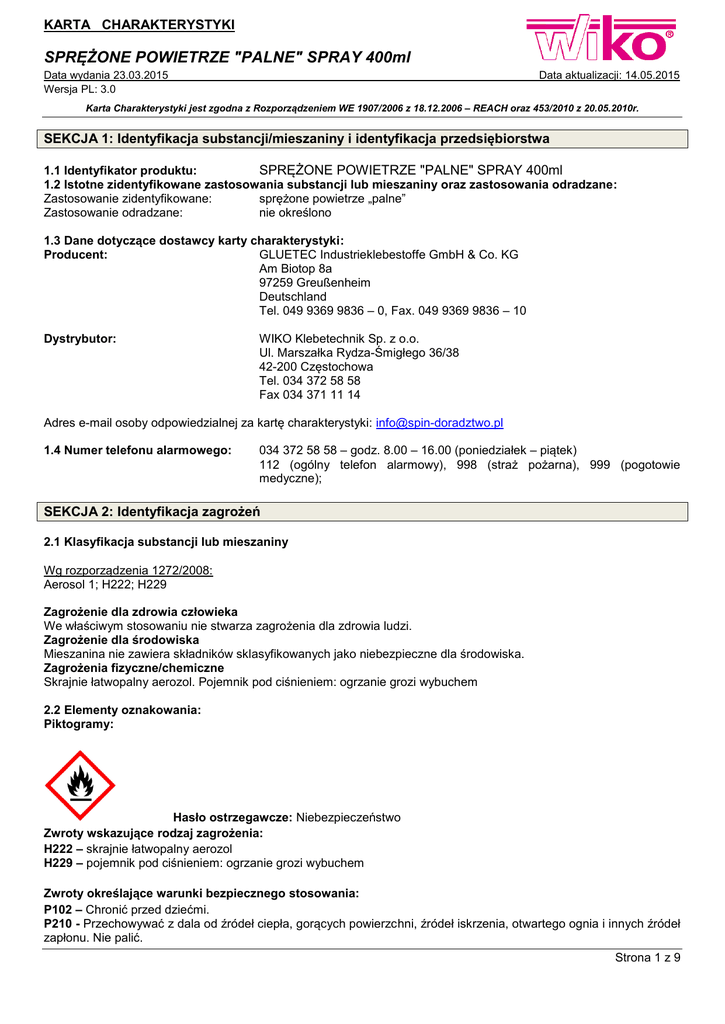 KARTA CHARAKTERYSTYKI SPRĘŻONE POWIETRZE "PALNE" SPRAY 400ml Data wydania 23.03.2015 Wersja PL: 3.0 Data aktualizacji: 14.05.2015 Karta Charakterystyki jest zgodna z Rozporządzeniem WE 1907/2006 z 18.12.2006 – REACH oraz 453/2010 z 20.05.2010r. SEKCJA 1: Identyfikacja substancji/mieszaniny i identyfikacja przedsiębiorstwa 1.1 Identyfikator produktu: SPRĘŻONE POWIETRZE "PALNE" SPRAY 400ml 1.2 Istotne zidentyfikowane zastosowania substancji lub mieszaniny oraz zastosowania odradzane: Zastosowanie zidentyfikowane: sprężone powietrze „palne” Zastosowanie odradzane: nie określono 1.3 Dane dotyczące dostawcy karty charakterystyki: Producent: GLUETEC Industrieklebestoffe GmbH & Co. KG Am Biotop 8a 97259 Greußenheim Deutschland Tel. 049 9369 9836 – 0, Fax. 049 9369 9836 – 10 Dystrybutor: WIKO Klebetechnik Sp. z o.o. Ul. Marszałka Rydza-Śmigłego 36/38 42-200 Częstochowa Tel. 034 372 58 58 Fax 034 371 11 14 Adres e-mail osoby odpowiedzialnej za kartę charakterystyki: [email protected] 1.4 Numer telefonu alarmowego: 034 372 58 58 – godz. 8.00 – 16.00 (poniedziałek – piątek) 112 (ogólny telefon alarmowy), 998 (straż pożarna), 999 (pogotowie medyczne); SEKCJA 2: Identyfikacja zagrożeń 2.1 Klasyfikacja substancji lub mieszaniny Wg rozporządzenia 1272/2008: Aerosol 1; H222; H229 Zagrożenie dla zdrowia człowieka We właściwym stosowaniu nie stwarza zagrożenia dla zdrowia ludzi. Zagrożenie dla środowiska Mieszanina nie zawiera składników sklasyfikowanych jako niebezpieczne dla środowiska. Zagrożenia fizyczne/chemiczne Skrajnie łatwopalny aerozol. Pojemnik pod ciśnieniem: ogrzanie grozi wybuchem 2.2 Elementy oznakowania: Piktogramy: Hasło ostrzegawcze: Niebezpieczeństwo Zwroty wskazujące rodzaj zagrożenia: H222 – skrajnie łatwopalny aerozol H229 – pojemnik pod ciśnieniem: ogrzanie grozi wybuchem Zwroty określające warunki bezpiecznego stosowania: P102 – Chronić przed dziećmi. P210 - Przechowywać z dala od źródeł ciepła, gorących powierzchni, źródeł iskrzenia, otwartego ognia i innych źródeł zapłonu. Nie palić. Strona 1 z 9 KARTA CHARAKTERYSTYKI SPRĘŻONE POWIETRZE "PALNE" SPRAY 400ml Data wydania 23.03.2015 Wersja PL: 3.0 Data aktualizacji: 14.05.2015 Karta Charakterystyki jest zgodna z Rozporządzeniem WE 1907/2006 z 18.12.2006 – REACH oraz 453/2010 z 20.05.2010r. P211 – Nie rozpylać nad otwartym ogniem lub innym źródłem zapłonu. P251 – Nie przekłuwać ani nie spalać, nawet po zużyciu. P261 – Unikać wdychania pyłu/ dymu/gazu/mgły/par/rozpylonej cieczy. P410+P412 – Chronić przed światłem słonecznym. Nie wystawiać na działanie temperatury przekraczającej 50°C/122°F. P501 - Zawartość/pojemnik usuwać zgodnie z krajowymi przepisami. 2.3 Inne zagrożenia: Brak dodatkowych zagrożeń Brak informacji na temat spełnienia kryteriów PBT lub vPvB zgodnie z załącznikiem XIII rozporządzenia REACH. Odpowiednie badania nie były przeprowadzone. SEKCJA 3: Skład/informacja o składnikach 3.1 Substancja: Nie dotyczy. 3.2 Mieszanina: Niebezpieczne składniki: Identyfikator produktu Zawartość % Klasyfikacja CLP Kody zwrotów Klasa zagrożenia i wskazujących kody kategorii rodzaj zagrożenia Butan CAS: 106-97-8 WE: 203-448-7 Nr indeksowy: 601-004-00-0 Nr REACH: substancja podlega przepisom okresu przejściowego 50 - 100 Flam. Gas 1 Press. Gas H220 Propan CAS: 74-98-6 WE: 200-827-9 Nr indeksowy: 601-003-00-5 Nr REACH: substancja podlega przepisom okresu przejściowego 25 - 50 Flam. Gas 1 Press. Gas H220 Izobutan CAS: 75-28-5 WE: 200-857-2 Nr indeksowy: 601-004-00-0 Nr REACH: substancja podlega przepisom okresu przejściowego 2,5 - 10 Flam. Gas 1 Press. Gas H220 Pełna treść zwrotów H w sekcji 16 SEKCJA 4: Środki pierwszej pomocy 4.1 Opis środków pierwszej pomocy W przypadku kontaktu ze skórą: Umyć zabrudzoną skórę wodą z mydłem, spłukać dokładnie wodą, w przypadku pojawienia się podrażnienia, rumieni skontaktować się z lekarzem. W przypadku kontaktu z oczami: Przepłukać oczy przez kilkanaście minut (ok. 15) dużą ilością wody, trzymając powieki szeroko rozwarte. Unikać silnego strumienia, ze względu na niebezpieczeństwo uszkodzenia rogówki, skontaktować się z lekarzem. Narażenie inhalacyjne: W razie zawrotów głowy lub nudności wyprowadzić poszkodowanego na świeże powietrze, w razie braku szybkiej poprawy zasięgnąć porady lekarza. Strona 2 z 9 KARTA CHARAKTERYSTYKI SPRĘŻONE POWIETRZE "PALNE" SPRAY 400ml Data wydania 23.03.2015 Wersja PL: 3.0 Data aktualizacji: 14.05.2015 Karta Charakterystyki jest zgodna z Rozporządzeniem WE 1907/2006 z 18.12.2006 – REACH oraz 453/2010 z 20.05.2010r. W przypadku połknięcia: Spożycie nie jest uważane za potencjalną drogę narażenia. Uwagi dla lekarzy Stosować leczenie objawowe. 4.2 Najważniejsze ostre i opóźnione objawy oraz skutki narażenia: Kontakt ze skórą: brak informacji na temat ostrych i opóźnionych objawów narażenia Kontakt z oczami: może powodować podrażnienia w przypadku bezpośredniego narażenia. Układ oddechowy: brak informacji na temat ostrych i opóźnionych objawów narażenia Przewód pokarmowy: brak informacji na temat ostrych i opóźnionych objawów narażenia 4.3 Wskazania dotyczące wszelkiej natychmiastowej pomocy lekarskiej i szczególnego postępowania z poszkodowanym: Decyzję o sposobie postępowania podejmuje lekarz po ocenie stanu poszkodowanego. SEKCJA 5: Postępowanie w przypadku pożaru 5.1 Środki gaśnicze: Odpowiednie środki gaśnicze: piana alkoholoodporna lub suche proszki gaśnicze (A, B, C), dwutlenek węgla (gaśnica śniegowa), piasek lub ziemia, mgła wodna. Stosować metody gaśnicze odpowiednie do warunków otoczenia. Niewłaściwe środki gaśnicze: Silny strumień wody. 5.2 Szczególne zagrożenia związane z substancją lub mieszaniną W trakcie pożaru, pod wpływem działania wysokich temperatur uwalniają się toksyczne produkty pirolizy – tlenki węg