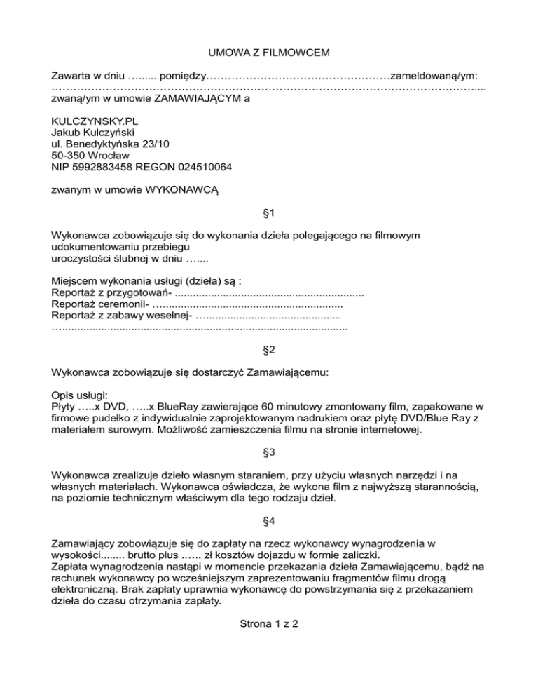 UMOWA Z FILMOWCEM Zawarta w dniu …...... pomiędzy……………………………………………zameldowaną/ym: ……………………………………………………………………………………………………….... zwaną/ym w umowie ZAMAWIAJĄCYM a KULCZYNSKY.PL Jakub Kulczyński ul. Benedyktyńska 23/10 50-350 Wrocław NIP 5992883458 REGON 024510064 zwanym w umowie WYKONAWCĄ §1 Wykonawca zobowiązuje się do wykonania dzieła polegającego na filmowym udokumentowaniu przebiegu uroczystości ślubnej w dniu ….... Miejscem wykonania usługi (dzieła) są : Reportaż z przygotowań- ............................................................... Reportaż ceremonii- …............................................................ Reportaż z zabawy weselnej- …............................................. …............................................................................................... §2 Wykonawca zobowiązuje się dostarczyć Zamawiającemu: Opis usługi: Płyty …..x DVD, …..x BlueRay zawierające 60 minutowy zmontowany film, zapakowane w firmowe pudełko z indywidualnie zaprojektowanym nadrukiem oraz płytę DVD/Blue Ray z materiałem surowym. Możliwość zamieszczenia filmu na stronie internetowej. §3 Wykonawca zrealizuje dzieło własnym staraniem, przy użyciu własnych narzędzi i na własnych materiałach. Wykonawca oświadcza, że wykona film z najwyższą starannością, na poziomie technicznym właściwym dla tego rodzaju dzieł. §4 Zamawiający zobowiązuje się do zapłaty na rzecz wykonawcy wynagrodzenia w wysokości........ brutto plus .….. zł kosztów dojazdu w formie zaliczki. Zapłata wynagrodzenia nastąpi w momencie przekazania dzieła Zamawiającemu, bądź na rachunek wykonawcy po wcześniejszym zaprezentowaniu fragmentów filmu drogą elektroniczną. Brak zapłaty uprawnia wykonawcę do powstrzymania się z przekazaniem dzieła do czasu otrzymania zapłaty. Strona 1 z 2 §5 Przekazanie filmu Zamawiającemu o których mowa w paragrafie 2 nastąpi w terminie do 60 dni od daty uroczystości. §6 Wykonawca zachowa na swój użytek, w szczególności dla celów swojej reklamy i promocji, zrealizowane materiały. Zamawiający wyraża zgodę na późniejsze wykorzystanie dzieła w materiałach reklamujących działalność wykonawcy i z tego tytułu w przyszłości nie będzie przedstawiał żadnych roszczeń finansowych. Wykorzystanie dzieła poprzez jego rozpowszechnianie w telewizji, jak również umieszczenie dzieła na stronie internetowej innej niż strona internetowa Wykonawcy wymaga uprzedniej pisemnej zgody zamawiającego. Jednocześnie wykonawca zobowiązuje się nie wykorzystywać dzieła w żadnym innym charakterze niż wspomniane w niniejszym paragrafie. §7 W razie niewykonania dzieła z przyczyn leżących po stronie Wykonawcy, Zamawiającemu przysługuje kara umowna w wysokości 50% wartości niewykonanego dzieła. W razie rezygnacji z wykonania dzieła przez Zamawiającego, Wykonawcy przysługuje kara umowna w wysokości 50% wartości niewykonanego dzieła. Kara umowa płatna jest w terminie 5 dni od wezwania do zapłaty. §8 Wszelkie zmiany niniejszej umowy wymagają zgodnego oświadczenia woli stron w formie pisemnej pod rygorem nieważności. §9 Ewentualne spory między stronami rozstrzygane będą przez sąd właściwy ze względu na miejsce zamieszkania zamawiającego. §10 Umowę sporządzono w dwóch jednobrzmiących egzemplarzach, po jednym dla każdej ze stron. ZAMAWIAJĄCY ____________________ WYKONAWCA ____________________ Strona 2 z 2