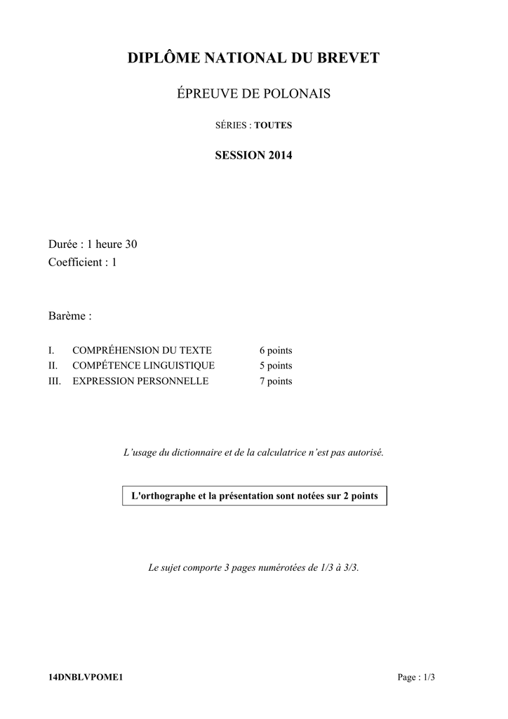 DIPLÔME NATIONAL DU BREVET ÉPREUVE DE POLONAIS SÉRIES : TOUTES SESSION 2014 Durée : 1 heure 30 Coefficient : 1 Barème : I. II. III. COMPRÉHENSION DU TEXTE COMPÉTENCE LINGUISTIQUE EXPRESSION PERSONNELLE 6 points 5 points 7 points L’usage du dictionnaire et de la calculatrice n’est pas autorisé. L'orthographe et la présentation sont notées sur 2 points Le sujet comporte 3 pages numérotées de 1/3 à 3/3. 14DNBLVPOME1 Page : 1/3 Titre Widziałam ich łodzie (…) Jestem listopadowa. Od dziecka, a właściwie od urodzin, 5 listopada przyszłam na świat i od tej pory była to dla mnie ważna data. Najpierw ważna ze względu na prezenty. Usprawiedliwiony egoizm. Rodzina zbierała się u nas w najbliżej sąsiadujący weekend i znosiła1 pięknie opakowane paczki. 5 10 Z wiekiem wolałam rodzinne spotkania od prezentów. W naszym małym dwupokojowym mieszkaniu zbierali się najukochańsi członkowie rodziny, którzy naprawdę umieli się bawić. W dużym pokoju śmiechy, tańce, a u nas, smarkatych2? Robert, Asia,Ania i ja. Z szalonymi pomysłami. Jednym z nich były artystyczne występy zespołu, który stworzyliśmy. Oczywiście pełny playback. Były też opowieści o duchach, a z duchami ja, jako najstarsza, miałam najwięcej doświadczenia. Moja osiemnastka3, przyznam, nie była szczególna. Nawet dobrze jej nie pamiętam. Za to trzydzieste urodziny przeszły do historii i wiem, że wiele osób do dziś je wspomina. Bez fałszu stwierdzam, że była to najlepsza impreza w moim życiu. Od kiedy urodziło się moje dziecko, moje urodziny nie maja żadnego znaczenia. Kayah4, Bez ograniczeń, “Pani” nr. 11, 2000 1 znosić – tu : przynosić smarkaty – niedorosły, nastolatek 3 osiemnastka – dix-huitième anniversaire 4 Kayah – chanteuse, auteur-compositeur 2 14DNBLVPOME1 Page : 2/3 TRAVAIL À FAIRE PAR LE CANDIDAT Les candidats composeront sur une copie séparée. Ne rien écrire sur le sujet. I. COMPRÉHENSION DU TEXTE : (6 points) Choisir la bonne réponse et justifier. 1. Gdy Kayah była mała, lubiła swoje urodziny, bo : a. publicznie występowała b. dostawała prezenty 2. Im Kayah była starsza, tym bardziej : a. cieszyły ją urodzinowe spotkania rodzinne b. urodziny kojarzył się jej z duchami 3. Kayah wspomina : a. wspólne zabawy dzieci i dorosłych b. zabawy dzieci w jednym, a dorosłych w drugim pokoju 4. 18 urodziny Kayah były : a. wspaniałe b. nie warto o nich pamiętać 5. 30. Urodziny Kayah były : a. historyczne i spokojne b. najlepszą imprezą w jej życiu 6. Odkąd Kayah urodziła dziecko : a. nie obchodzi swoich urodzin b. jej urodziny mają dla niej dużo mniejsze znaczenie II. COMPÉTENCE LINGUISTIQUE : (5 points) 1. Mettre le verbe souligné au masculin : (1 point) 5 listopada przyszłam na świat 2. Réécrire la phrase suivante au présent de l’indicatif : (2 points) W naszym małym dwupokojowym mieszkaniu zbierali się najukochańsi członkowie rodziny, którzy naprawdę umieli się bawić. 3. Trouver dans le texte deux superlatifs des adjectifs : (1 point) 4. Nommer le mois qui précède et qui suit le mois de novembre : (1 point) III. EXPRESSION PERSONNELLE : (7 points) Opowiedz jak wyglądałyby Twoje wymarzone urodziny (50 mots environ) 14DNBLVPOME1 Page : 3/3